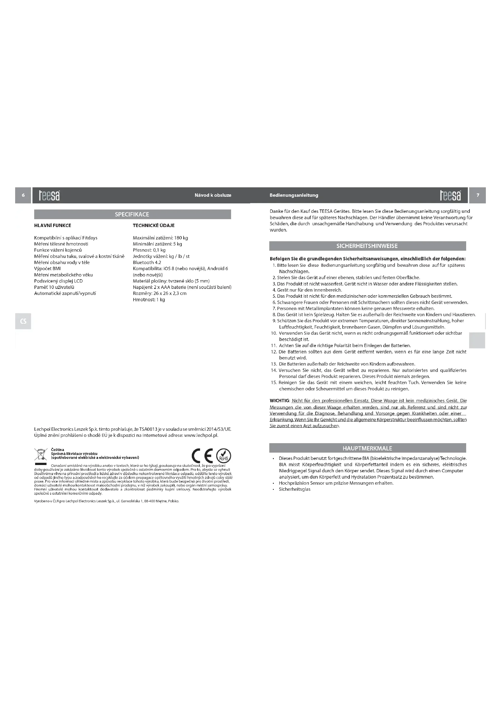 - Sicherheitsglas Lechpol Electronics Leszek Sp.k. tímto prohlašuje, že TSA0813 je v souladu se směrnicí 2014/53/UE. Úplné znění prohlášení o shodě EÚ je k dispozici na internetové adrese: www.lechpol.pl. HLAVNÍ FUNKCE Kompatibilní s aplikací Fitdays Měření tělesné hmotnosti Funkce vážení kojenců Měření obsahu tuku, svalové a kostní tkáně Měření obsahu vody v těle Výpočet BMI Měření metabolického věku Podsvícený displej LCD Paměť 10 uživatelů Automatické zapnutí/vypnutí TECHNICKÉ ÚDAJE Maximální zatížení: 180 kg Minimální zatížení: 5 kg Přesnost: 0,1 kg Jednotky vážení: kg / lb / st Bluetooth 4.2 Kompatibilita: iOS 8 (nebo novější), Android 6 (nebo novější) Materiál plošiny: tvrzené sklo (5 mm) Napájení: 2 x AAA baterie (není součástí balení) Rozměry: 26 x 26 x 2,3 cm Hmotnost: 1 kg8 9Bedienungsanleitung Bedienungsanleitung DE DE HINWEISE FEHLERBEHEBUNG BATTERIEN EINLEGEN