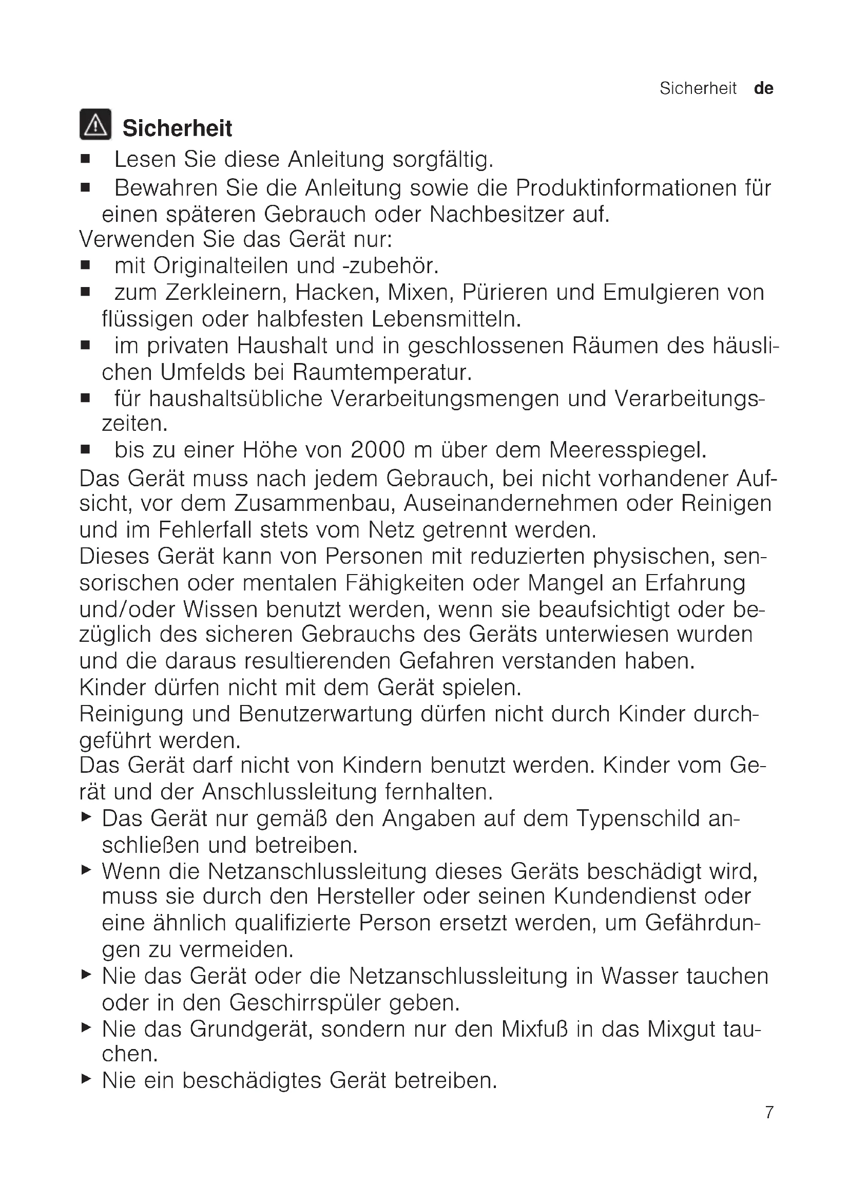 Sicherheit ¡ Lesen Sie diese Anleitung sorgfältig. ¡ Bewahren Sie die Anleitung sowie die Produktinformationen für einen späteren Gebrauch oder Nachbesitzer auf. Verwenden Sie das Gerät nur: ¡ mit Originalteilen und -zubehör. ¡ zum Zerkleinern, Hacken, Mixen, Pürieren und Emulgieren von flüssigen oder halbfesten Lebensmitteln. ¡ im privaten Haushalt und in geschlossenen Räumen des häusli- chen Umfelds bei Raumtemperatur. ¡ für haushaltsübliche Verarbeitungsmengen und Verarbeitungs- zeiten. ¡ bis zu einer Höhe von 2000m über dem Meeresspiegel. Das Gerät muss nach jedem Gebrauch, bei nicht vorhandener Auf- sicht, vor dem Zusammenbau, Auseinandernehmen oder Reinigen und im Fehlerfall stets vom Netz getrennt werden. Dieses Gerät kann von Personen mit reduzierten physischen, sen- sorischen oder mentalen Fähigkeiten oder Mangel an Erfahrung und/oder Wissen benutzt werden, wenn sie beaufsichtigt oder be- züglich des sicheren Gebrauchs des Geräts unterwiesen wurden und die daraus resultierenden Gefahren verstanden haben. Kinder dürfen nicht mit dem Gerät spielen. Reinigung und Benutzerwartung dürfen nicht durch Kinder durch- geführt werden. Das Gerät darf nicht von Kindern benutzt werden. Kinder vom Ge- rät und der Anschlussleitung fernhalten.