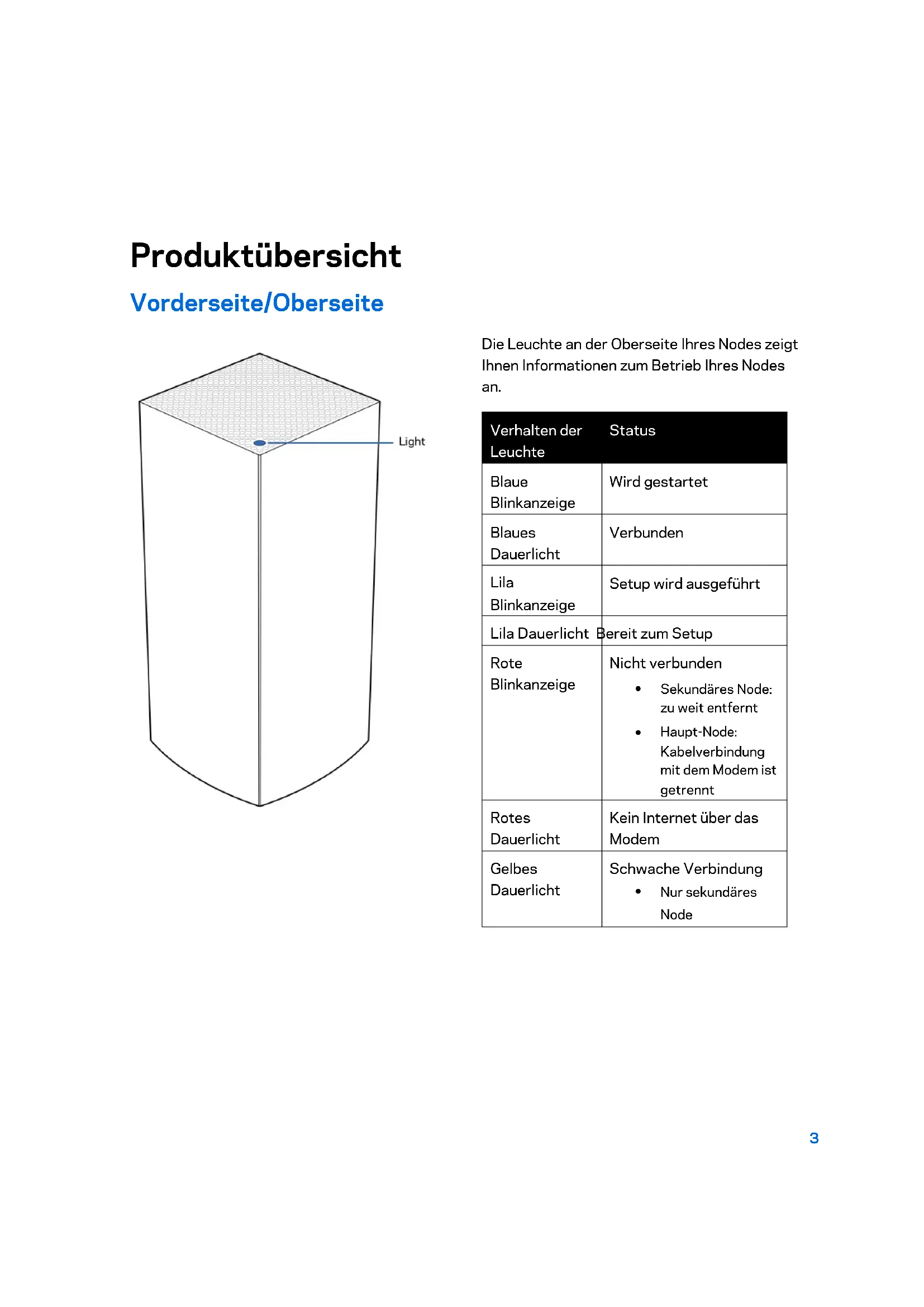 Das Velop sollte angeschlossen und eingeschaltet sein. Halten Sie dann die Reset-Taste an der Unterseite gedrückt. Die Leuchte auf der Oberseite des Nodes wird rot und wird schrittweise ausgeblendet. Lassen Sie die Taste nicht los, bevor die Leuchte ausgeht und hellrot wird.32 Technische Daten Linksys Velop Modellbezeichnung Velop AX5400 WiFi 6 System Modellnummer MX5500 Serie Switchport-Geschwindigkeit 10/100/1000 Mbit/s Funkfrequenz 2,4 GHz und 5 GHz Anzahl der Antennen 13 (intern) Anschlüsse USB 3.0, Ethernet, Internet, Strom Tasten Ein-/Aus-Schalter, WPS- und Reset-Taste Leuchte Eine mehrfarbige Leuchte zur Anzeige des Betriebs und des Status Sicherheitsfunktionen WPA2-Personal, WPA3-Personal Sicherheitsschlüssel/Bits Verschlüsselung mit bis zu 128 Bit Betriebsbedingungen Abmessungen 7,87 cm x 7,87 cm x 18,54 cm Gerätegewicht 0,95 kg Stromversorgung 12 V, 3 A Zertifizierungen FCC, IC, CE, Wi-Fi (IEEE 802.11a/b/g/n/ac, Entwurf für 802.11ax) Betriebstemperatur 0 bis 40 °C Lagertemperatur -20 bis 60 °C Relative Luftfeuchtigkeit im Betrieb 10 bis 80 % relative Feuchtigkeit, nicht kondensierend Lagerfeuchtigkeit 5 bis 90 %, nicht kondensierend Anmerkungen: Zulassungs-, Garantie- und Sicherheitsinformationen finden Sie auf Linksys.com/support/Velop. Technische Änderungen können ohne Vorankündigung vorgenommen werden.33 Maximale Leistung gemäß den Spezifikationen des IEEE-Standards 802.11. Die tatsächliche Leistung kann variieren und geringere Kapazitäten des WLAN-Netzwerks, eine geringere Datendurchsatzrate und Reichweite sowie einen geringeren Empfangsbereich einschließen. Die Leistung wird durch zahlreiche Faktoren, Bedingungen und Variablen beeinflusst. Dazu zählen die Entfernung vom Access Point, das Datenverkehrsaufkommen im Netzwerk, Baustoffe und Konstruktionsweise von Gebäuden, das verwendete Betriebssystem, die Kombination der eingesetzten WLAN-Geräte, Interferenzen und weitere ungünstige Bedingungen. Unseren preisgekrönten technischen Support finden Sie unter linksys.com/support/Velop. BELKIN, LINKSYS und zahlreiche weitere Produktbezeichnungen und Logos sind Marken des Belkin- Konzerns. Erwähnte Marken von Drittanbietern sind Eigentum ihrer jeweiligen Rechtsinhaber. © 2020 Belkin International, Inc. und ihre Tochtergesellschaften. Alle Rechte vorbehalten.1