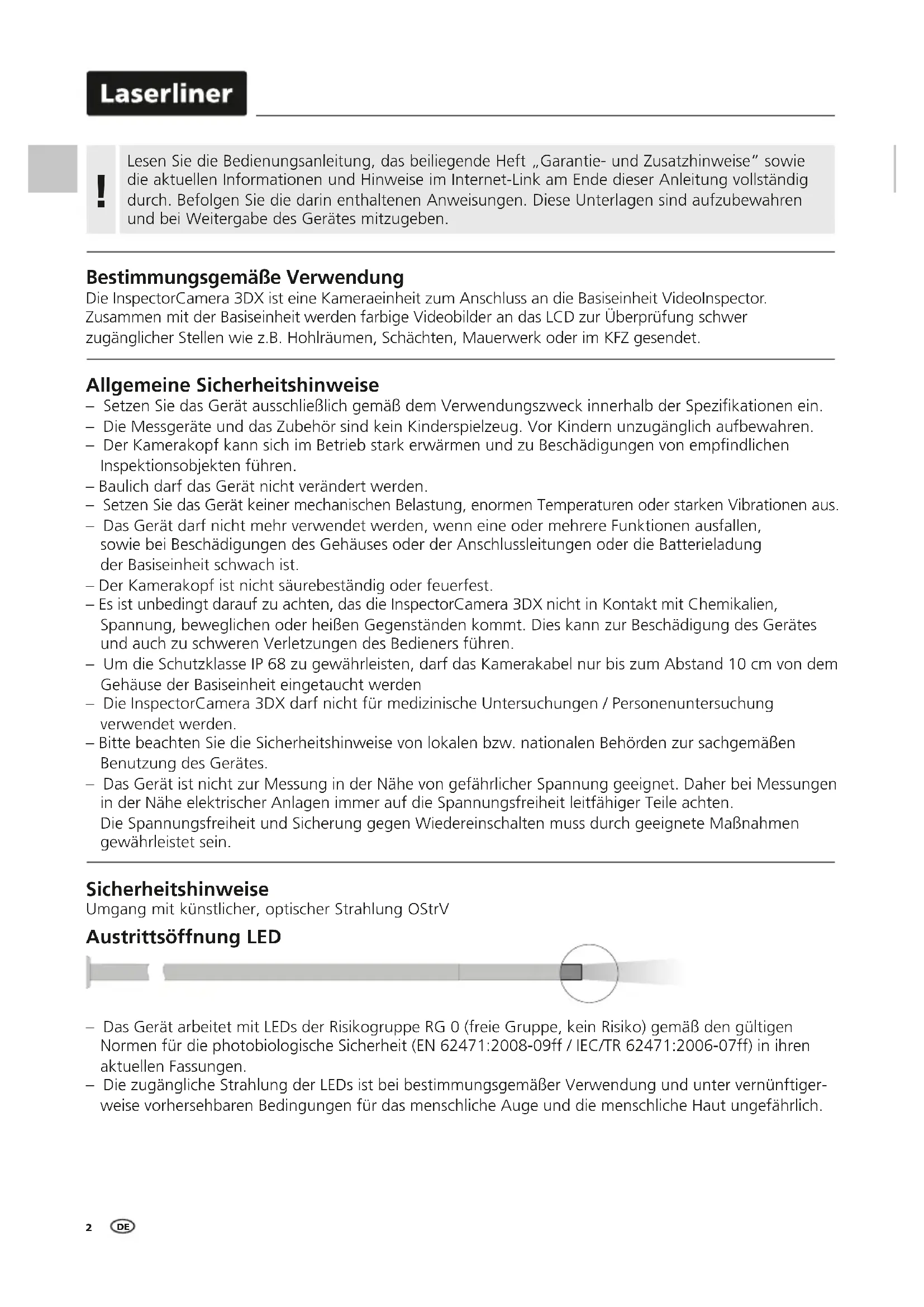 Sicherheitshinweise Umgang mit künstlicher, optischer Strahlung OStrV Austrittsöffnung LED – Das Gerät arbeitet mit LEDs der Risikogruppe RG 0 (freie Gruppe, kein Risiko) gemäß den gültigen Normen für die photobiologische Sicherheit (EN 62471:2008-09ff / IEC/TR 62471:2006-07ff) in ihren aktuellen Fassungen. – Die zugängliche Strahlung der LEDs ist bei bestimmungsgemäßer Verwendung und unter vernünftiger- weise vorhersehbaren Bedingungen für das menschliche Auge und die menschliche Haut ungefährlich. Allgemeine Sicherheitshinweise – Setzen Sie das Gerät ausschließlich gemäß dem Verwendungszweck innerhalb der Spezikationen ein. – Die Messgeräte und das Zubehör sind kein Kinderspielzeug. Vor Kindern unzugänglich aufbewahren. – Der Kamerakopf kann sich im Betrieb stark erwärmen und zu Beschädigungen von empndlichen Inspektionsobjekten führen. – Baulich darf das Gerät nicht verändert werden. – Setzen Sie das Gerät keiner mechanischen Belastung, enormen Temperaturen oder starken Vibrationen aus. – Das Gerät darf nicht mehr verwendet werden, wenn eine oder mehrere Funktionen ausfallen, sowie bei Beschädigungen des Gehäuses oder der Anschlussleitungen oder die Batterieladung der Basiseinheit schwach ist. – Der Kamerakopf ist nicht säurebeständig oder feuerfest. – Es ist unbedingt darauf zu achten, das die InspectorCamera 3DX nicht in Kontakt mit Chemikalien, Spannung, beweglichen oder heißen Gegenständen kommt. Dies kann zur Beschädigung des Gerätes und auch zu schweren Verletzungen des Bedieners führen. – Um die Schutzklasse IP 68 zu gewährleisten, darf das Kamerakabel nur bis zum Abstand 10 cm von dem Gehäuse der Basiseinheit eingetaucht werden – Die InspectorCamera 3DX darf nicht für medizinische Untersuchungen / Personenuntersuchung verwendet werden. – Bitte beachten Sie die Sicherheitshinweise von lokalen bzw. nationalen Behörden zur sachgemäßen Benutzung des Gerätes. – Das Gerät ist nicht zur Messung in der Nähe von gefährlicher Spannung geeignet. Daher bei Messungen in der Nähe elektrischer Anlagen immer auf die Spannungsfreiheit leitfähiger Teile achten. Die Spannungsfreiheit und Sicherung gegen Wiedereinschalten muss durch geeignete Maßnahmen gewährleistet sein. Bestimmungsgemäße Verwendung Die InspectorCamera 3DX ist eine Kameraeinheit zum Anschluss an die Basiseinheit VideoInspector. Zusammen mit der Basiseinheit werden farbige Videobilder an das LCD zur Überprüfung schwer zugänglicher Stellen wie z.B. Hohlräumen, Schächten, Mauerwerk oder im KFZ gesendet. DEInspectorCamera 3DX