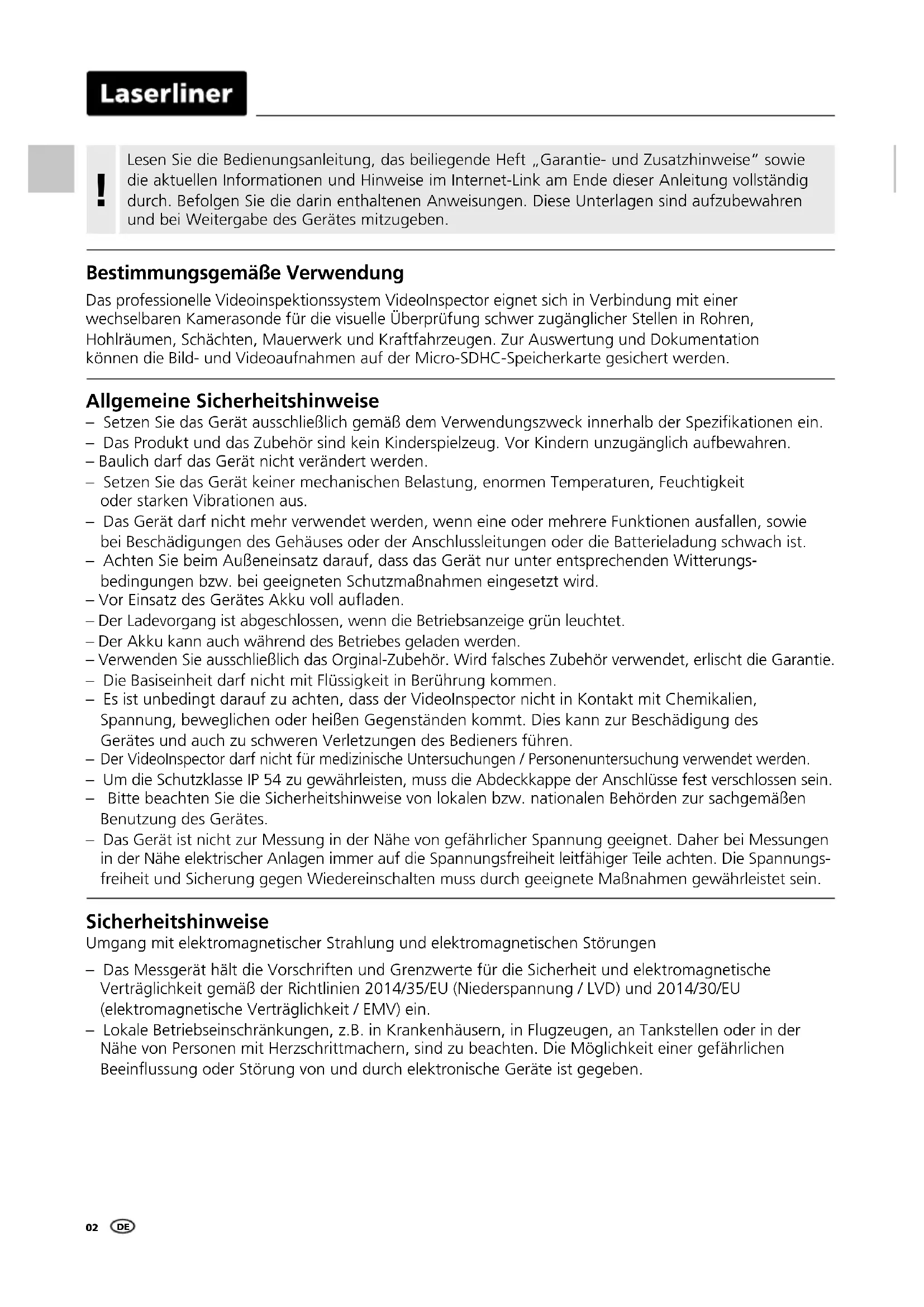 Sicherheitshinweise Umgang mit elektromagnetischer Strahlung und elektromagnetischen Störungen – Das Messgerät hält die Vorschriften und Grenzwerte für die Sicherheit und elektromagnetische Verträglichkeit gemäß der Richtlinien 2014/35/EU (Niederspannung / LVD) und 2014/30/EU (elektromagnetische Verträglichkeit / EMV) ein. – Lokale Betriebseinschränkungen, z.B. in Krankenhäusern, in Flugzeugen, an Tankstellen oder in der Nähe von Personen mit Herzschrittmachern, sind zu beachten. Die Möglichkeit einer gefährlichen Beeinussung oder Störung von und durch elektronische Geräte ist gegeben. Allgemeine Sicherheitshinweise – Setzen Sie das Gerät ausschließlich gemäß dem Verwendungszweck innerhalb der Spezikationen ein. – Das Produkt und das Zubehör sind kein Kinderspielzeug. Vor Kindern unzugänglich aufbewahren. – Baulich darf das Gerät nicht verändert werden. – Setzen Sie das Gerät keiner mechanischen Belastung, enormen Temperaturen, Feuchtigkeit oder starken Vibrationen aus. – Das Gerät darf nicht mehr verwendet werden, wenn eine oder mehrere Funktionen ausfallen, sowie bei Beschädigungen des Gehäuses oder der Anschlussleitungen oder die Batterieladung schwach ist. – Achten Sie beim Außeneinsatz darauf, dass das Gerät nur unter entsprechenden Witterungs- bedingungen bzw. bei geeigneten Schutzmaßnahmen eingesetzt wird. – Vor Einsatz des Gerätes Akku voll auaden. – Der Ladevorgang ist abgeschlossen, wenn die Betriebsanzeige grün leuchtet. – Der Akku kann auch während des Betriebes geladen werden. – Verwenden Sie ausschließlich das Orginal-Zubehör. Wird falsches Zubehör verwendet, erlischt die Garantie. – Die Basiseinheit darf nicht mit Flüssigkeit in Berührung kommen. – Es ist unbedingt darauf zu achten, dass der VideoInspector nicht in Kontakt mit Chemikalien, Spannung, beweglichen oder heißen Gegenständen kommt. Dies kann zur Beschädigung des Gerätes und auch zu schweren Verletzungen des Bedieners führen.