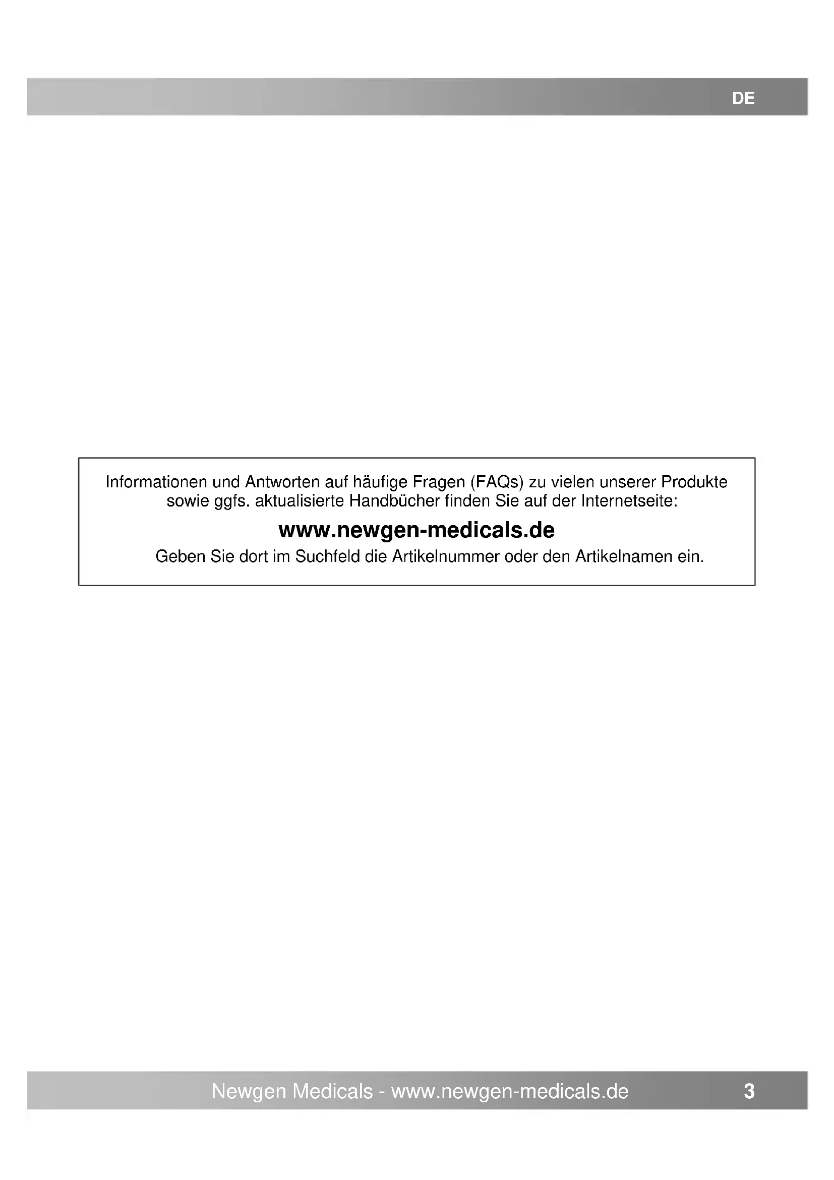 - Entladen Sie den Akku nie vollständig, dies verkürzt seine Lebenszeit.DE Newgen Medicals - www.newgen-medicals.de 7 Wichtige Hinweise zur Entsorgung Dieses Elektrogerät gehört nicht in den Hausmüll. Für die fachgerechte Entsorgung wen- den Sie sich bitte an die öffentlichen Sammelstellen in Ihrer Gemeinde. Einzelheiten zum Standort einer solchen Sammelstelle und über ggf. vorhandene Mengenbeschränkungen pro Tag / Monat / Jahr entnehmen Sie bitte den Informationen der jeweiligen Gemeinde.