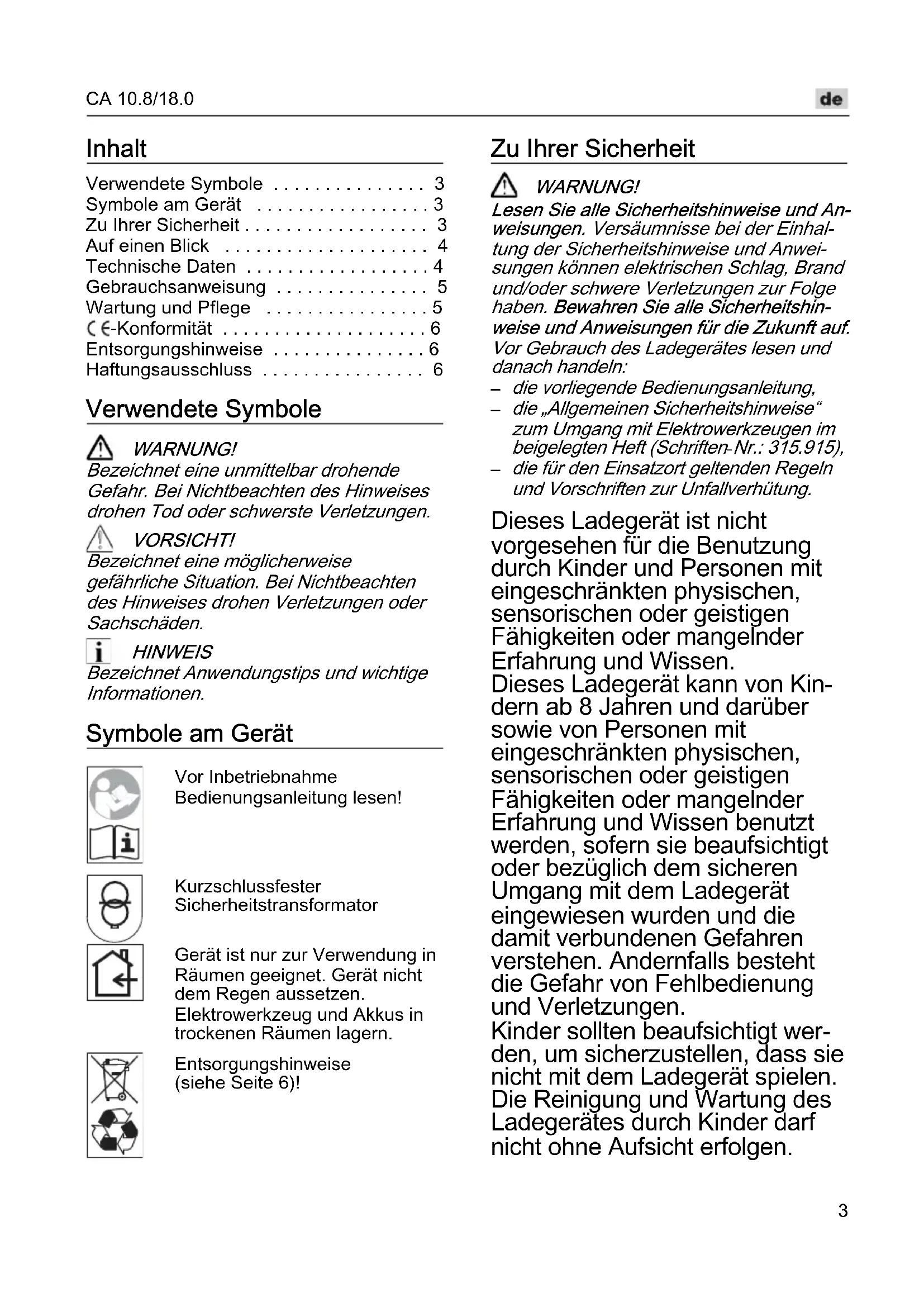 die für den Einsatzort geltenden Regeln und Vorschriften zur Unfallverhütung. Dieses Ladegerät ist nicht vorgesehen für die Benutzung durch Kinder und Personen mit eingeschränkten physischen, sensorischen oder geistigen Fähigkeiten oder mangelnder Erfahrung und Wissen. Dieses Ladegerät kann von Kin- dern ab 8 Jahren und darüber sowie von Personen mit eingeschränkten physischen, sensorischen oder geistigen Fähigkeiten oder mangelnder Erfahrung und Wissen benutzt werden, sofern sie beaufsichtigt oder bezüglich dem sicheren Umgang mit dem Ladegerät eingewiesen wurden und die damit verbundenen Gefahren verstehen. Andernfalls besteht die Gefahr von Fehlbedienung und Verletzungen. Kinder sollten beaufsichtigt wer- den, um sicherzustellen, dass sie nicht mit dem Ladegerät spielen. Die Reinigung und Wartung des Ladegerätes durch Kinder darf nicht ohne Aufsicht erfolgen.CA 10.8/18.0