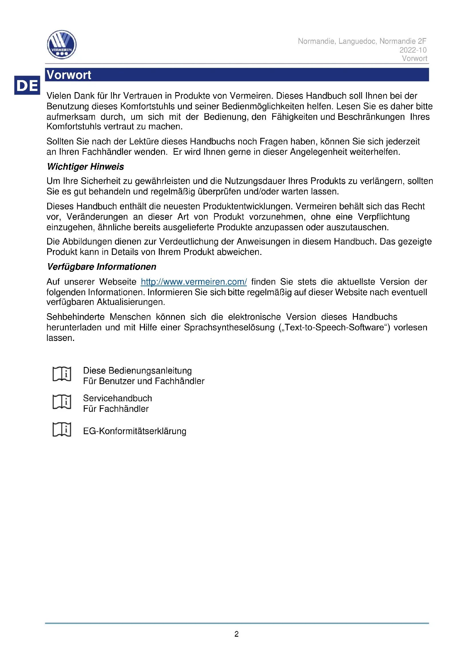 Vorwort Vielen Dank für Ihr Vertrauen in Produkte von Vermeiren. Dieses Handbuch soll Ihnen bei der Benutzung dieses Komfortstuhls und seiner Bedienmöglichkeiten helfen. Lesen Sie es daher bitte aufmerksam durch, um sich mit der Bedienung, den Fähigkeiten und Beschränkungen Ihres Komfortstuhls vertraut zu machen. Sollten Sie nach der Lektüre dieses Handbuchs noch Fragen haben, können Sie sich jederzeit an Ihren Fachhändler wenden. Er wird Ihnen gerne in dieser Angelegenheit weiterhelfen. Wichtiger Hinweis Um Ihre Sicherheit zu gewährleisten und die Nutzungsdauer Ihres Produkts zu verlängern, sollten Sie es gut behandeln und regelmäßig überprüfen und/oder warten lassen. Dieses Handbuch enthält die neuesten Produktentwicklungen. Vermeiren behält sich das Recht vor, Veränderungen an dieser Art von Produkt vorzunehmen, ohne eine Verpflichtung einzugehen, ähnliche bereits ausgelieferte Produkte anzupassen oder auszutauschen. Die Abbildungen dienen zur Verdeutlichung der Anweisungen in diesem Handbuch. Das gezeigte Produkt kann in Details von Ihrem Produkt abweichen. Verfügbare Informationen Auf unserer Webseite http://www.vermeiren.com/ finden Sie stets die aktuellste Version der folgenden Informationen. Informieren Sie sich bitte regelmäßig auf dieser Website nach eventuell verfügbaren Aktualisierungen. Sehbehinderte Menschen können sich die elektronische Version dieses Handbuchs herunterladen und mit Hilfe einer Sprachsyntheselösung („Text-to-Speech-Software“) vorlesen lassen.