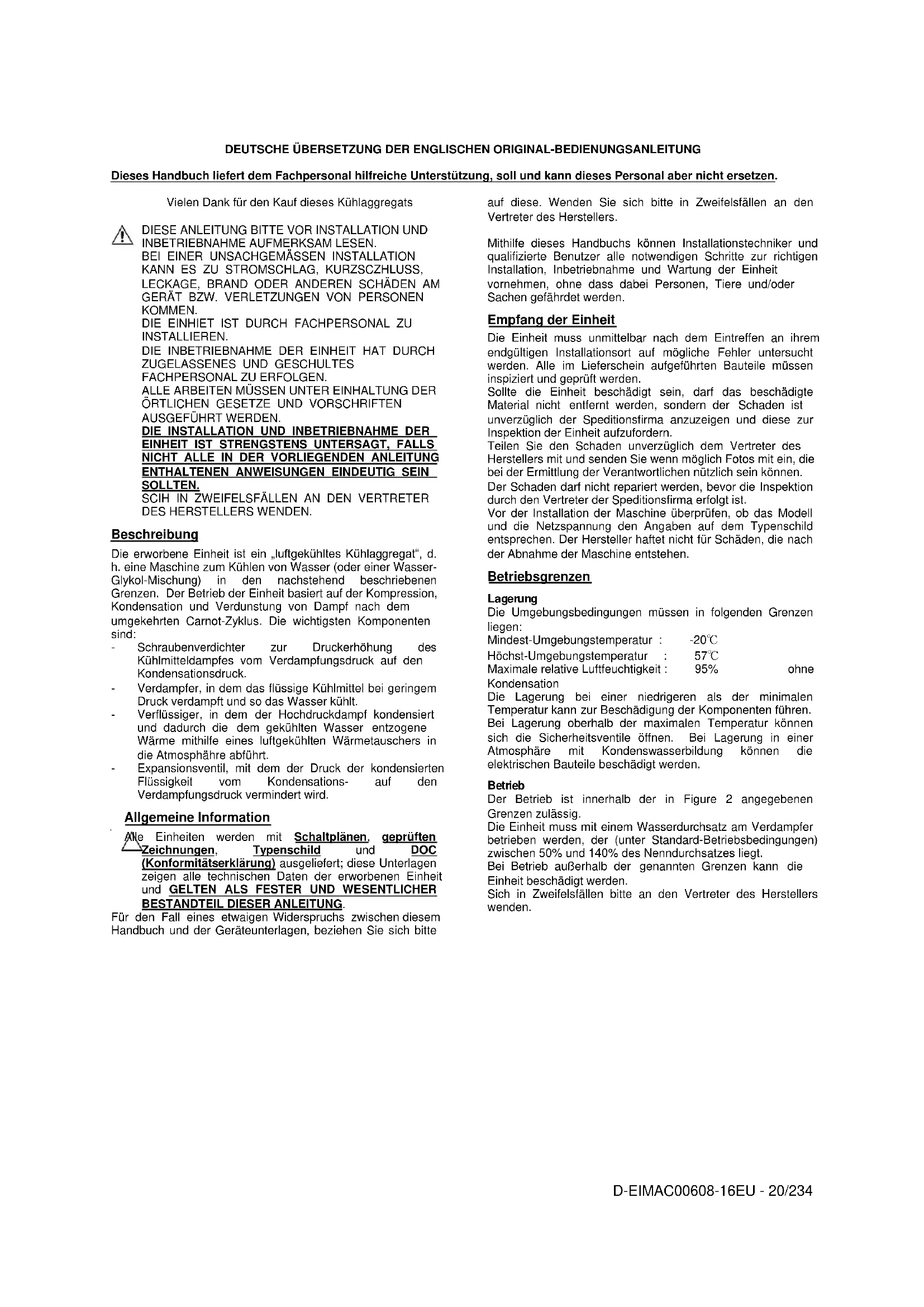 SOLLTEN. SCIH IN ZWEIFELSFÄLLEN AN DEN VERTRETER DES HERSTELLERS WENDEN. Beschreibung Die erworbene Einheit ist ein „luftgekühltes Kühlaggregat“, d. h. eine Maschine zum Kühlen von Wasser (oder einer Wasser- Glykol-Mischung) in den nachstehend beschriebenen Grenzen. Der Betrieb der Einheit basiert auf der Kompression, Kondensation und Verdunstung von Dampf nach dem umgekehrten Carnot-Zyklus. Die wichtigsten Komponenten sind: - Schraubenverdichter zur Druckerhöhung des Kühlmitteldampfes vom Verdampfungsdruck auf den Kondensationsdruck. - Verdampfer, in dem das flüssige Kühlmittel bei geringem Druck verdampft und so das Wasser kühlt. - Verflüssiger, in dem der Hochdruckdampf kondensiert und dadurch die dem gekühlten Wasser entzogene Wärme mithilfe eines luftgekühlten Wärmetauschers in die Atmosphähre abführt. - Expansionsventil, mit dem der Druck der kondensierten Flüssigkeit vom Kondensations- auf den Verdampfungsdruck vermindert wird. Allgemeine Information Alle Einheiten werden mit Schaltplänen, geprüften Zeichnungen, Typenschild und DOC (Konformitätserklärung) ausgeliefert; diese Unterlagen zeigen alle technischen Daten der erworbenen Einheit und GELTEN ALS FESTER UND WESENTLICHER BESTANDTEIL DIESER ANLEITUNG. Für den Fall eines etwaigen Widerspruchs zwischen diesem Handbuch und der Geräteunterlagen, beziehen Sie sich bitte auf diese. Wenden Sie sich bitte in Zweifelsfällen an den Vertreter des Herstellers. Mithilfe dieses Handbuchs können Installationstechniker und qualifizierte Benutzer alle notwendigen Schritte zur richtigen Installation, Inbetriebnahme und Wartung der Einheit vornehmen, ohne dass dabei Personen, Tiere und/oder Sachen gefährdet werden. Empfang der Einheit Die Einheit muss unmittelbar nach dem Eintreffen an ihrem endgültigen Installationsort auf mögliche Fehler untersucht werden. Alle im Lieferschein aufgeführten Bauteile müssen inspiziert und geprüft werden. Sollte die Einheit beschädigt sein, darf das beschädigte Material nicht entfernt werden, sondern der Schaden ist unverzüglich der Speditionsfirma anzuzeigen und diese zur Inspektion der Einheit aufzufordern. Teilen Sie den Schaden unverzüglich dem Vertreter des Herstellers mit und senden Sie wenn möglich Fotos mit ein, die bei der Ermittlung der Verantwortlichen nützlich sein können. Der Schaden darf nicht repariert werden, bevor die Inspektion durch den Vertreter der Speditionsfirma erfolgt ist. Vor der Installation der Maschine überprüfen, ob das Modell und die Netzspannung den Angaben auf dem Typenschild entsprechen. Der Hersteller haftet nicht für Schäden, die nach der Abnahme der Maschine entstehen. Betriebsgrenzen Lagerung Die Umgebungsbedingungen müssen in folgenden Grenzen liegen: Mindest-Umgebungstemperatur : -20℃ Höchst-Umgebungstemperatur : 57℃ Maximale relative Luftfeuchtigkeit : 95% ohne Kondensation Die Lagerung bei einer niedrigeren als der minimalen Temperatur kann zur Beschädigung der Komponenten führen. Bei Lagerung oberhalb der maximalen Temperatur können sich die Sicherheitsventile öffnen. Bei Lagerung in einer Atmosphäre mit Kondenswasserbildung können die elektrischen Bauteile beschädigt werden. Betrieb Der Betrieb ist innerhalb der in Figure 2 angegebenen Grenzen zulässig. Die Einheit muss mit einem Wasserdurchsatz am Verdampfer betrieben werden, der (unter Standard-Betriebsbedingungen) zwischen 50% und 140% des Nenndurchsatzes liegt. Bei Betrieb außerhalb der genannten Grenzen kann die Einheit beschädigt werden. Sich in Zweifelsfällen bitte an den Vertreter des Herstellers wenden.D-EIMAC00608-16EU - 21/234 Abbildung 1 - Beschreibung der auf der Schalttafel angebrachten Etiketten (Der Schaltschrank kann aus zwei verschiedenen Höhen werden)