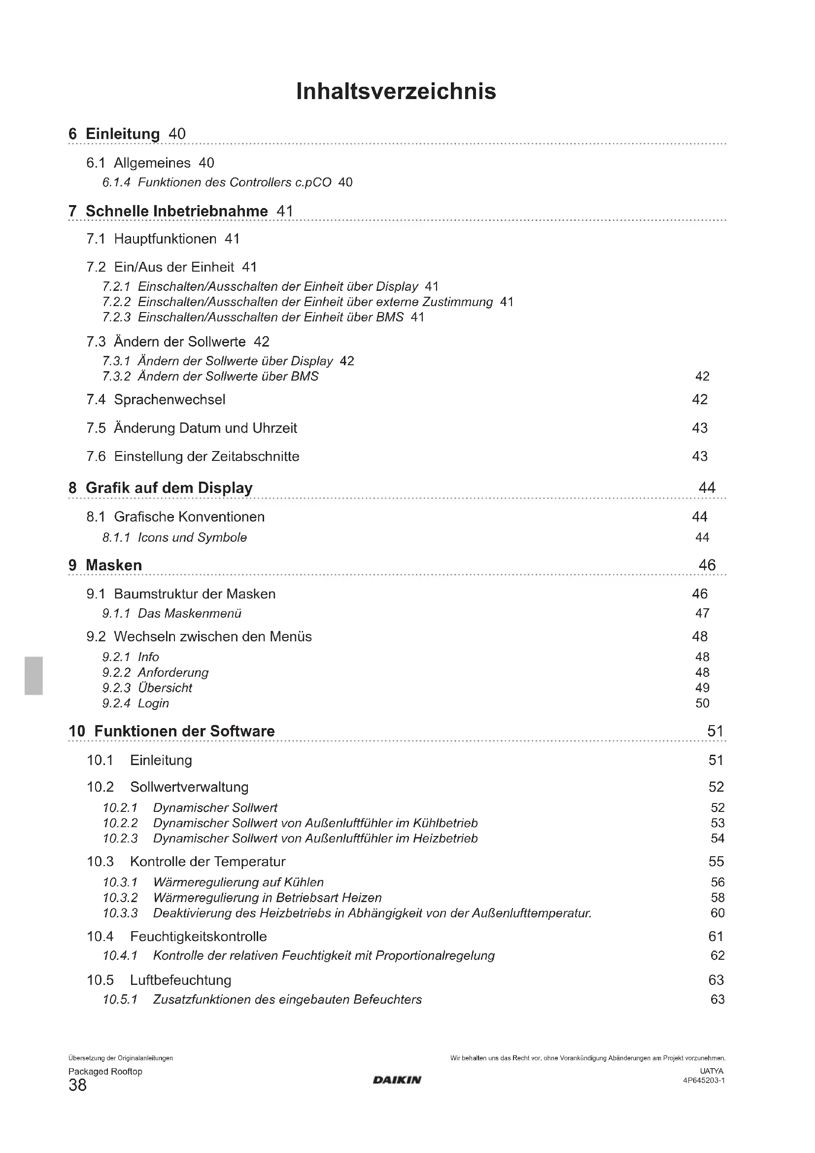 Zur Verwaltung der Einheiten ist eine spezielle Software in den Controller geladen. Die Software besteht aus verschiedenen Funktionen, die den Bedingungen gewidmet sind, unter denen die Einheiten arbeiten müssen. In den folgenden Kapiteln sind alle von der Software verwalteten Funktionen beschrieben, und zwar von den gemeinsamen Funktionen, die bei allen Einheiten vorhanden sind, bis hin zu den spezischen Ausführungen oder Modellen gewidmeten Funktionen. Bestimmte hier beschriebene Funktionen sind eventuell nur bei spezischen Versionen oder Größen oder in Abhängigkeit von dem ausgewählten Zubehör verfügbar. Bei der Beschreibung der verschiedenen Funktionen wird davon ausgegangen, dass der Anwender mit der Funktionsweise der Einheiten vertraut ist und Kenntnisse über die entsprechenden Wasser- oder Kältekreisläufe besitzt. Alle aufgeführten Beschreibungen, Einstellungen und Parameter beziehen sich auf eine korrekt gemäß den Anleitungen in den entsprechenden Unterlagen installierte Einheit.Übersetzung der OriginalanleitungenPackaged Rooftop Wir behalten uns das Recht vor, ohne Vorankündigung Abänderungen am Projekt vorzunehmen.UATYA4P645203-1