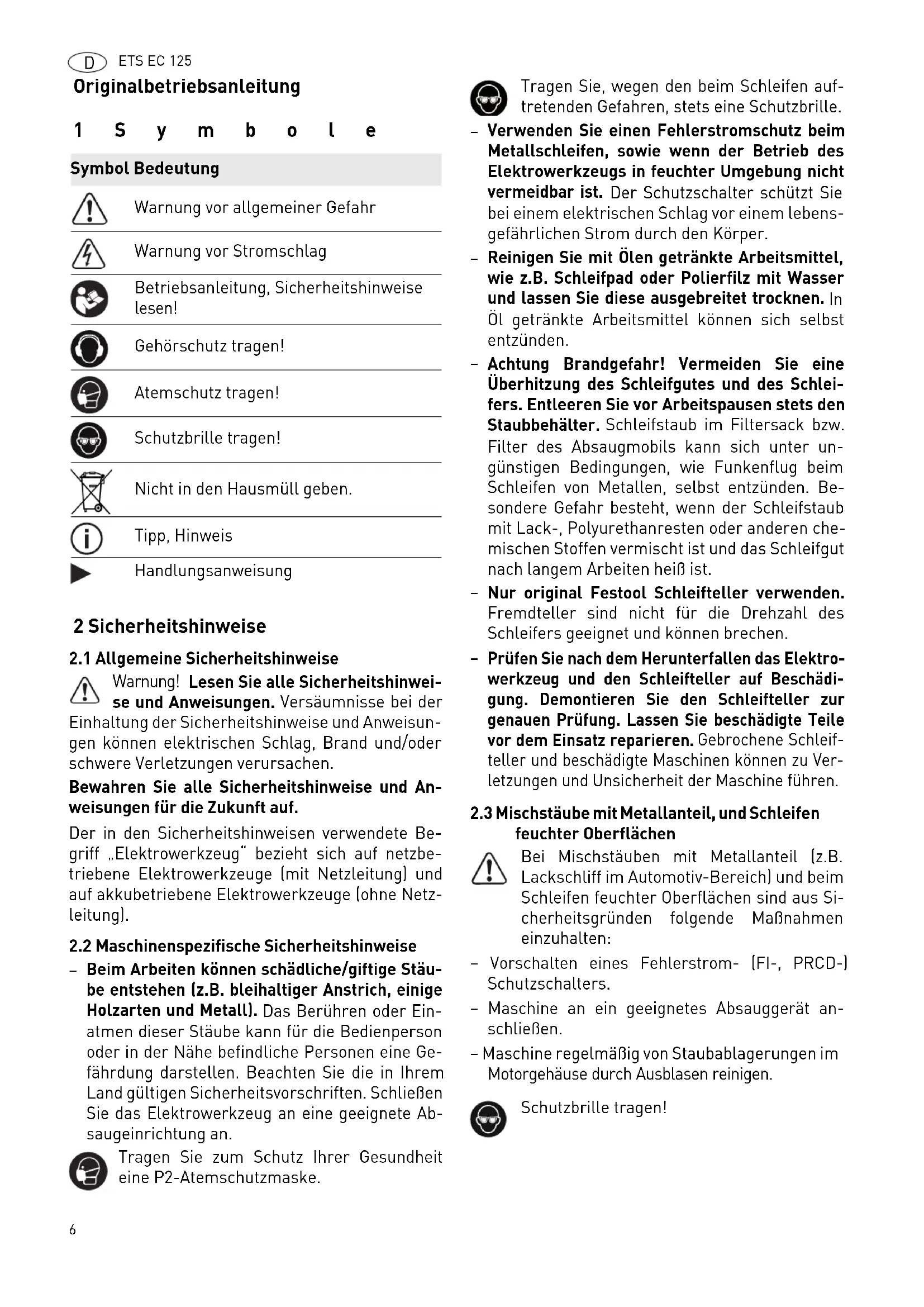 feuchter Oberflächen Bei Mischstäuben mit Metallanteil (z.B. Lackschliff im Automotiv-Bereich) und beim Schleifen feuchter Oberflächen sind aus Si- cherheitsgründen folgende Maßnahmen einzuhalten: – Vorschalten eines Fehlerstrom- (FI-, PRCD-) Schutzschalters. – Maschine an ein geeignetes Absauggerät an- schließen. – Maschine regelmäßig von Staubablagerungen im Motorgehäuse durch Ausblasen reinigen. Symbol Bedeutung Warnung vor allgemeiner Gefahr Warnung vor Stromschlag Betriebsanleitung, Sicherheitshinweise lesen! Gehörschutz tragen! Atemschutz tragen! Schutzbrille tragen! Nicht in den Hausmüll geben. Tipp, Hinweis Handlungsanweisung Schutzbrille tragen!ETS EC 125