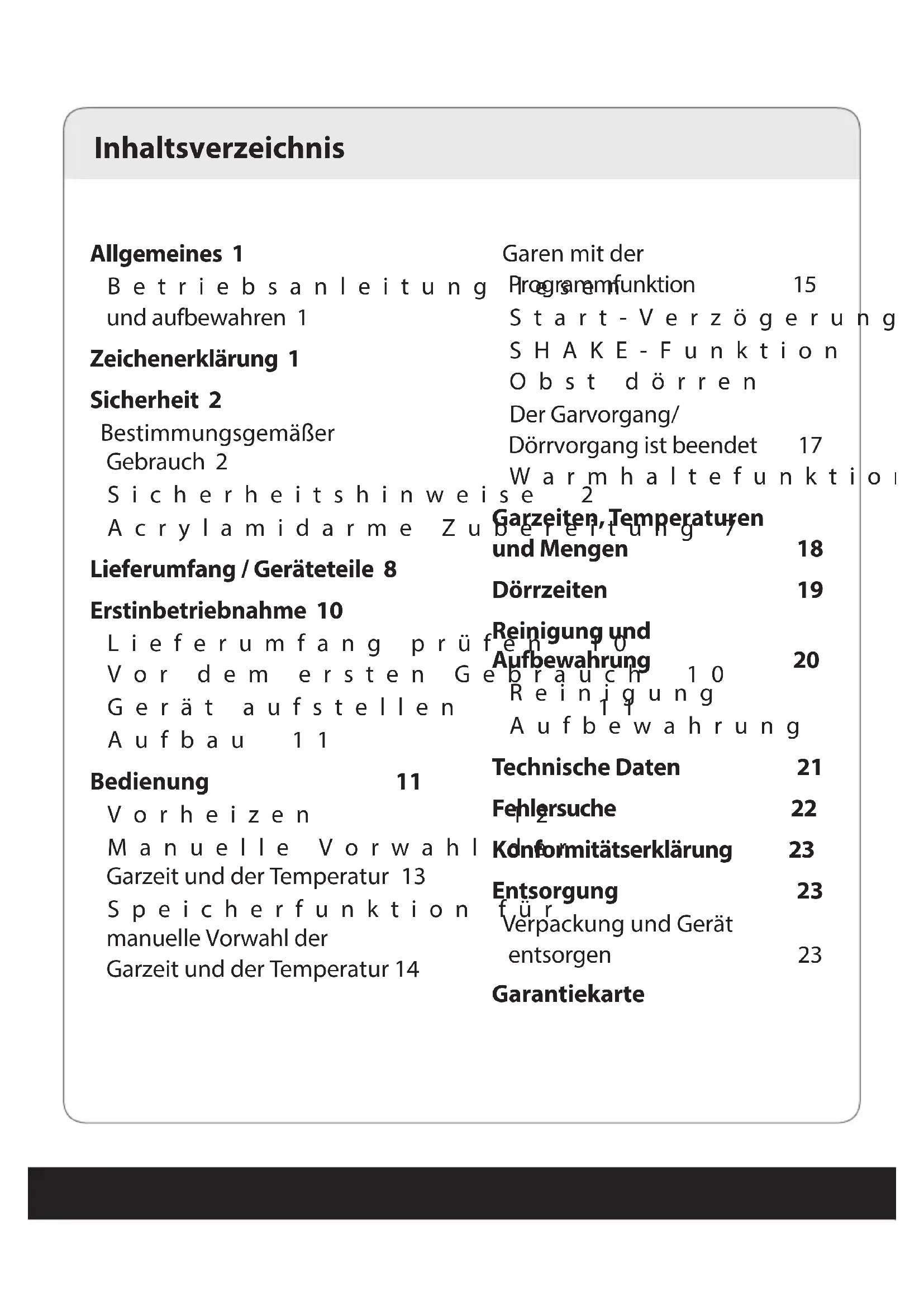 durch Kassenbeleg). Schäden, die auf normalen Verschleiß, übermäßige Belastung oder unsachgemäße Nutzung zurückzuführen sind, sind von der Garantie ausgeschlossen. Wenden Sie sich bei einer Reklamation bitte zuerst telefonisch an unsere Service-Hotline: +32 (0) 3 707 14 49 Dort wird man Sie gern über die weiteren Abläufe informieren.Senden Sie bitte den gekauften Artikel NIE unaufgefordert an uns!Heben Sie den Kassenbeleg als Nachweis für den Kauf gut auf.Diese Garantie deckt keine Schäden ab, die durch einen Störfall, durch unsachgemäße Nutzung und/oder durch Höhere Gewalt entstanden sind.Wenn ein Garantiefall vorliegt, wenden Sie sich bitte an unsere Service-Hotline:Globaltronics Service Centerc/o teknihall Benelux bvba, Brusselstraat 33, 2321 Meer, BELGIEN Der Anspruch auf Garantie erlischt, wenn sich zeigt, dass Unbefugte Abänderungen an diesem Gerät vorgenommen haben. Wenn das Gerät an unseren Kundendienst gesendet wird, achten Sie bitte auf eine geeignete Verpackung. Für etwaige Transportschäden sind wir nicht haftbar. PO51033206 46/2025Généralités 27 Lire le mode d’emploi et le conserver 27 Explication des symboles 27 Sécurité 28 Usage conforme du produit 28 Consignes de sécurité 28 Préparation pauvre en acrylamide 33 Contenu de l’emballage / éléments de l’appareil 34 Première mise en service 36 Véri er le contenu de l’emballage 36 Avant la première utilisation 36 Installer l’appareil 37 Montage 37 Utilisation 37 Préchau age 38 Présélection manuelle du temps de cuisson et de la température 39 Fonction mémoire pour la présélection manuelle du temps de cuisson et de la température 40 Cuisson avec la fonction programmation 41 Fonction de départ di éré 41 Fonction SHAKE 42 Déshydratation des fruits 42 Fin de cuisson/ de déshydratation 43 Fonction de maintien au chaud 44 Temps de cuisson, températures et quantités 44 Durées de déshydratation 45 Nettoyage et stockage 46 Nettoyage 46 Stockage 46 Caractéristiques techniques 47 Dépannage 48 Déclaration de conformité 49 Recyclage 49 Recycler l’emballage 49 Recycler l’appareil hors d’usage 49 Carte de garantie Sommaire27