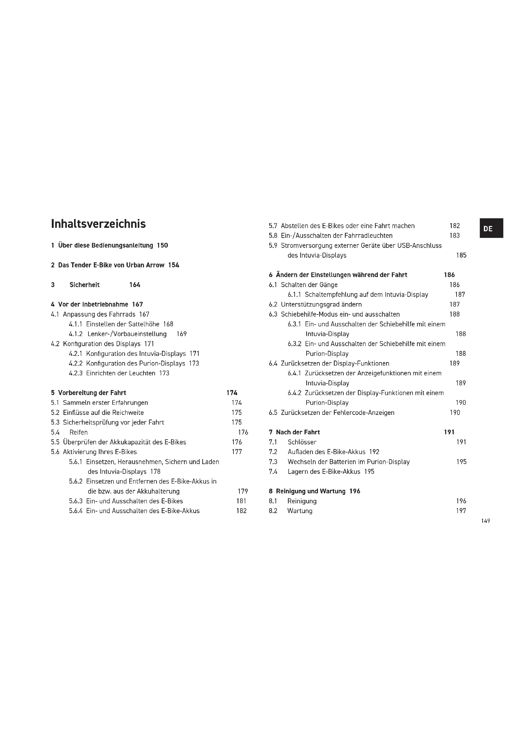 Inhaltsverzeichnis 1 Über diese Bedienungsanleitung 150 2 Das Tender E-Bike von Urban Arrow 154 3 Sicherheit 164 4 Vor der Inbetriebnahme 167