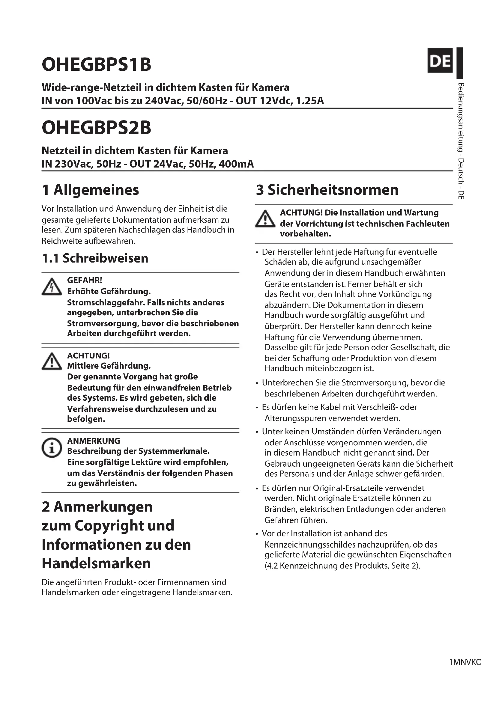 Bezeichnung des Produktes OHEGBPS1B: Wide-range-Netzteil in dichtem Kasten für Kamera. Für die Gehäuse VERSO, VERSO POLAR, HEG, HTG. IN von 100Vac bis zu 240Vac, 50/60Hz -OUT 12Vdc, 1.25A. OHEGBPS2B: Netzteil in dichtem Kasten für Kamera. Für die Gehäuse VERSO, VERSO POLAR, HEG, HTG. IN 230Vac, 50Hz - OUT 24Vac, 50Hz, 400mA.