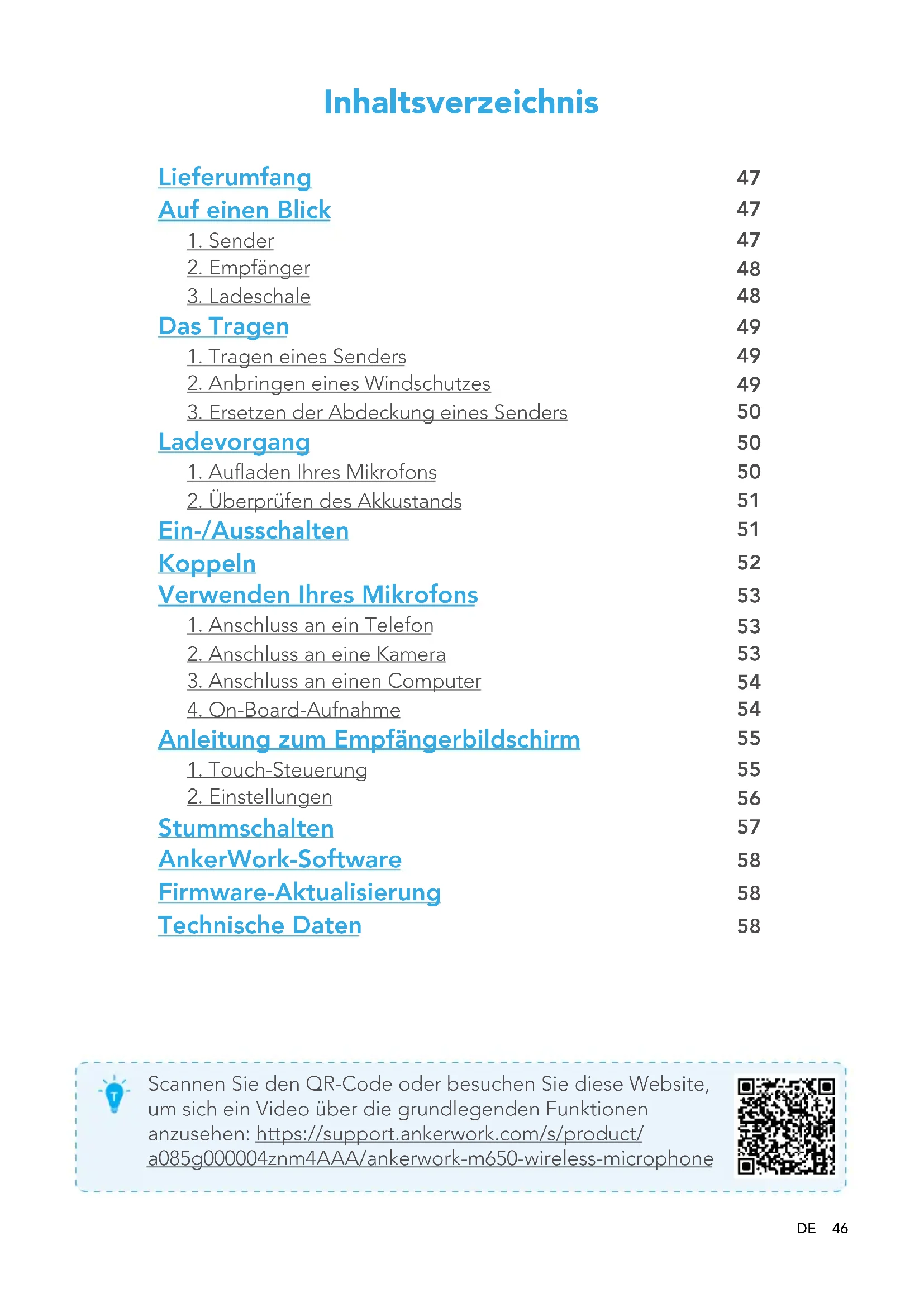 Stummschalten AnkerWork-Software Firmware-Aktualisierung Technische Daten Scannen Sie den QR-Code oder besuchen Sie diese Website, um sich ein Video über die grundlegenden Funktionen anzusehen: https://support.ankerwork.com/s/product/ a085g000004znm4AAA/ankerwork-m650-wireless-microphone Inhaltsverzeichnis