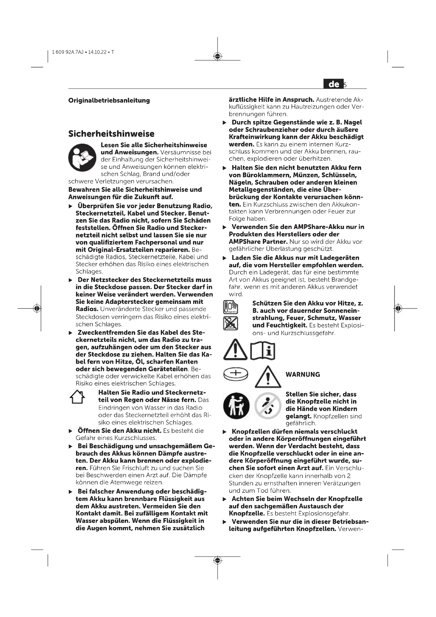 1 609 92A 7AJ • 14.10.22 • TOriginalbetriebsanleitung SicherheitshinweiseDeutsch Lesen Sie alle Sicherheitshinweise und Anweisungen. Versäumnisse bei der Einhaltung der Sicherheitshinwei- se und Anweisungen können elektri- schen Schlag, Brand und/oder schwere Verletzungen verursachen. Bewahren Sie alle Sicherheitshinweise und Anweisungen für die Zukunft auf. u Überprüfen Sie vor jeder Benutzung Radio, Steckernetzteil, Kabel und Stecker. Benut- zen Sie das Radio nicht, sofern Sie Schäden feststellen. Öffnen Sie Radio und Stecker- netzteil nicht selbst und lassen Sie sie nur von qualifiziertem Fachpersonal und nur mit Original-Ersatzteilen reparieren. Be- schädigte Radios, Steckernetzteile, Kabel und Stecker erhöhen das Risiko eines elektrischen Schlages. u Der Netzstecker des Steckernetzteils muss in die Steckdose passen. Der Stecker darf in keiner Weise verändert werden. Verwenden Sie keine Adapterstecker gemeinsam mit Radios. Unveränderte Stecker und passende Steckdosen verringern das Risiko eines elektri- schen Schlages. u Zweckentfremden Sie das Kabel des Ste- ckernetzteils nicht, um das Radio zu tra- gen, aufzuhängen oder um den Stecker aus der Steckdose zu ziehen. Halten Sie das Ka- bel fern von Hitze, Öl, scharfen Kanten oder sich bewegenden Geräteteilen. Be- schädigte oder verwickelte Kabel erhöhen das Risiko eines elektrischen Schlages. Halten Sie Radio und Steckernetz- teil von Regen oder Nässe fern. Das Eindringen von Wasser in das Radio oder das Steckernetzteil erhöht das Ri- siko eines elektrischen Schlages. u Öffnen Sie den Akku nicht. Es besteht die Gefahr eines Kurzschlusses. u Bei Beschädigung und unsachgemäßem Ge- brauch des Akkus können Dämpfe austre- ten. Der Akku kann brennen oder explodie- ren. Führen Sie Frischluft zu und suchen Sie bei Beschwerden einen Arzt auf. Die Dämpfe können die Atemwege reizen. u Bei falscher Anwendung oder beschädig- tem Akku kann brennbare Flüssigkeit aus dem Akku austreten. Vermeiden Sie den Kontakt damit. Bei zufälligem Kontakt mit Wasser abspülen. Wenn die Flüssigkeit in die Augen kommt, nehmen Sie zusätzlich ärztliche Hilfe in Anspruch. Austretende Ak- kuflüssigkeit kann zu Hautreizungen oder Ver- brennungen führen. u Durch spitze Gegenstände wie z. B. Nagel oder Schraubenzieher oder durch äußere Krafteinwirkung kann der Akku beschädigt werden. Es kann zu einem internen Kurz- schluss kommen und der Akku brennen, rau- chen, explodieren oder überhitzen. u Halten Sie den nicht benutzten Akku fern von Büroklammern, Münzen, Schlüsseln, Nägeln, Schrauben oder anderen kleinen Metallgegenständen, die eine Über- brückung der Kontakte verursachen könn- ten. Ein Kurzschluss zwischen den Akkukon- takten kann Verbrennungen oder Feuer zur Folge haben. u Verwenden Sie den AMPShare-Akku nur in Produkten des Herstellers oder der AMPShare Partner. Nur so wird der Akku vor gefährlicher Überlastung geschützt. u Laden Sie die Akkus nur mit Ladegeräten auf, die vom Hersteller empfohlen werden. Durch ein Ladegerät, das für eine bestimmte Art von Akkus geeignet ist, besteht Brandge- fahr, wenn es mit anderen Akkus verwendet wird. Schützen Sie den Akku vor Hitze, z. B. auch vor dauernder Sonnenein- strahlung, Feuer, Schmutz, Wasser und Feuchtigkeit. Es besteht Explosi- ons- und Kurzschlussgefahr. WARNUNG Stellen Sie sicher, dass die Knopfzelle nicht in die Hände von Kindern gelangt. Knopfzellen sind gefährlich. u Knopfzellen dürfen niemals verschluckt oder in andere Körperöffnungen eingeführt werden. Wenn der Verdacht besteht, dass die Knopfzelle verschluckt oder in eine an- dere Körperöffnung eingeführt wurde, su- chen Sie sofort einen Arzt auf. Ein Verschlu- cken der Knopfzelle kann innerhalb von 2 Stunden zu ernsthaften inneren Verätzungen und zum Tod führen. u Achten Sie beim Wechseln der Knopfzelle auf den sachgemäßen Austausch der Knopfzelle. Es besteht Explosionsgefahr. u Verwenden Sie nur die in dieser Betriebsan- leitung aufgeführten Knopfzellen. Verwen- de 5 1 609 92A 7AJ • 14.10.22 • Tden Sie keine anderen Knopfzellen oder eine andere Energieversorgung. u Versuchen Sie nicht, die Knopfzelle wieder aufzuladen und schließen Sie die Knopfzel- le nicht kurz. Die Knopfzelle kann undicht werden, explodieren, brennen und Personen verletzen. u Entfernen und entsorgen Sie entladene Knopfzellen ordnungsgemäß. Entladene Knopfzellen können undicht werden und da- durch das Produkt beschädigen oder Personen verletzen. u Überhitzen Sie die Knopfzelle nicht und werfen Sie sie nicht ins Feuer. Die Knopfzelle kann undicht werden, explodieren, brennen und Personen verletzen. u Beschädigen Sie die Knopfzelle nicht und nehmen Sie die Knopfzelle nicht auseinan- der. Die Knopfzelle kann undicht werden, ex- plodieren, brennen und Personen verletzen. u Bringen Sie eine beschädigte Knopfzelle nicht in Kontakt mit Wasser. Austretendes Lithium kann mit Wasser Wasserstoff erzeugen und damit zu einem Brand, einer Explosion oder zur Verletzung von Personen führen. Die Wortmarke Bluetooth ® wie auch die Bild- zeichen (Logos) sind eingetragene Marken und Eigentum der Bluetooth SIG, Inc. Jegli- che Verwendung dieser Wortmarke/Bildzei- chen durch die C. & E. Fein GmbH erfolgt un- ter Lizenz. Produkt- und LeistungsbeschreibungDeutsch Bitte beachten Sie die Abbildungen im vorderen Teil der Betriebsanleitung. Abgebildete KomponentenDeutsch Die Nummerierung der abgebildeten Kompo- nenten bezieht sich auf die Darstellung des Radi- os auf der Grafikseite. (1) Display (2) Ein-/Aus-Knopf (3) Lautsprecher (4) Tragegriff (5) Programmspeichertasten (6) Stabantenne (7) Source-Knopf (8) Taste Stummschaltung (9) Taste Aufwärtssuche (10) Taste Abwärtssuche (11) Taste Bluetooth