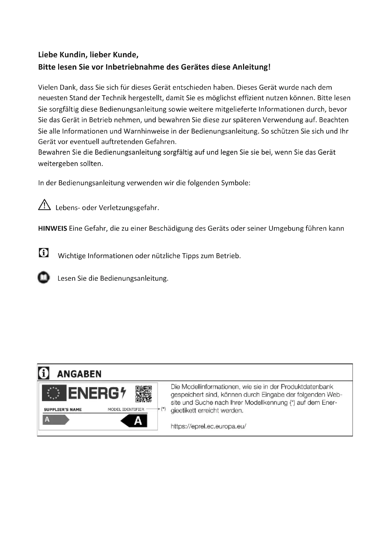 - Wir übernehmen keine Haftung für Schäden, die durch unsachgemäßen Umgang entstehen. A Aufstellung und Reparaturen dürfen nur durch einen autorisierten Kundendienst erfolgen. A Verwenden Sie nur Original-Ersatzteile und- Zubehör. A Originalersatzteile werden ab dem Kaufdatum des Produktes 10 Jahre lang bereitgestellt. A Reparieren oder ersetzen Sie nur Geräteteile, bei denen dies ausdrücklich in der Bedienungsanleitung steht. A Nehmen Sie keine Änderungen am Gerät vor. A 1.1. Bestimmungsgemäßer Gebrauch
