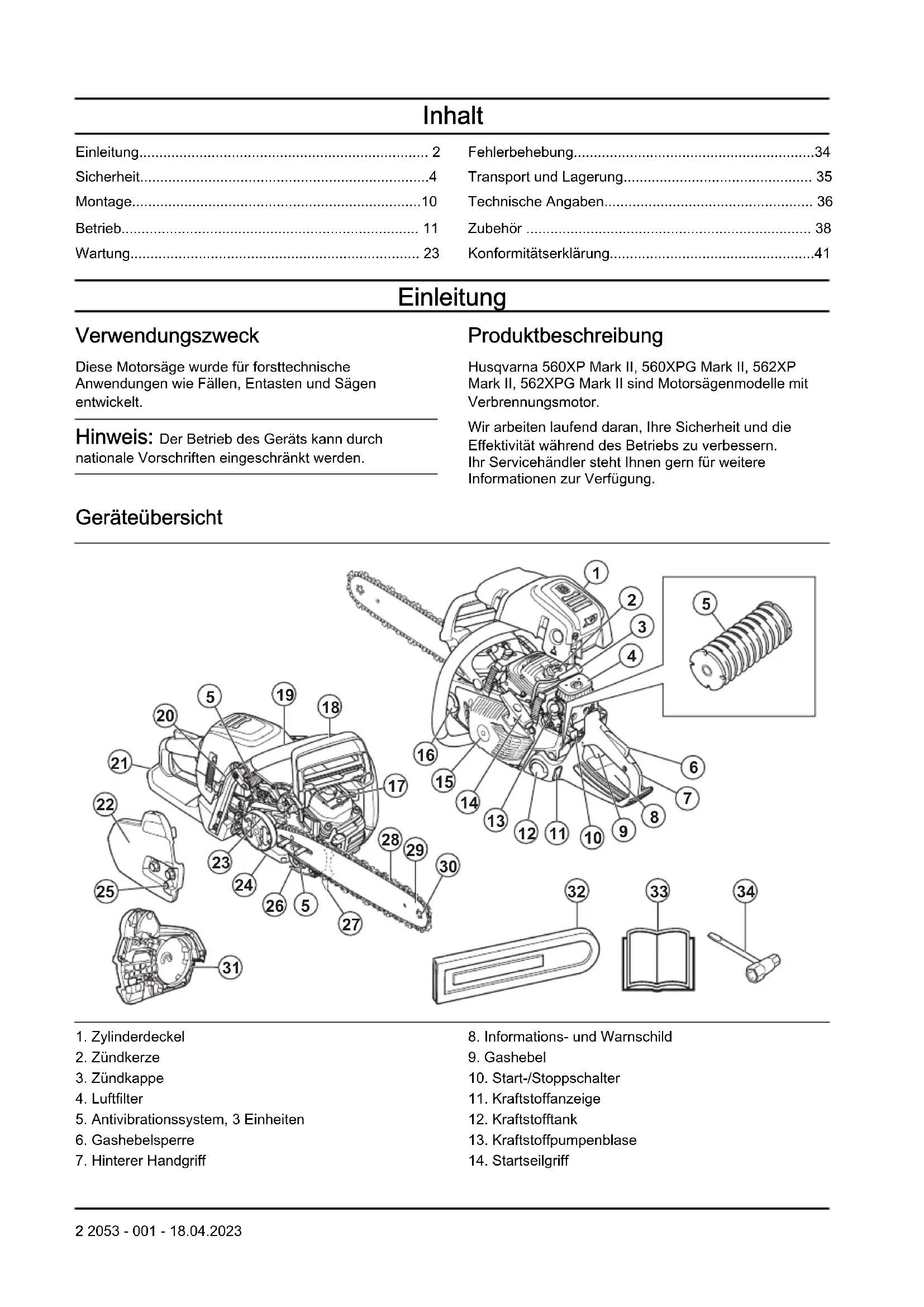 - Konformitätserklärung Einleitung Verwendungszweck Diese Motorsäge wurde für forsttechnische Anwendungen wie Fällen, Entasten und Sägen entwickelt. Hinweis: Der Betrieb des Geräts kann durch nationale Vorschriften eingeschränkt werden. Produktbeschreibung Husqvarna 560XP Mark II, 560XPG Mark II, 562XP Mark II, 562XPG Mark II sind Motorsägenmodelle mit Verbrennungsmotor. Wir arbeiten laufend daran, Ihre Sicherheit und die Effektivität während des Betriebs zu verbessern. Ihr Servicehändler steht Ihnen gern für weitere Informationen zur Verfügung. Geräteübersicht p. 41