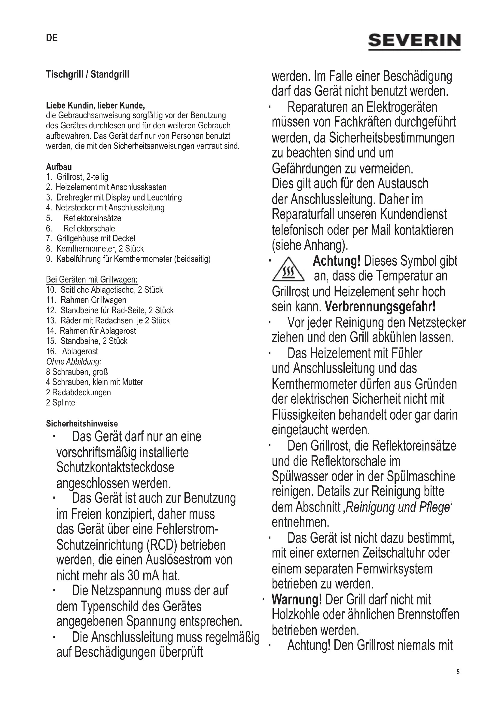 Achtung! Dieses Symbol gibt an, dass die Temperatur an Grillrost und Heizelement sehr hoch sein kann. Verbrennungsgefahr! ∙ Vor jeder Reinigung den Netzstecker ziehen und den Grill abkühlen lassen. ∙ Das Heizelement mit Fühler und Anschlussleitung und das Kernthermometer dürfen aus Gründen der elektrischen Sicherheit nicht mit Flüssigkeiten behandelt oder gar darin eingetaucht werden. ∙ DenGrillrost,dieReektoreinsätze unddieReektorschaleim Spülwasser oder in der Spülmaschine reinigen. Details zur Reinigung bitte dem Abschnitt ‚Reinigung und Pege‘ entnehmen. ∙ Das Gerät ist nicht dazu bestimmt, mit einer externen Zeitschaltuhr oder einem separaten Fernwirksystem betrieben zu werden. ∙ Warnung! Der Grill darf nicht mit Holzkohle oder ähnlichen Brennstoffen betrieben werden. ∙ Achtung! Den Grillrost niemals mit DE6 142 x 208 mm Alufolie, Grillgeschirr, etc. abdecken! Es entsteht sonst ein Wärmestau, der das Gerät zerstören könnte. ∙ IndieReektorschaledürfenmaximal 2 l Wasser eingefüllt werden. ∙ Das Gerät ist dazu bestimmt, im Haushalt und ähnlichen Anwendungen verwendet zu werden, wie z.B. - in Küchen von Mitarbeitern in Läden, Büros und ähnlichen Arbeitsumgebungen, - in landwirtschaftlichen Betrieben, - von Kunden in Hotels, Motels und weiteren typischen Wohnumgebungen, - in Frühstückspensionen. ∙ Das Gerät kann von Kindern ab 8 Jahren sowie von Personen mit reduzierten physischen, sensorischen oder mentalen Fähigkeiten oder Mangel an Erfahrung und/oder Wissen benutzt werden, wenn sie beaufsichtigt oder bezüglich des sicheren Gebrauchs des Gerätes unterwiesen wurden und die daraus resultierenden Gefahren verstanden haben. ∙ Kinder dürfen nicht mit dem Gerät spielen. ∙ Reinigung und Benutzer-Wartung dürfen nicht durch Kinder durchgeführt werden, es sei denn sie sind 8 Jahre und älter und werden beaufsichtigt. ∙ Kinder jünger als 8 Jahre müssen vom Gerät und der Anschlussleitung ferngehalten werden. ∙ Verpackungsmaterial von Kindern fernhalten. Es besteht u.a. Erstickungsgefahr! ∙ Vor Inbetriebnahme das komplette Gerät inkl. eventueller Zubehörteile auf Mängel überprüfen, die die Funktionssicherheit des Gerätes beeinträchtigen könnten. Falls das Gerät z.B. zu Boden gefallen ist, können von außen nicht erkennbare Schäden vorliegen. Auch in diesem Fall das Gerät nicht in Betrieb nehmen. ∙ Den Grill auf eine ebene, wärmebeständige und spritzunempndlicheUnterlagestellen,daSpritzerbei fetthaltigem Grillgut unvermeidlich sind. ∙ Den Grill nicht direkt an eine Wand oder Ecke stellen undleichtentammbareGegenständeausderNähe entfernen. ∙ Fetthaltiges Grillgut kann sich entzünden, daher vor jeder Inbetriebnahme Wasser in die Reektorschale einfüllen! Erst danach den Netzstecker einstecken. HierdurchwirddieReektorschalegekühlt, die Rauchentwicklung vermindert und die Reinigung erleichtert. Den Wasserstand beobachten und rechtzeitig Wasser nachfüllen. Vorher den Netzstecker ziehen und kein Wasser direkt auf das Heizelement gießen. ∙ Vor der Inbetriebnahme kontrollieren, dass das Heizelement ordnungsgemäß im Gehäuse und in der Reektorschale eingesetzt ist. ∙ Den Grill nur unter Aufsicht betreiben. ∙ Die Anschlussleitung darf nicht mit heißen Teilen in Berührung kommen. ∙ Das Kabel so verlegen, dass man nicht darüber stolpert. ∙ Den Netzstecker ziehen: - vor jedem Wassereinfüllen - nach jedem Gebrauch, - bei Störung während des Betriebes, - vor jeder Reinigung. ∙ Wird eine Kabeltrommel / ein Verlängerungskabel verwendet, entsteht hierdurch ein Leistungsverlust. Das Kabel muss vollständig abgewickelt sein, da sich dieses sonst unzulässig erwärmen kann. Das Kabel muss für die auf dem Typenschild angegebenen Leistung und den Gebrauch im Freien geeignet sein. ∙ Den Grillwagen nicht durch Anfassen am Seitentisch bewegen. Vorher den Seitentisch abnehmen und am Rahmen anfassen. ∙ Den Grillwagen nicht zum Transport von Gegenständen verwenden. ∙ Den Grill niemals bewegen, während er in Betrieb ist. ∙ Das Wasser nach Gebrauch entfernen. ∙ Vorsicht! Den Grill immer vollständig abkühlen lassen, bevor er bewegt, gereinigt, abgedeckt oder verstaut wird. ∙ Vorsicht! Wenn der Grill nicht verwendet wird, muss das Heizelement mit Anschlusskasten vom Grill entfernt und in einem trockenen Innenraum aufbewahrt werden.7 142 x 208 mm ∙ Die anderen Teile des Grills dürfen nicht im Freien oder an offenen Stellen aufbewahrt werden, wo sie durch Witterungseinüssebeeinträchtigtwerdenkönnten. ∙ Der Grill darf nur mit dem mitgelieferten Kernthermometer bzw. der SEVERIN-Art.Nr. ZB 8126 benutzt werden. ∙ Wird der Grill falsch bedient, kann keine Haftung für evtl. auftretende Schäden übernommen werden. ∙ Das Gerät entspricht den Richtlinien, die für die CE- Kennzeichnung verbindlich sind. Erste Inbetriebnahme ∙ Sämtliches Verpackungsmaterial und eventuelle Werbeaufkleber vom Gerät entfernen. ∙ DenGrillrost,dieReektoreinsätzeunddie ReektorschaleinheißemSpülwasserreinigenund gründlich abtrocknen. ∙ Das Gerät montieren und Wasser einfüllen wie unter ‚Gerät vorbereiten‘ beschrieben. ∙ Das Gerät ohne Grillgut ca. 10 Minuten auf höchster Stufe (siehe ‚Grillen Boost-Zone‘)aufheizen, damit der Eigengeruch des Grills abklingt. Eine leichte Rauchentwicklung ist möglich. Daher bei Benutzung in geschlossenen Räumen für ausreichende Lüftung durch geöffnete Fenster oder Balkontüren sorgen oder das Gerät unter eine Dunstabzugshaube stellen. Grill montieren ∙ Den Grill wie in der Abbildung gezeigt montieren: ∙ DieReektorschaleindasGrillgehäusesetzen. ∙ DieReektoreinsätzesoindieReektorschale einsetzen, dass jeder Einsatz vier Erhebungen abdeckt! ∙ Den Heizkörper mit Anschlusskasten in die Reektorschalesetzen.DasGerätistmit einem Sicherheitsschalter ausgestattet. Ist der Anschlusskasten nicht richtig montiert, lässt sich das Gerät nicht in Betrieb nehmen. 