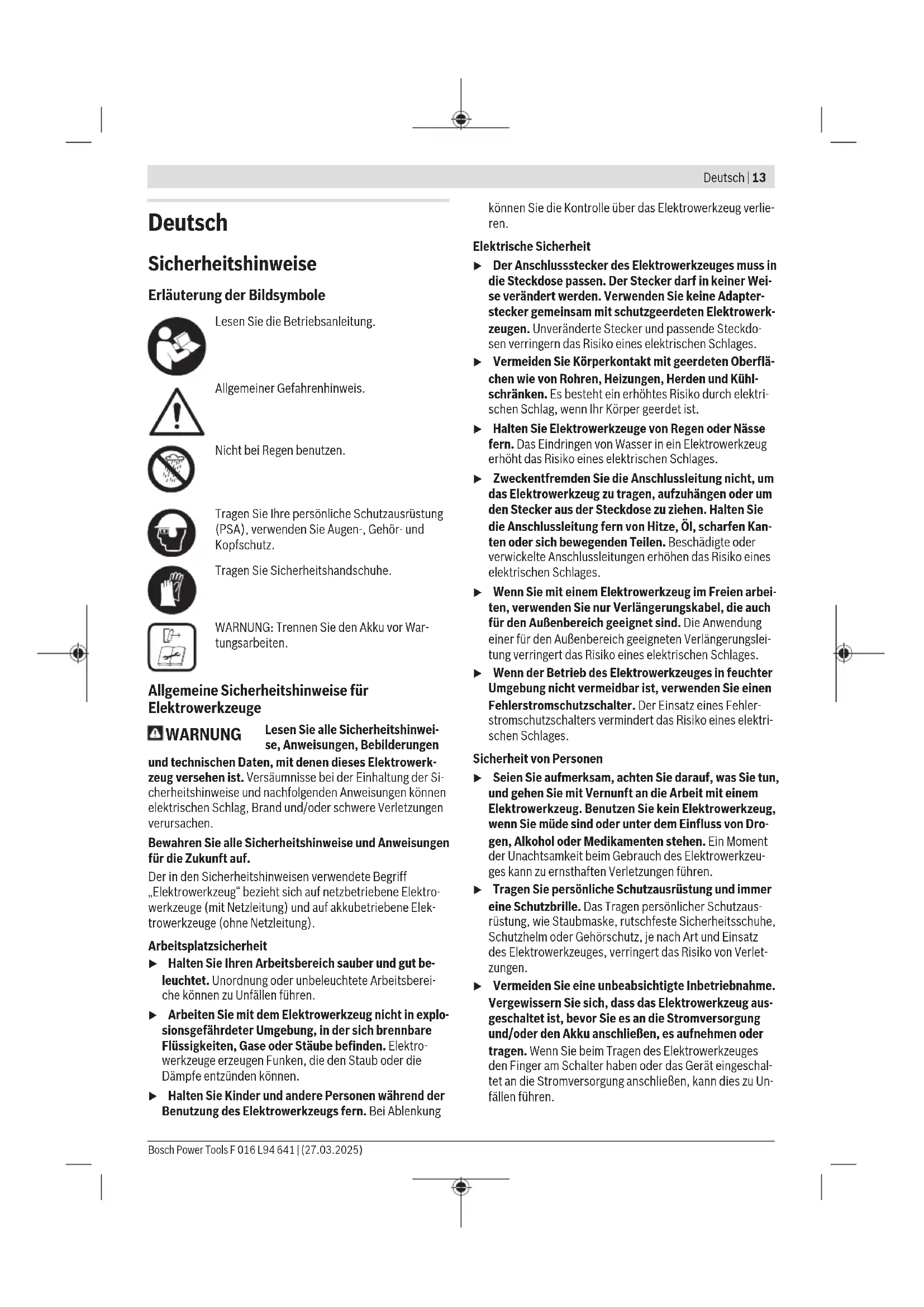 F 016 L94 641 | (27.03.2025) Bosch Power ToolsDeutsch | 13 Deutsch Sicherheitshinweise Erläuterung der Bildsymbole Lesen Sie die Betriebsanleitung. Allgemeiner Gefahrenhinweis. Nicht bei Regen benutzen. Tragen Sie Ihre persönliche Schutzausrustung (PSA), verwenden Sie Augen-, Gehör- und Kopfschutz. Tragen Sie Sicherheitshandschuhe. WARNUNG: Trennen Sie den Akku vor War- tungsarbeiten. Allgemeine Sicherheitshinweise für Elektrowerkzeuge WARNUNG Lesen Sie alle Sicherheitshinwei- se, Anweisungen, Bebilderungen und technischen Daten, mit denen dieses Elektrowerk- zeug versehen ist. Versäumnisse bei der Einhaltung der Si- cherheitshinweise und nachfolgenden Anweisungen können elektrischen Schlag, Brand und/oder schwere Verletzungen verursachen. Bewahren Sie alle Sicherheitshinweise und Anweisungen für die Zukunft auf. Der in den Sicherheitshinweisen verwendete Begriff „Elektrowerkzeug“ bezieht sich auf netzbetriebene Elektro- werkzeuge (mit Netzleitung) und auf akkubetriebene Elek- trowerkzeuge (ohne Netzleitung). Arbeitsplatzsicherheit u Halten Sie Ihren Arbeitsbereich sauber und gut be- leuchtet. Unordnung oder unbeleuchtete Arbeitsberei- che können zu Unfällen führen. u Arbeiten Sie mit dem Elektrowerkzeug nicht in explo- sionsgefährdeter Umgebung, in der sich brennbare Flüssigkeiten, Gase oder Stäube befinden. Elektro- werkzeuge erzeugen Funken, die den Staub oder die Dämpfe entzünden können. u Halten Sie Kinder und andere Personen während der Benutzung des Elektrowerkzeugs fern. Bei Ablenkung können Sie die Kontrolle über das Elektrowerkzeug verlie- ren. Elektrische Sicherheit u Der Anschlussstecker des Elektrowerkzeuges muss in die Steckdose passen. Der Stecker darf in keiner Wei- se verändert werden. Verwenden Sie keine Adapter- stecker gemeinsam mit schutzgeerdeten Elektrowerk- zeugen. Unveränderte Stecker und passende Steckdo- sen verringern das Risiko eines elektrischen Schlages. u Vermeiden Sie Körperkontakt mit geerdeten Oberflä- chen wie von Rohren, Heizungen, Herden und Kühl- schränken. Es besteht ein erhöhtes Risiko durch elektri- schen Schlag, wenn Ihr Körper geerdet ist. u Halten Sie Elektrowerkzeuge von Regen oder Nässe fern. Das Eindringen von Wasser in ein Elektrowerkzeug erhöht das Risiko eines elektrischen Schlages. u Zweckentfremden Sie die Anschlussleitung nicht, um das Elektrowerkzeug zu tragen, aufzuhängen oder um den Stecker aus der Steckdose zu ziehen. Halten Sie die Anschlussleitung fern von Hitze, Öl, scharfen Kan- ten oder sich bewegenden Teilen. Beschädigte oder verwickelte Anschlussleitungen erhöhen das Risiko eines elektrischen Schlages. u Wenn Sie mit einem Elektrowerkzeug im Freien arbei- ten, verwenden Sie nur Verlängerungskabel, die auch für den Außenbereich geeignet sind. Die Anwendung einer für den Außenbereich geeigneten Verlängerungslei- tung verringert das Risiko eines elektrischen Schlages. u Wenn der Betrieb des Elektrowerkzeuges in feuchter Umgebung nicht vermeidbar ist, verwenden Sie einen Fehlerstromschutzschalter. Der Einsatz eines Fehler- stromschutzschalters vermindert das Risiko eines elektri- schen Schlages. Sicherheit von Personen u Seien Sie aufmerksam, achten Sie darauf, was Sie tun, und gehen Sie mit Vernunft an die Arbeit mit einem Elektrowerkzeug. Benutzen Sie kein Elektrowerkzeug, wenn Sie müde sind oder unter dem Einfluss von Dro- gen, Alkohol oder Medikamenten stehen. Ein Moment der Unachtsamkeit beim Gebrauch des Elektrowerkzeu- ges kann zu ernsthaften Verletzungen führen. u Tragen Sie persönliche Schutzausrüstung und immer eine Schutzbrille. Das Tragen persönlicher Schutzaus- rüstung, wie Staubmaske, rutschfeste Sicherheitsschuhe, Schutzhelm oder Gehörschutz, je nach Art und Einsatz des Elektrowerkzeuges, verringert das Risiko von Verlet- zungen. u Vermeiden Sie eine unbeabsichtigte Inbetriebnahme. Vergewissern Sie sich, dass das Elektrowerkzeug aus- geschaltet ist, bevor Sie es an die Stromversorgung und/oder den Akku anschließen, es aufnehmen oder tragen. Wenn Sie beim Tragen des Elektrowerkzeuges den Finger am Schalter haben oder das Gerät eingeschal- tet an die Stromversorgung anschließen, kann dies zu Un- fällen führen. Bosch Power Tools F 016 L94 641 | (27.03.2025)14 | Deutsch u Entfernen Sie Einstellwerkzeuge oder Schrauben- schlüssel, bevor Sie das Elektrowerkzeug einschalten. Ein Werkzeug oder Schlüssel, der sich in einem drehen- den Geräteteil befindet, kann zu Verletzungen führen. u Vermeiden Sie eine abnormale Körperhaltung. Sorgen Sie für einen sicheren Stand und halten Sie jederzeit das Gleichgewicht. Dadurch können Sie das Elektro- werkzeug in unerwarteten Situationen besser kontrollie- ren. u Tragen Sie geeignete Kleidung. Tragen Sie keine weite Kleidung oder Schmuck. Halten Sie Haare und Klei- dung fern von sich bewegenden Teilen. Lockere Klei- dung, Schmuck oder lange Haare können von sich bewe- genden Teilen erfasst werden. u Wenn Staubabsaug- und -auffangeinrichtungen mon- tiert werden können, sind diese anzuschließen und richtig zu verwenden. Verwendung einer Staubabsau- gung kann Gefährdungen durch Staub verringern. u Wiegen Sie sich nicht in falscher Sicherheit und set- zen Sie sich nicht über die Sicherheitsregeln für Elek- trowerkzeuge hinweg, auch wenn Sie nach vielfachem Gebrauch mit dem Elektrowerkzeug vertraut sind. Achtloses Handeln kann binnen Sekundenbruchteilen zu schweren Verletzungen führen. Verwendung und Behandlung des Elektrowerkzeugs u Überlasten Sie das Elektrowerkzeug nicht. Verwenden Sie für Ihre Arbeit das dafür bestimmte Elektrowerk- zeug. Mit dem passenden Elektrowerkzeug arbeiten Sie besser und sicherer im angegebenen Leistungsbereich. u Benutzen Sie kein Elektrowerkzeug, dessen Schalter defekt ist. Ein Elektrowerkzeug, das sich nicht mehr ein- oder ausschalten lässt, ist gefährlich und muss repariert werden. u Ziehen Sie den Stecker aus der Steckdose und/oder entfernen Sie einen abnehmbaren Akku, bevor Sie Ge- 