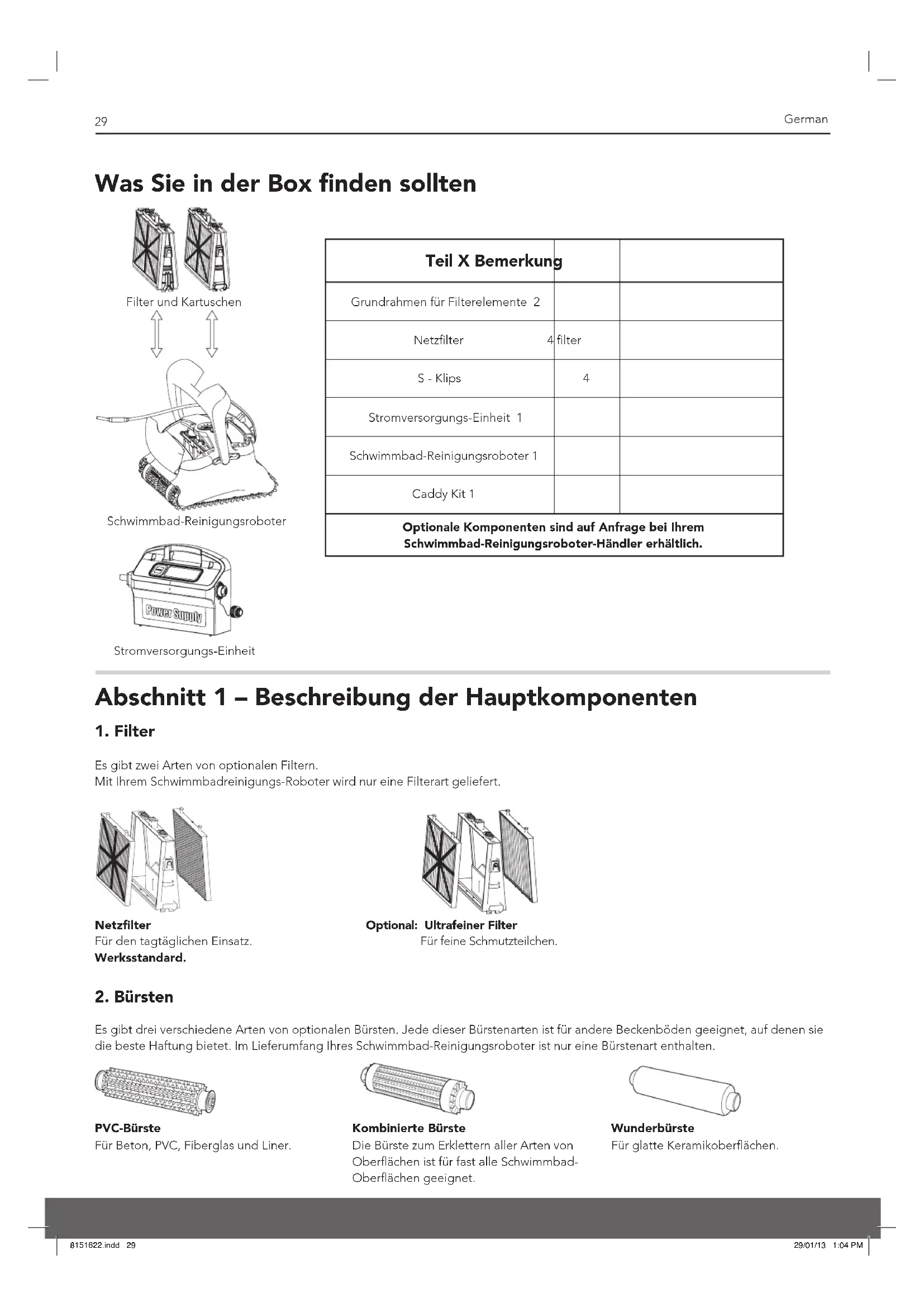 Es gibt drei verschiedene Arten von optionalen Bürsten. Jede dieser Bürstenarten ist für andere Beckenböden geeignet, auf denen sie die beste Haftung bietet. Im Lieferumfang Ihres Schwimmbad-Reinigungsroboter ist nur eine Bürstenart enthalten. PVC-Bürste Für Beton, PVC, Fiberglas und Liner. Kombinierte Bürste Die Bürste zum Erklettern aller Arten von Oberflächen ist für fast alle Schwimmbad-Oberflächen geeignet.Wunderbürste Für glatte Keramikoberflächen. Stromversorgungs-EinheitSchwimmbad-ReinigungsroboterFilter und Kartuschen click click click click click click click click 8151622.indd 29 29/01/13 1:04 PM30 German