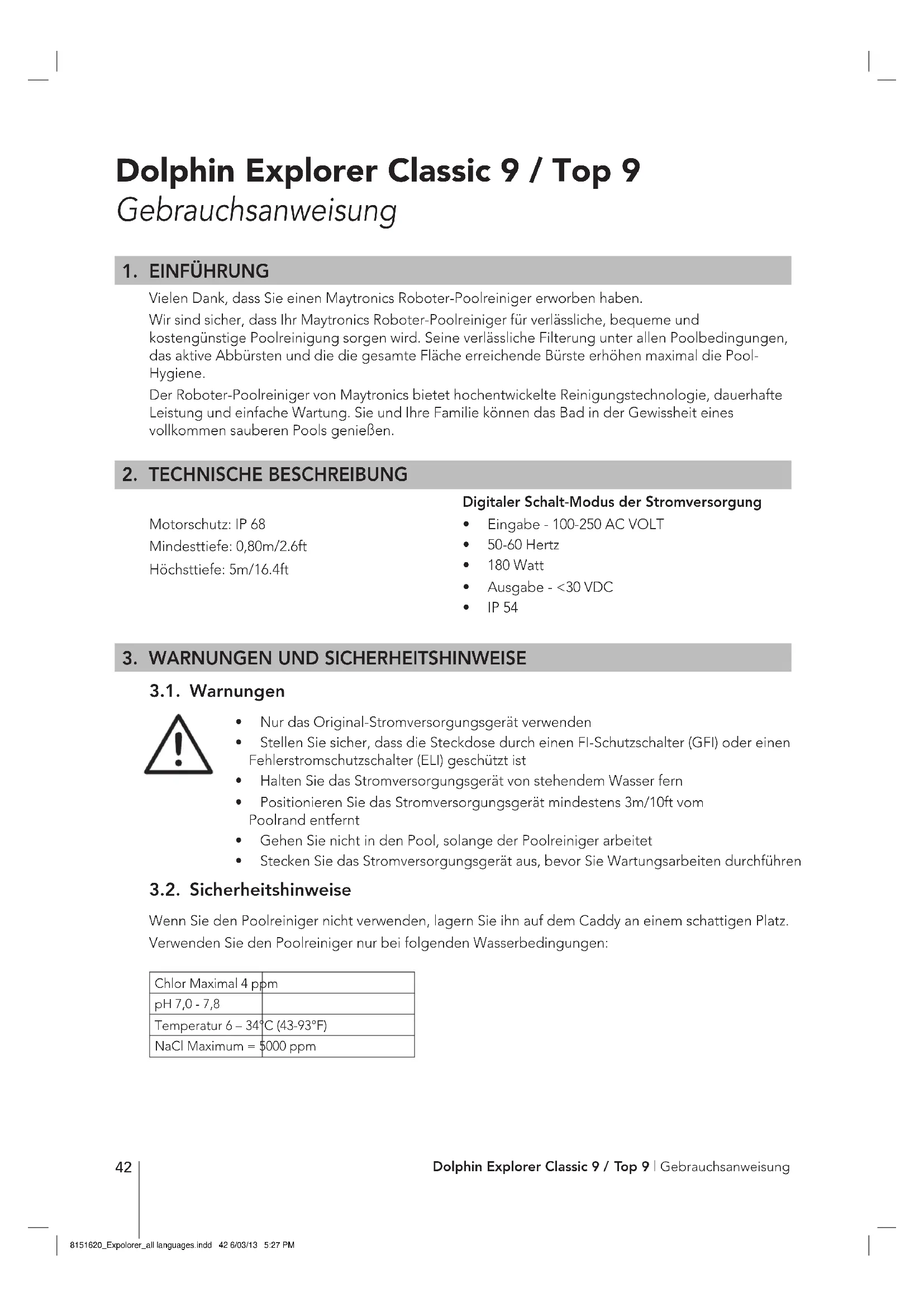 - Stecken Sie das Stromversorgungsgerät aus, bevor Sie Wartungsarbeiten durchführen 3.2. Sicherheitshinweise Wenn Sie den Poolreiniger nicht verwenden, lagern Sie ihn auf dem Caddy an einem schattigen Platz. Verwenden Sie den Poolreiniger nur bei folgenden Wasserbedingungen: Chlor Maximal 4 ppmpH 7,0 - 7,8Temperatur 6 – 34°C (43-93°F)NaCl Maximum = 5000 ppm CAUTION Digitaler Schalt-Modus der Stromversorgung