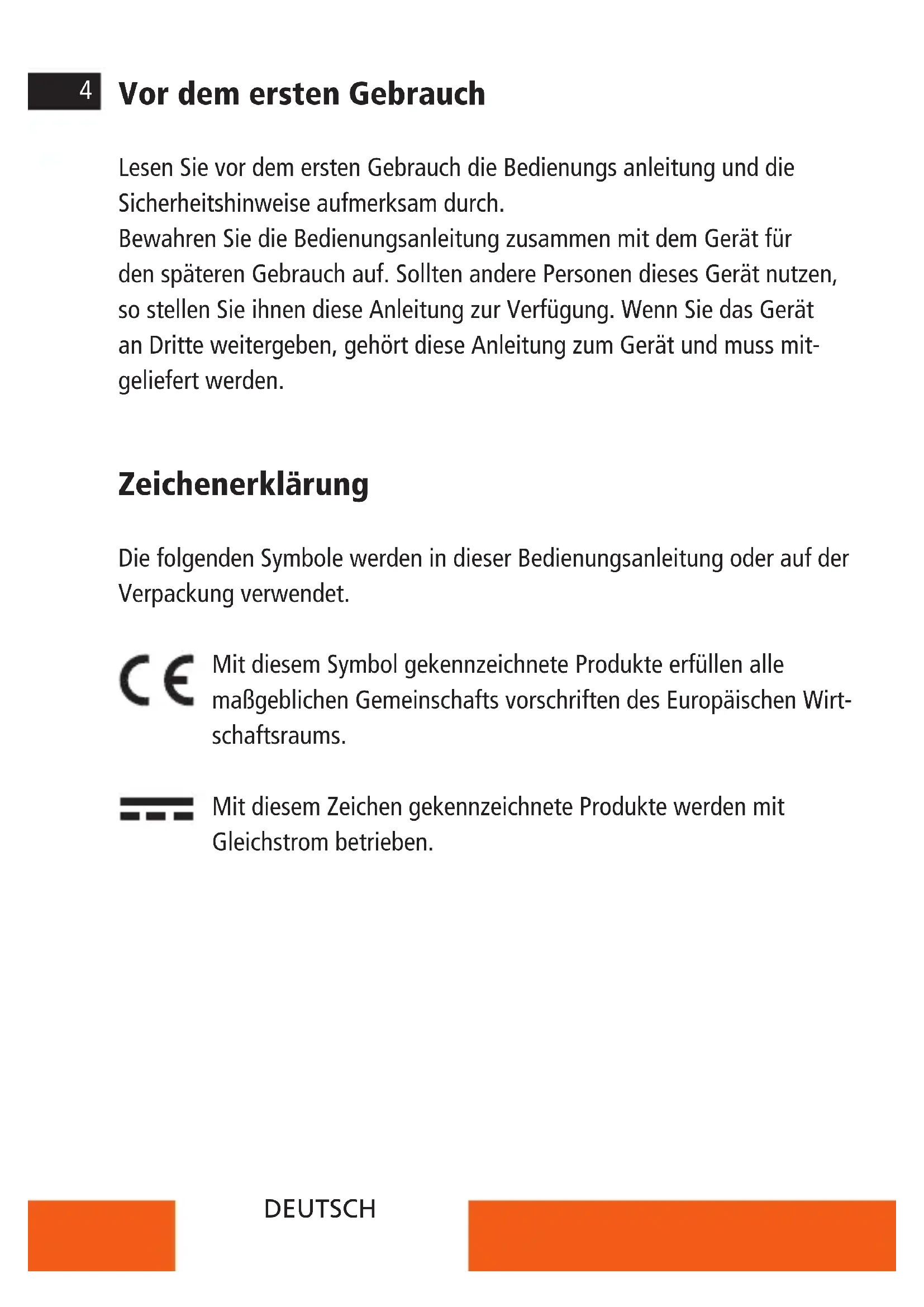 Vor dem ersten Gebrauch Lesen Sie vor dem ersten Gebrauch die Bedienungs anleitung und die Sicherheitshinweise aufmerksam durch. Bewahren Sie die Bedienungsanleitung zusammen mit dem Gerät für den späteren Gebrauch auf. Sollten andere Personen dieses Gerät nutzen, so stellen Sie ihnen diese Anleitung zur Verfügung. Wenn Sie das Gerät an Dritte weitergeben, gehört diese Anleitung zum Gerät und muss mit- geliefert werden. Zeichenerklärung Die folgenden Symbole werden in dieser Bedienungsanleitung oder auf der Verpackung verwendet. Mit diesem Symbol gekennzeichnete Produkte erfüllen alle maßgeblichen Gemeinschafts vorschriften des Europäischen Wirt- schaftsraums. Mit diesem Zeichen gekennzeichnete Produkte werden mit Gleichstrom betrieben.5 Sicherheitshinweise Gefahren für Kinder und Personen mit verringerten physischen, sensori- schen oder mentalen Fähigkeiten (beispielsweise teilweise Behinderte, ältere Personen mit Einschränkung ihrer physischen und mentalen Fähigkeiten) oder Mangel an Erfahrung und Wissen (beispielsweise ältere Kinder). – Dieses Produkt kann von Kindern ab 14 Jahren und darüber benutzt werden. Reinigung und Benutzerwartung dürfen nicht von Kindern ohne Beaufsichtigung durchgeführt werden. – Das Verpackungsmaterial ist kein Spielzeug. Lassen Sie Kinder nicht mit der Verpackungsfolie spielen. Sie können sich beim Spielen darin verfangen und ersticken. – Beaufsichtigen Sie Kinder, um sicherzustellen, dass sie nicht mit Kleinteilen (Speicherkarte) spielen. Wenn Sie vermuten, dass ein Kleinteil verschluckt wurde, suchen Sie sofort einen Arzt auf. – Lagern Sie Kleinteile so, dass sie für Kinder und Tiere unzugänglich sind. VORSICHT! Verletzungsgefahr! Unsachgemäßer Umgang mit dem Produkt kann zu Verletzungen führen. – Entfernen Sie sofort den Akku und ggf. das Ladekabel bei ungewöhn- lichen Geräuschen oder Gerüchen sowie Rauch aus dem Gehäuse. HINWEIS! Gefahr von Sachschäden! Unsachgemäßer Umgang mit dem Produkt kann zu Beschädigungen führen.DEUTSCH