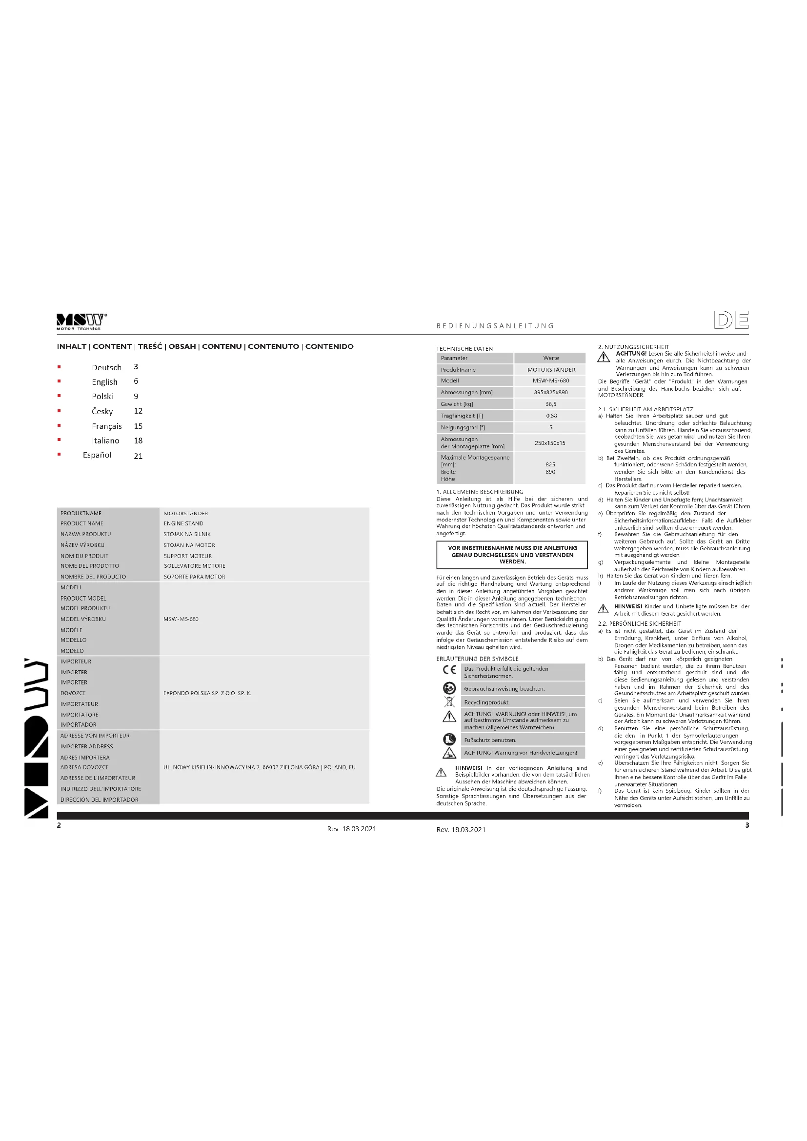 INHALT | CONTENT | TREŚĆ | OBSAH | CONTENU | CONTENUTO | CONTENIDO TECHNISCHE DATEN Die Begrie "Gerät" oder "Produkt" in den Warnungen und Beschreibung des Handbuchs beziehen sich auf. MOTORSTÄNDER.