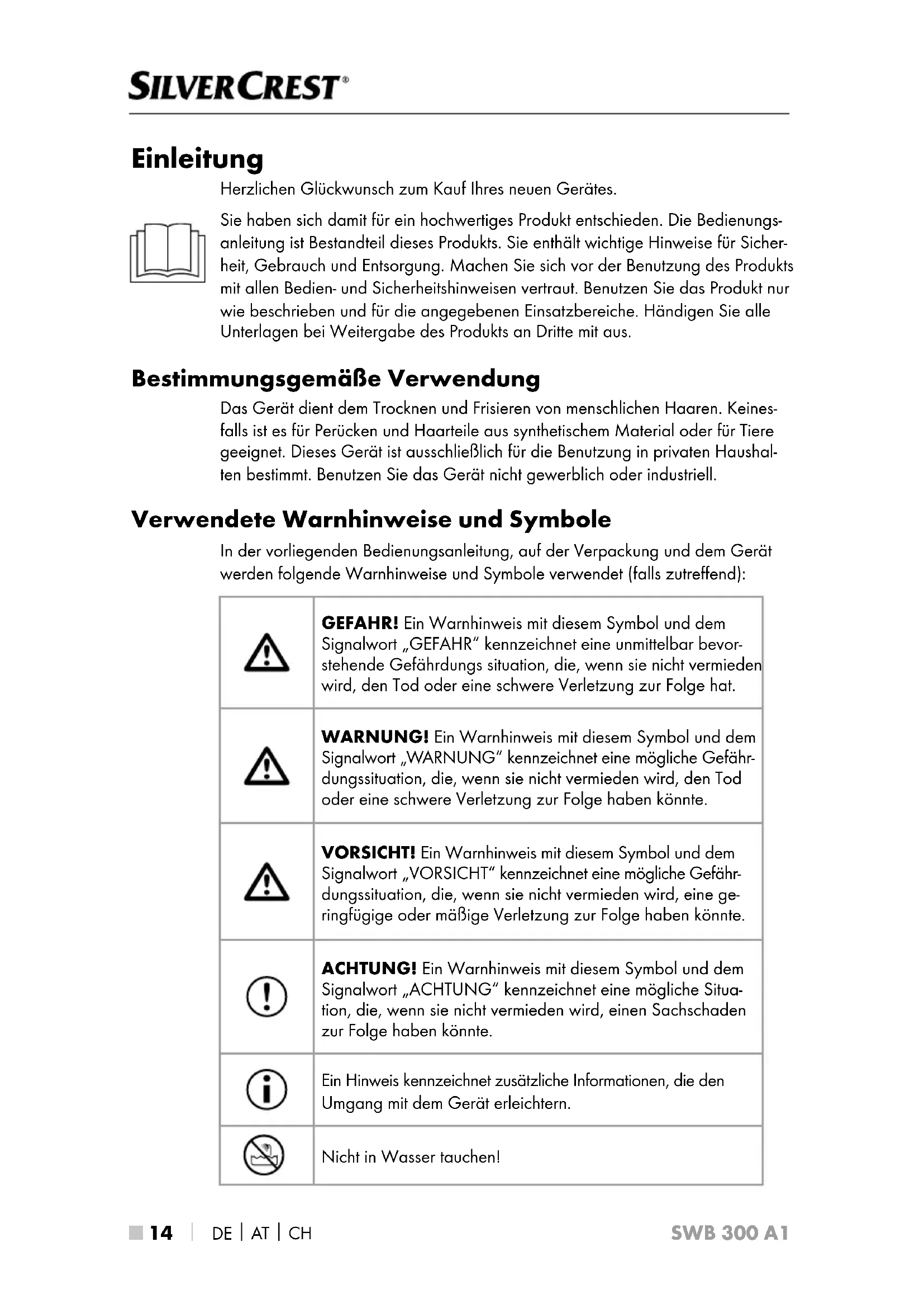 SWB 300 A1 Einleitung Herzlichen Glückwunsch zum Kauf Ihres neuen Gerätes. Sie haben sich damit für ein hochwertiges Produkt entschieden. Die Bedienungs- anleitung ist Bestandteil dieses Produkts. Sie enthält wichtige Hinweise für Sicher- heit, Gebrauch und Entsorgung. Machen Sie sich vor der Benutzung des Produkts mit allen Bedien- und Sicherheitshinweisen vertraut. Benutzen Sie das Produkt nur wie beschrieben und für die angegebenen Einsatzbereiche. Händigen Sie alle Unterlagen bei Weitergabe des Produkts an Dritte mit aus. Bestimmungsgemäße Verwendung Das Gerät dient dem Trocknen und Frisieren von menschlichen Haaren. Keines- falls ist es für Perücken und Haarteile aus synthetischem Material oder für Tiere geeignet. Dieses Gerät ist ausschließlich für die Benutzung in privaten Haushal- ten bestimmt. Benutzen Sie das Gerät nicht gewerblich oder industriell. Verwendete Warnhinweise und Symbole In der vorliegenden Bedienungsanleitung, auf der Verpackung und dem Gerät werden folgende Warnhinweise und Symbole verwendet (falls zutreffend): GEFAHR! Ein Warnhinweis mit diesem Symbol und dem Signalwort „GEFAHR“ kennzeichnet eine unmittelbar bevor- stehende Gefährdungs situation, die, wenn sie nicht vermieden wird, den Tod oder eine schwere Verletzung zur Folge hat. WARNUNG! Ein Warnhinweis mit diesem Symbol und dem Signalwort „WARNUNG“ kennzeichnet eine mögliche Gefähr- dungssituation, die, wenn sie nicht vermieden wird, den Tod oder eine schwere Verletzung zur Folge haben könnte. VORSICHT! Ein Warnhinweis mit diesem Symbol und dem Signalwort „VORSICHT“ kennzeichnet eine mögliche Gefähr- dungssituation, die, wenn sie nicht vermieden wird, eine ge- ringfügige oder mäßige Verletzung zur Folge haben könnte. ACHTUNG! Ein Warnhinweis mit diesem Symbol und dem Signalwort „ACHTUNG“ kennzeichnet eine mögliche Situa- tion, die, wenn sie nicht vermieden wird, einen Sachschaden zur Folge haben könnte. Ein Hinweis kennzeichnet zusätzliche Informationen, die den Umgang mit dem Gerät erleichtern. Nicht in Wasser tauchen!DE