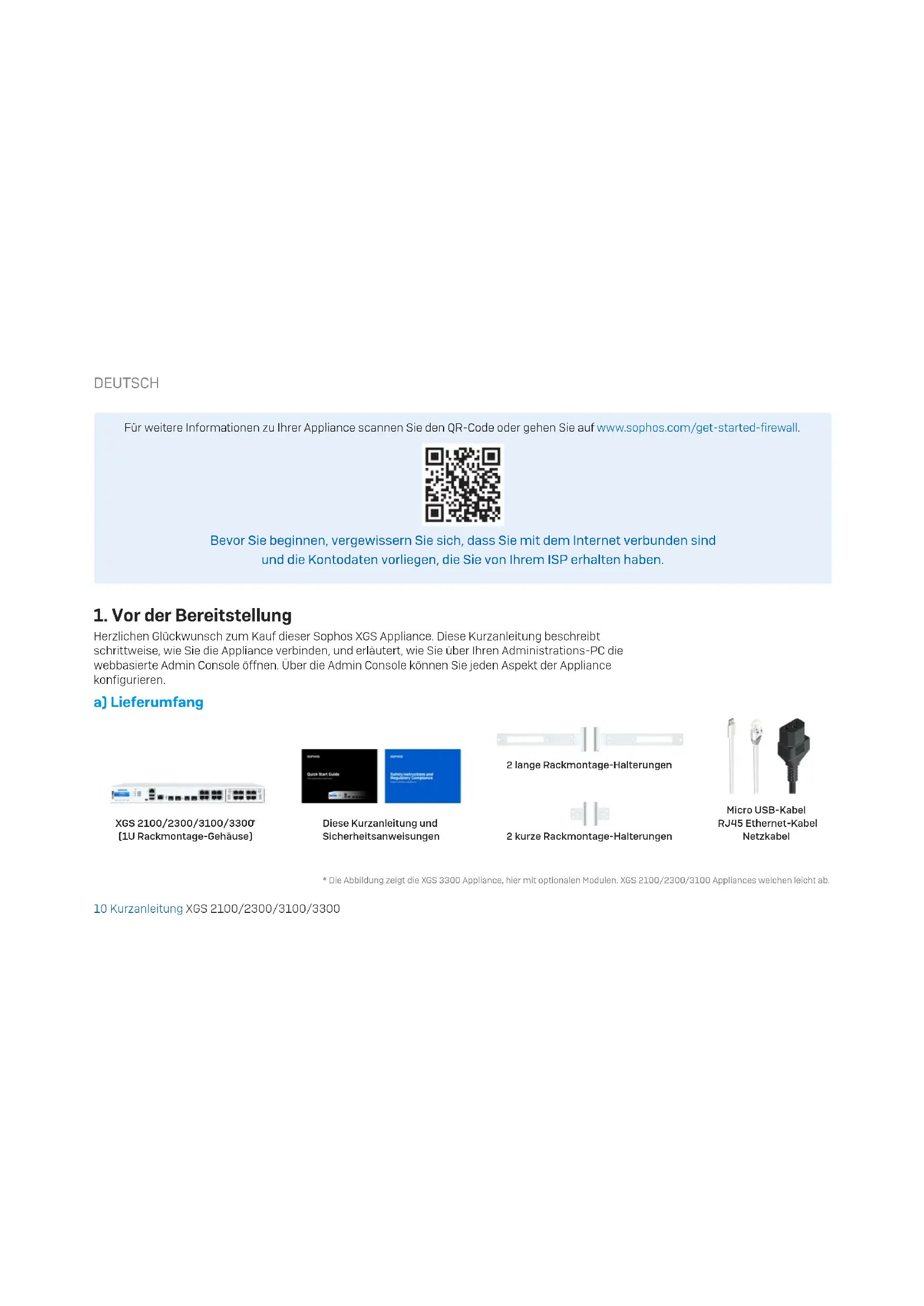 Herzlichen Glückwunsch zum Kauf dieser Sophos XGS Appliance. Diese Kurzanleitung beschreiben schrittweise, wie Sie die Appliance verbinden, und erlautert, wie Sie über ihren Administrations-PC die webbasierte Admin Console öffnen. Über die Admin Console können Sie jeder Aspekt der Appliance konfigurieren.