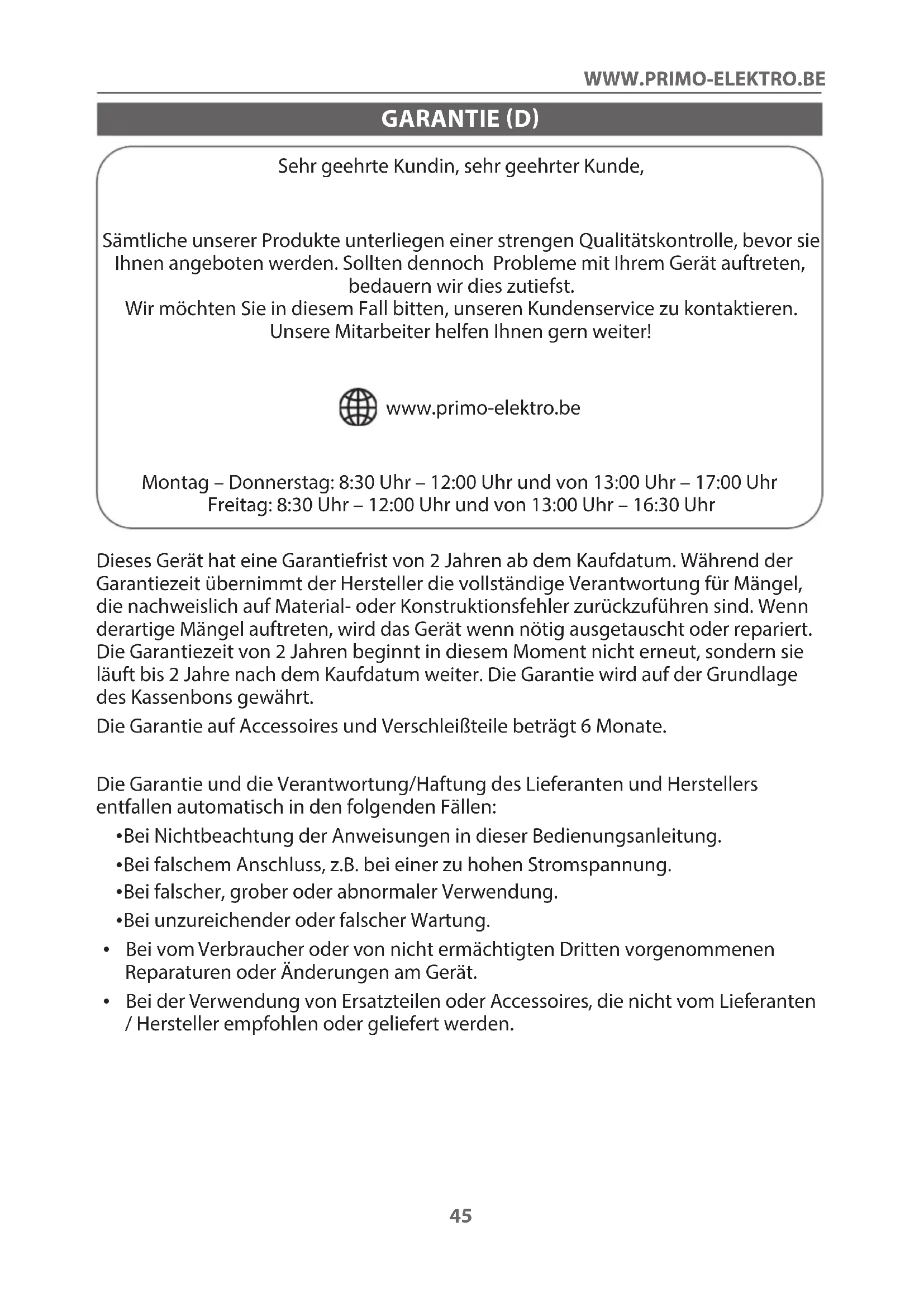 GARANTIE (D) Sehr geehrte Kundin, sehr geehrter Kunde, Sämtliche unserer Produkte unterliegen einer strengen Qualitätskontrolle, bevor sie Ihnen angeboten werden. Sollten dennoch Probleme mit Ihrem Gerät auftreten, bedauern wir dies zutiefst. Wir möchten Sie in diesem Fall bitten, unseren Kundenservice zu kontaktieren. Unsere Mitarbeiter helfen Ihnen gern weiter! www.primo-elektro.be Montag – Donnerstag: 8:30 Uhr – 12:00 Uhr und von 13:00 Uhr – 17:00 Uhr Freitag: 8:30 Uhr – 12:00 Uhr und von 13:00 Uhr – 16:30 Uhr Dieses Gerät hat eine Garantiefrist von 2 Jahren ab dem Kaufdatum. Während der Garantiezeit übernimmt der Hersteller die vollständige Verantwortung für Mängel, die nachweislich auf Material- oder Konstruktionsfehler zurückzuführen sind. Wenn derartige Mängel auftreten, wird das Gerät wenn nötig ausgetauscht oder repariert. Die Garantiezeit von 2 Jahren beginnt in diesem Moment nicht erneut, sondern sie läuft bis 2 Jahre nach dem Kaufdatum weiter. Die Garantie wird auf der Grundlage des Kassenbons gewährt. Die Garantie auf Accessoires und Verschleißteile beträgt 6 Monate. Die Garantie und die Verantwortung/Haftung des Lieferanten und Herstellers entfallen automatisch in den folgenden Fällen: