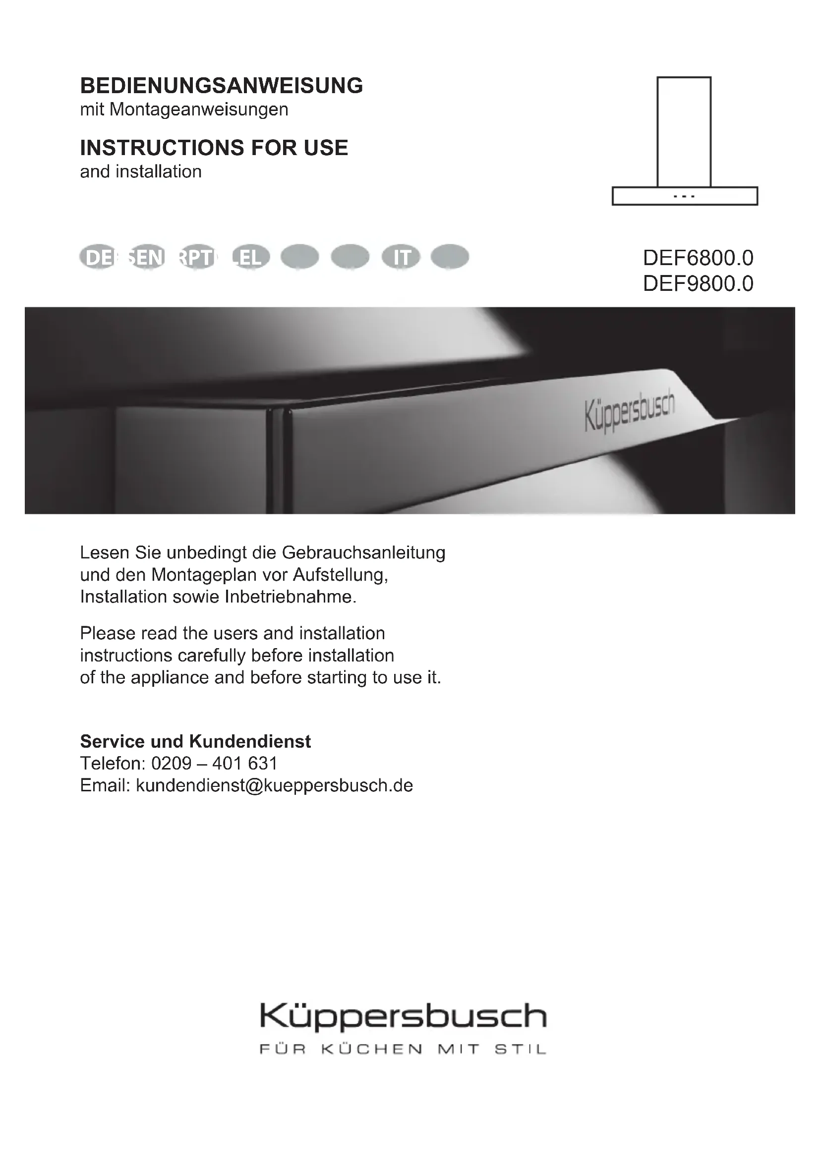 and installation Lesen Sie unbedingt die Gebrauchsanleitung und den Montageplan vor Aufstellung, Installation sowie Inbetriebnahme. Please read the users and installation instructions carefully before installation of the appliance and before starting to use it. Service und Kundendienst Telefon: 0209 – 401 631 Email: kundendienst@kueppersbusch.de DE ES EN FR PT NL EL DEF6800.0 DEF9800.0 IT2 Sicherheitshinweise Lesen Sie vor der Montage und Verwendung des Geräts sorgfältig die mitgelieferte Anleitung. Der Hersteller haftet nicht für Verletzungen oder Schäden, die durch eine fehlerhafte Montage entstehen. Bewahren Sie die Anleitung zum Nachschlagen auf. Sicherheit von Kindern und Schutzbedürftigen Personen Dieses Gerät kann dann von Kindern ab 8 Jahren, von Personen mit eingeschränkten körperlichen, sensorischen oder geistigen Fähigkeiten sowie von Personen ohne bisherige Erfahrung im Umgang mit solchen Geräten bedient werden, wenn sie dabei von einer Person, die für ihre Sicherheit verantwortlich ist, beaufsichtigt werden. Kinder dürfen nicht mit dem Gerät spielen. Allgemeine Sicherheit Der Raum in dem die Abzughaube gleichzeitig mit Gas- oder anderen Kraftstoffen befeuerten Herden oder Öfen genutzt wird, muss über ausreichende Lüftung verfügen (trifft nicht auf Umluftgeräte zu). Flambieren Sie niemals unterhalb der Abzugshaube. ACHTUNG: Zugängliche Teile können im Betrieb, während des Kochvorgangs heiß werden. Installation Die Elektronik muss mit einer Einrichtung zur Abschaltung ausgestattet sein, womit das Gerät sich von jedem Pol vom Netz ausschalten lässt und die vollständige Trennung unter der Überspannungskategorie III bietet. Wenn ein Stecker für die elektrische Verbindung verwendet wird, dann muss er nach der Installation zugänglich sein.3 deutsch Die Luft darf nicht in einen Schornsteinzug geleitet werden, der Abgase von mit Gas oder anderen Kraftstoffen befeuerten Geräten ableitet (trifft nicht auf Umluftgeräte zu). Die Unterseite der Dunstabzugshaube muß eine Mindesthöhe von 60 cm über elektrischen Kochstelle und 65 cm. Über Gaskochstellen aufweisen. Ist in den Einbauanweisungen für ein Gaskochfeld ein größerer Abstand angegeben, muß dieser entsprechend berücksichtigt werden. Informieren Sie sich vor Einbau der Dunstabzugshaube über die jeweils geltenden örtlichen Vorschriften über Luft- und Rauchabzug. Bei gleichzeitigem Betrieb Dunstabzugshaube im Abluftbetrieb und Feuerstätten darf im Aufstellraum der Feuerstätte der Unterdruck nicht größer als 4 Pa (4x10 bar) sein. Prüfen Sie vor Anschluß der Dunstabzugshaube an das Netz, ob Frequenz und Spannung mit den Angaben auf dem Typenschild übereinstimmen. Um eine optimale Leistung der Dunstab-zugshaube zu erreichen, darf die Länge des Abzugsrohrs VIER Meter nicht überschreiten und sollte nicht mehr als zwei 90°- Winkel enthalten. Obwohl eine Absaugung der beim Kochen entstehenden Dämpfe nach außen empfohlen wird, können Aktivkohlefilter ein-gebaut werden, die eine Rückführung der gereinigten Gase in die Küche über das Abzugsrohr ermöglichen. NOTE: Weitere Informationen finden Sie am Ende dieser Bedienungsanleitung.4 Reinigung Ein Nichtbefolgen der Reinigungsvorschriften kann zu Bränden führen. Vermeiden Sie Fettablagerungen auf allen Teilen der Dunstabzugshaube und insbesondere im Filter, es besteht Brandgefahr. In Abhängigkeit vom Grad der Nutzung der Dunstabzugshaube ist eine Reinigung der Filter mindestens einmal monatlich erforderlich. Beachten Sie bitte, daß beim Kochen auch dann Fettablagerungen an der Dunstabzugshaube und im Filter auftreten, wenn diese nicht in Betrieb ist. Wir empfehlen Ihnen, bei der Reinigung Schutzhandschuhe zu tragen und bei der Reinigung des Inneren der Dunstabzugshaube mit größter Vorsicht vorzugehen. Wartung Benutzen Sie die Dunstabzugshaube nicht mit defektem oder angeschnittenem Netzkabel, oder wenn das Gerät sichtbare Schäden im Bereich der Bedienelemente aufweist. Falls das Netzkabel beschädigt wird, ist es vom Hersteller, von autorisierten Vertretern oder von für diese Aufgabe qualifizierten Technikern zu ersetzen, um gefährliche Situationen zu vermeiden. Bei Fehlfunktion der LED, muss diese vom Hersteller, dem Verkäufer oder einem qualifizierten Servicebetrieb ersetzt werden, um Gefahren zu vermeiden. Wenn die Dunstabzugshaube nicht mehr oder nicht mehr richtig funktioniert, trennen Sie diese vom Netz und setzen Sie sich mit dem technischen Kundendienst in Verbindung. Hinsichtlich aller Reparaturarbeiten wenden Sie sich bitte an die nächstgelegene Kundendienststelle, die eine Verwendung von Originalersatzteilen garantiert. Alle5 deutsch Reparaturen oder Eingriffe durch andere Personen können Schäden und Funktionsstörungen am Gerät hervorrufen und Gefahren für Ihre Sicherheit zur Folge haben.
