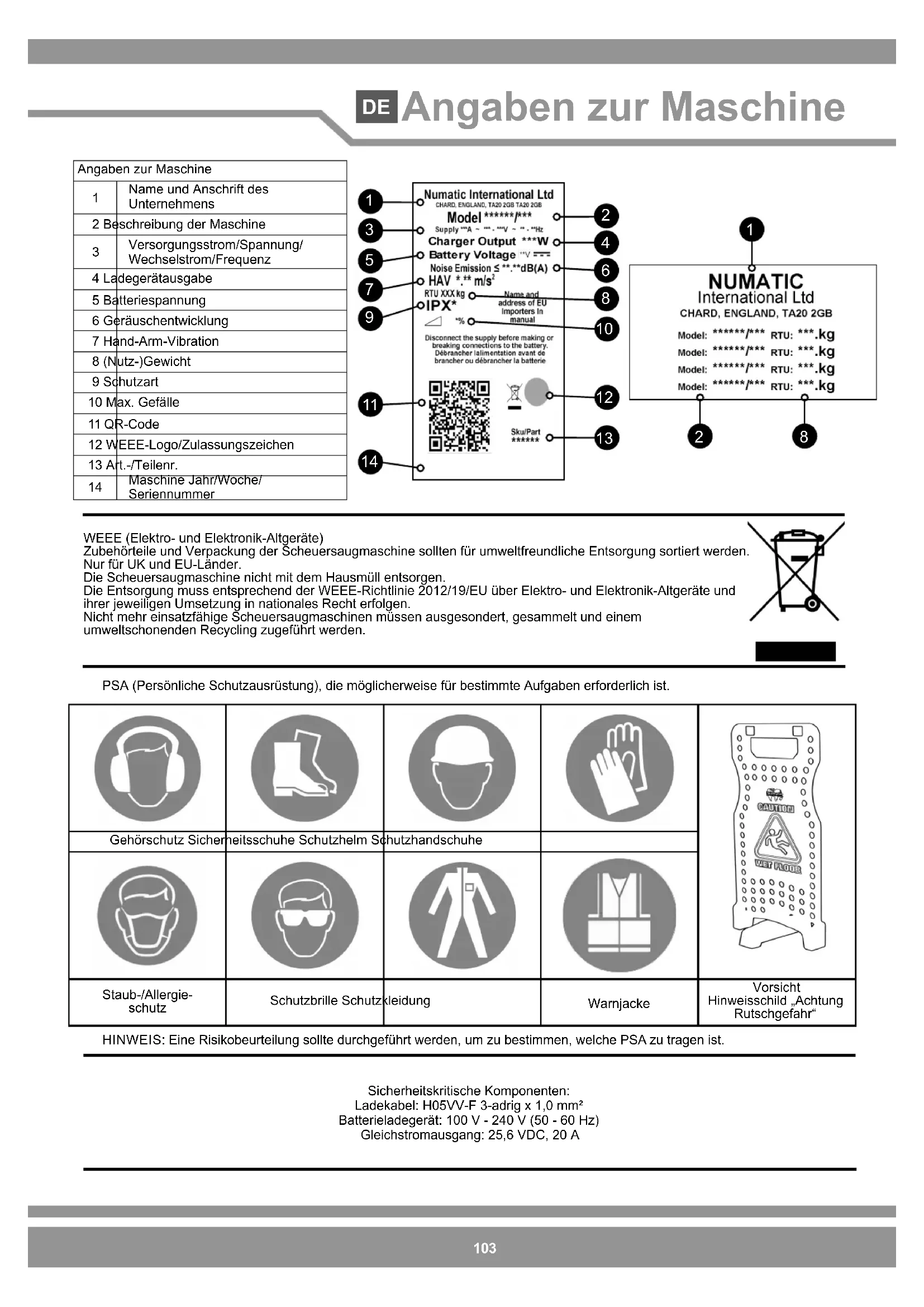 Sicherheitskritische Komponenten: Ladekabel: H05VV-F 3-adrig x 1,0 mm² Batterieladegerät: 100 V - 240 V (50 - 60 Hz) Gleichstromausgang: 25,6 VDC, 20 A WEEE (Elektro- und Elektronik-Altgeräte) Zubehörteile und Verpackung der Scheuersaugmaschine sollten für umweltfreundliche Entsorgung sortiert werden. Nur für UK und EU-Länder. Die Scheuersaugmaschine nicht mit dem Hausmüll entsorgen. Die Entsorgung muss entsprechend der WEEE-Richtlinie 2012/19/EU über Elektro- und Elektronik-Altgeräte und ihrer jeweiligen Umsetzung in nationales Recht erfolgen. Nicht mehr einsatzfähige Scheuersaugmaschinen müssen ausgesondert, gesammelt und einem umweltschonenden Recycling zugeführt werden. Gehörschutz Sicherheitsschuhe Schutzhelm Schutzhandschuhe Staub-/Allergie- schutz Schutzbrille Schutzkleidung Warnjacke Vorsicht Hinweisschild „Achtung Rutschgefahr“ PSA (Persönliche Schutzausrüstung), die möglicherweise für bestimmte Aufgaben erforderlich ist. HINWEIS: Eine Risikobeurteilung sollte durchgeführt werden, um zu bestimmen, welche PSA zu tragen ist.