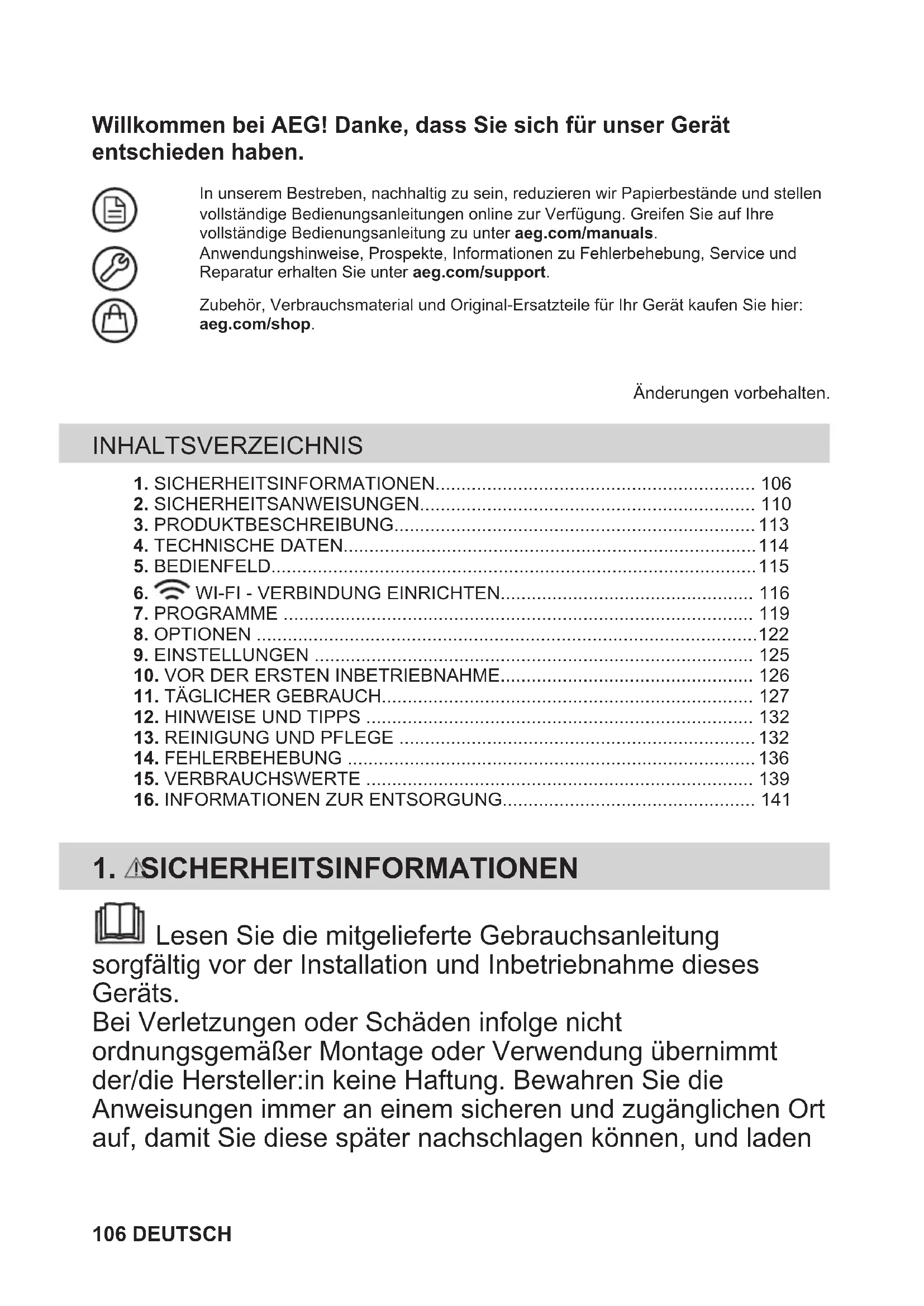 - Recyclez les matériaux portant le symbole . Déposez les emballages dans les conteneurs prévus à cet effet. Contribuez à la protection de l'environnement et à votre sécurité, recyclez vos produits électriques et électroniques. Ne jetez pas les appareils portant le symbole avec les ordures ménagères. Emmenez un tel produit dans votre centre local de recyclage ou contactez vos services municipaux. Concerne la France uniquement : FRANÇAIS 105Willkommen bei AEG! Danke, dass Sie sich für unser Gerät entschieden haben. In unserem Bestreben, nachhaltig zu sein, reduzieren wir Papierbestände und stellenvollständige Bedienungsanleitungen online zur Verfügung. Greifen Sie auf Ihrevollständige Bedienungsanleitung zu unter aeg.com/manuals.Anwendungshinweise, Prospekte, Informationen zu Fehlerbehebung, Service undReparatur erhalten Sie unter aeg.com/support.Zubehör, Verbrauchsmaterial und Original-Ersatzteile für Ihr Gerät kaufen Sie hier: aeg.com/shop.Änderungen vorbehalten. INHALTSVERZEICHNIS 1. SICHERHEITSINFORMATIONEN p. 1062