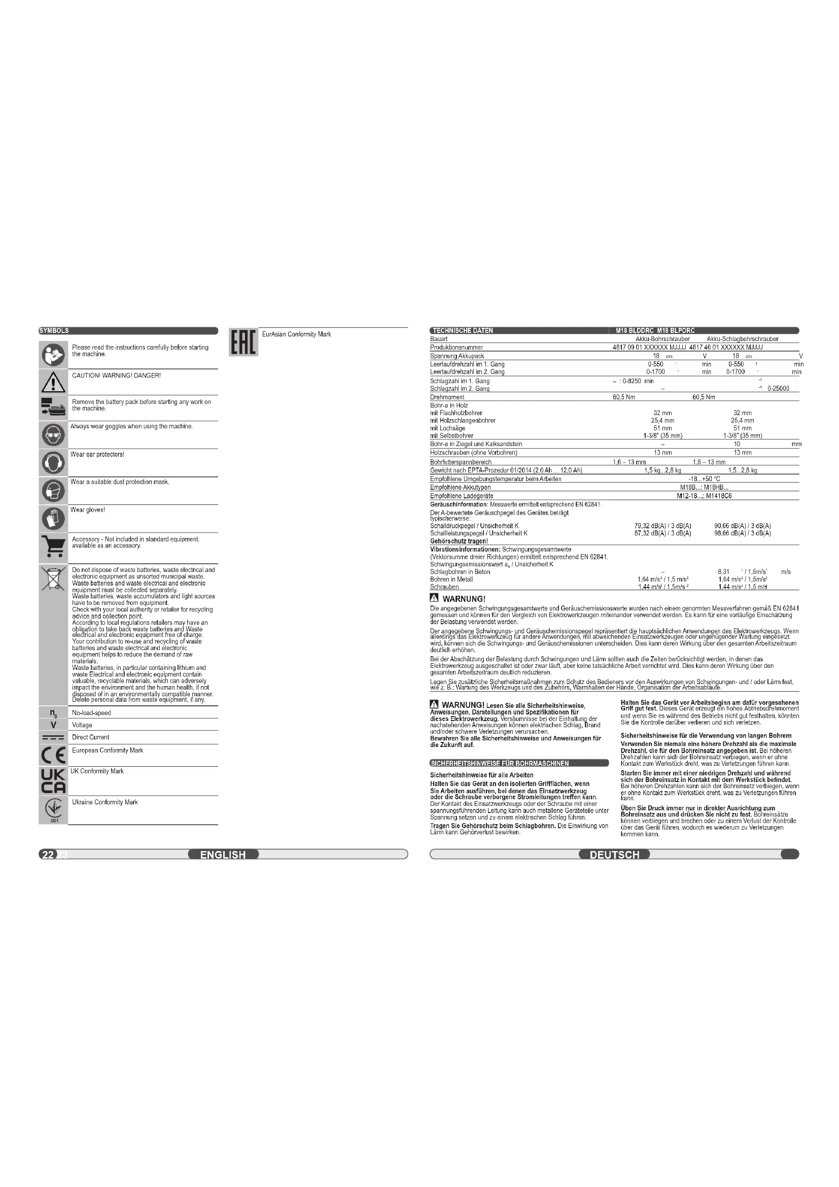 Sicherheitshinweise für alle Arbeiten Halten Sie das Gerät an den isolierten Griff fl ächen, wenn Sie Arbeiten ausfü hren, bei denen das Einsatzwerkzeug oder die Schraube verborgene Stromleitungen treff en kann. Der Kontakt des Einsatzwerkzeugs oder der Schraube mit einer spannungsführenden Leitung kann auch metallene Geräteteile unter Spannung setzen und zu einem elektrischen Schlag führen. Tragen Sie Gehörschutz beim Schlagbohren. Die Einwirkung von Lärm kann Gehörverlust bewirken. Halten Sie das Gerät vor Arbeitsbeginn am dafür vorgesehenen Griff gut fest. Dieses Gerät erzeugt ein hohes Abtriebsdrehmoment und wenn Sie es während des Betriebs nicht gut festhalten, könnten Sie die Kontrolle darüber verlieren und sich verletzen. Sicherheitshinweise für die Verwendung von langen Bohrern Verwenden Sie niemals eine höhere Drehzahl als die maximale Drehzahl, die für den Bohreinsatz angegeben ist. Bei höheren Drehzahlen kann sich der Bohreinsatz verbiegen, wenn er ohne Kontakt zum Werkstück dreht, was zu Verletzungen führen kann. Starten Sie immer mit einer niedrigen Drehzahl und während sich der Bohreinsatz in Kontakt mit dem Werkstück befi ndet. Bei höheren Drehzahlen kann sich der Bohreinsatz verbiegen, wenn er ohne Kontakt zum Werkstück dreht, was zu Verletzungen führen kann. Üben Sie Druck immer nur in direkter Ausrichtung zum Bohreinsatz aus und drücken Sie nicht zu fest. Bohreinsätze können verbiegen und brechen oder zu einem Verlust der Kontrolle über das Gerät führen, wodurch es wiederum zu Verletzungen kommen kann. WARNUNG! Die angegebenen Schwingungsgesamtwerte und Geräuschemissionswerte wurden nach einem genormten Messverfahren gemäß EN 62841 gemessen und können für den Vergleich von Elektrowerkzeugen miteinander verwendet werden. Es kann für eine vorläufi ge Einschätzung der Belastung verwendet werden. Der angegebene Schwingungs- und Geräuschemissionspegel repräsentiert die hauptsächlichen Anwendungen des Elektrowerkzeugs. Wenn allerdings das Elektrowerkzeug für andere Anwendungen, mit abweichenden Einsatzwerkzeugen oder ungenügender Wartung eingesetzt wird, können sich die Schwingungs- und Geräuschemissionen unterscheiden. Dies kann deren Wirkung über den gesamten Arbeitszeitraum deutlich erhöhen. Bei der Abschätzung der Belastung durch Schwingungen und Lärm sollten auch die Zeiten berücksichtigt werden, in denen das Elektrowerkzeug ausgeschaltet ist oder zwar läuft, aber keine tatsächliche Arbeit verrichtet wird. Dies kann deren Wirkung über den gesamten Arbeitszeitraum deutlich reduzieren. Legen Sie zusätzliche Sicherheitsmaßnahmen zum Schutz des Bedieners vor den Auswirkungen von Schwingungen- und / oder Lärm fest, wie z. B.: Wartung des Werkzeugs und des Zubehörs, Warmhalten der Hände, Organisation der Arbeitsabläufe. Akku-Bohrschrauber Akku-Schlagbohrschrauber EurAsian Conformity Mark24 25