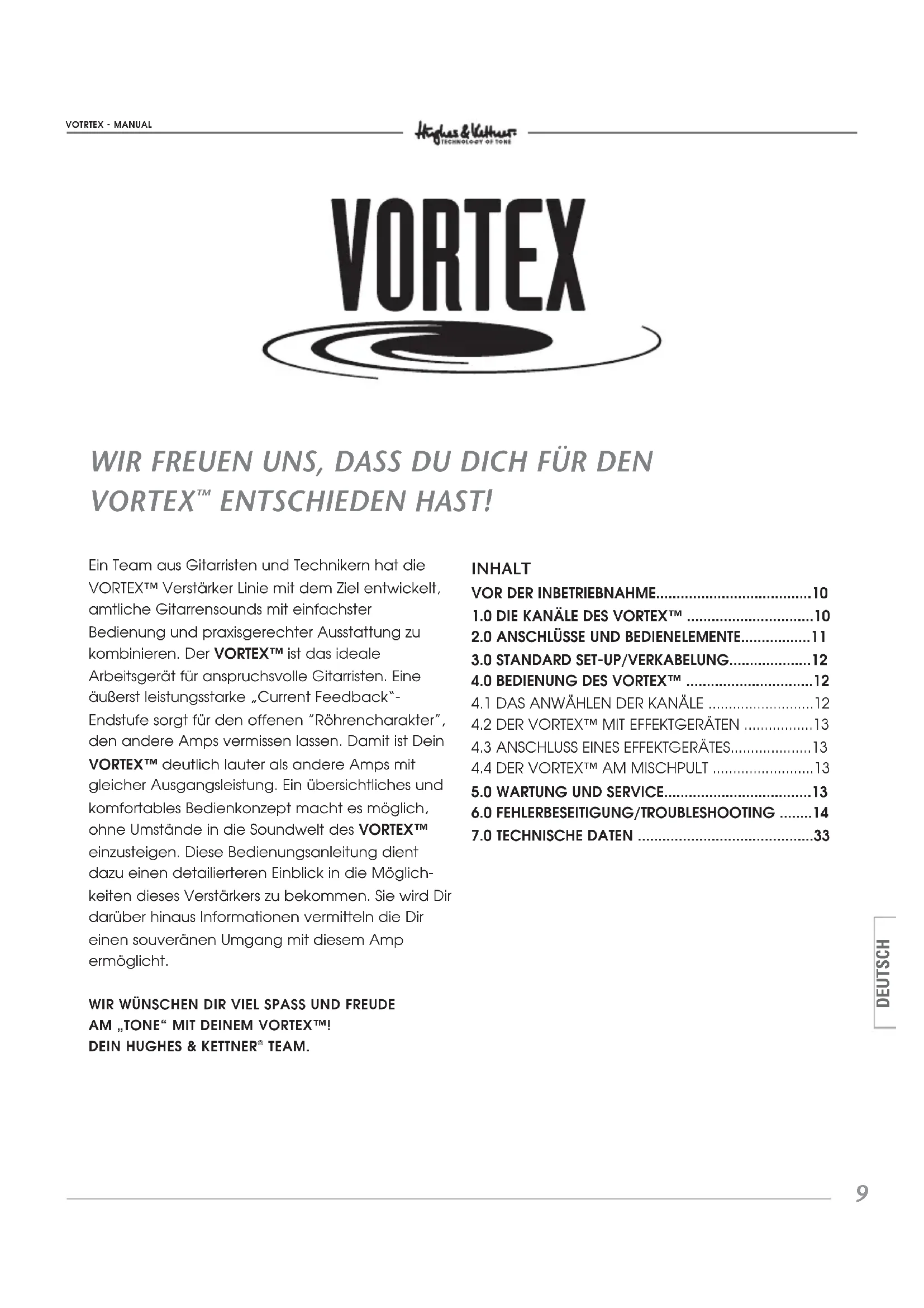DEUTSCH Ein Team aus Gitarristen und Technikern hat die VORTEX™ Verstärker Linie mit dem Ziel entwickelt, amtliche Gitarrensounds mit einfachster Bedienung und praxisgerechter Ausstattung zu kombinieren. Der VORTEX™ ist das ideale Arbeitsgerät für anspruchsvolle Gitarristen. Eine äußerst leistungsstarke „Current Feedback“- Endstufe sorgt für den offenen ”Röhrencharakter”, den andere Amps vermissen lassen. Damit ist Dein VORTEX™ deutlich lauter als andere Amps mit gleicher Ausgangsleistung. Ein übersichtliches und komfortables Bedienkonzept macht es möglich, ohne Umstände in die Soundwelt des VORTEX™ einzusteigen. Diese Bedienungsanleitung dient dazu einen detailierteren Einblick in die Möglich- keiten dieses Verstärkers zu bekommen. Sie wird Dir darüber hinaus Informationen vermitteln die Dir einen souveränen Umgang mit diesem Amp ermöglicht. WIR WÜNSCHEN DIR VIEL SPASS UND FREUDE AM „TONE“ MIT DEINEM VORTEX™! DEIN HUGHES & KETTNER TEAM. INHALT