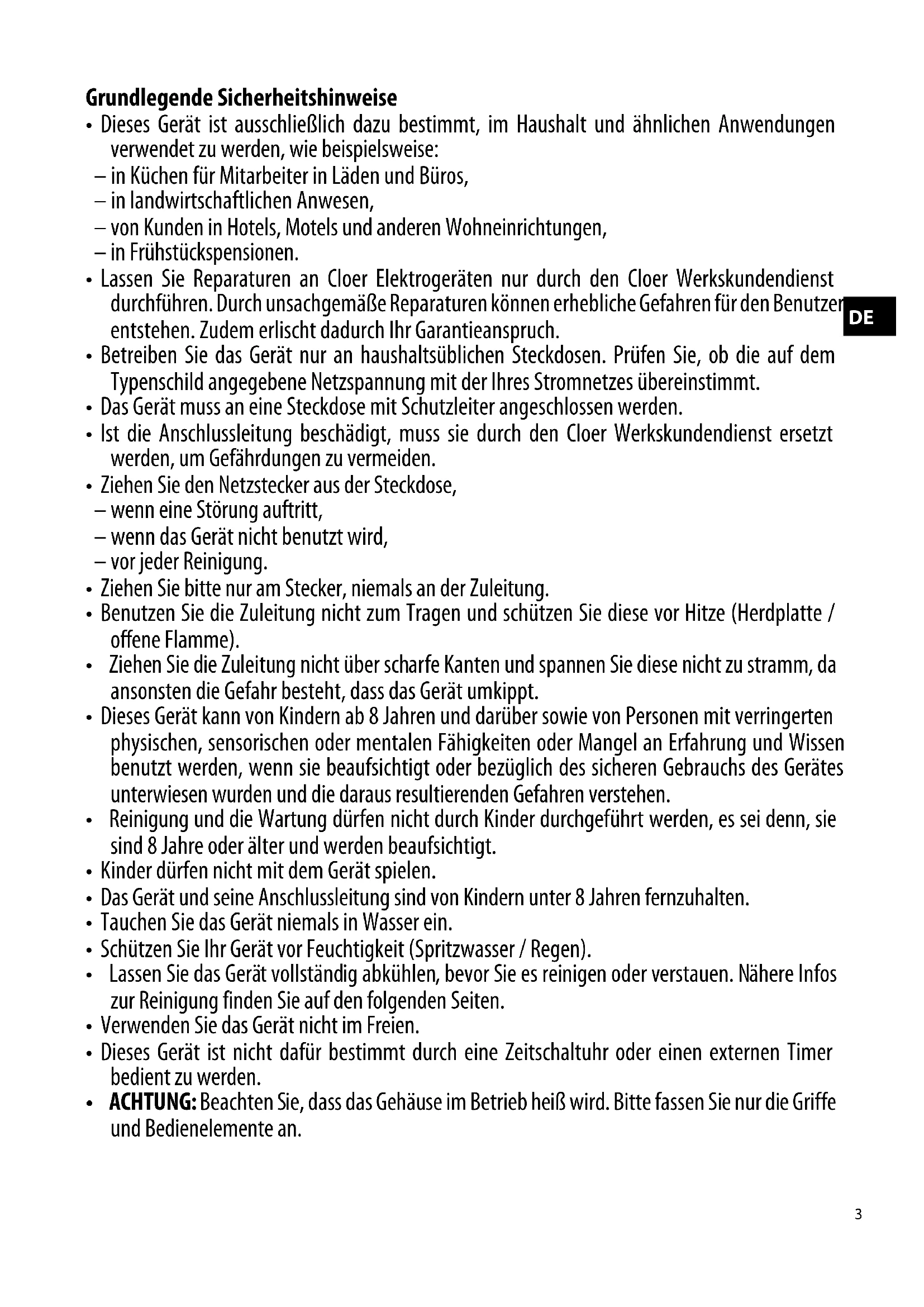 - Ist die Anschlussleitung beschädigt, muss sie durch den Cloer Werkskundendienst ersetzt werden, um Gefährdungen zu vermeiden.