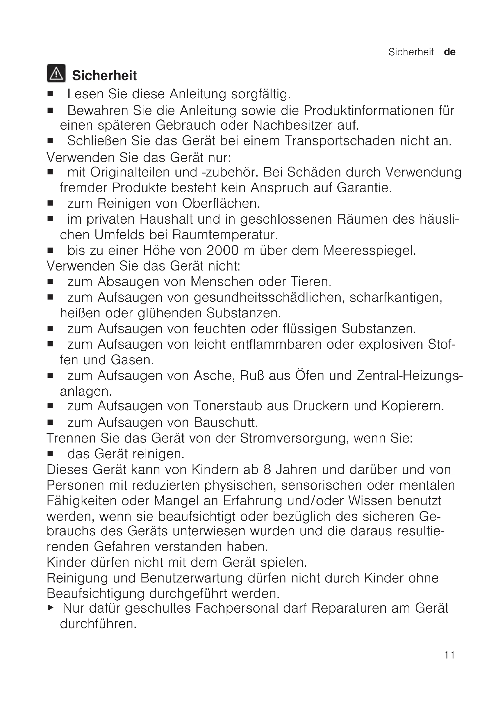 Sicherheit ¡ Lesen Sie diese Anleitung sorgfältig. ¡ Bewahren Sie die Anleitung sowie die Produktinformationen für einen späteren Gebrauch oder Nachbesitzer auf. ¡ Schließen Sie das Gerät bei einem Transportschaden nicht an. Verwenden Sie das Gerät nur: ¡ mit Originalteilen und -zubehör. Bei Schäden durch Verwendung fremder Produkte besteht kein Anspruch auf Garantie. ¡ zum Reinigen von Oberflächen. ¡ im privaten Haushalt und in geschlossenen Räumen des häusli- chen Umfelds bei Raumtemperatur. ¡ bis zu einer Höhe von 2000m über dem Meeresspiegel. Verwenden Sie das Gerät nicht: ¡ zum Absaugen von Menschen oder Tieren. ¡ zum Aufsaugen von gesundheitsschädlichen, scharfkantigen, heißen oder glühenden Substanzen. ¡ zum Aufsaugen von feuchten oder flüssigen Substanzen. ¡ zum Aufsaugen von leicht entflammbaren oder explosiven Stof- fen und Gasen. ¡ zum Aufsaugen von Asche, Ruß aus Öfen und Zentral-Heizungs- anlagen. ¡ zum Aufsaugen von Tonerstaub aus Druckern und Kopierern. ¡ zum Aufsaugen von Bauschutt. Trennen Sie das Gerät von der Stromversorgung, wenn Sie: ¡ das Gerät reinigen. Dieses Gerät kann von Kindern ab 8 Jahren und darüber und von Personen mit reduzierten physischen, sensorischen oder mentalen Fähigkeiten oder Mangel an Erfahrung und/oder Wissen benutzt werden, wenn sie beaufsichtigt oder bezüglich des sicheren Ge- brauchs des Geräts unterwiesen wurden und die daraus resultie- renden Gefahren verstanden haben. Kinder dürfen nicht mit dem Gerät spielen. Reinigung und Benutzerwartung dürfen nicht durch Kinder ohne Beaufsichtigung durchgeführt werden. ▶ Nur dafür geschultes Fachpersonal darf Reparaturen am Gerät durchführen.de Sicherheit