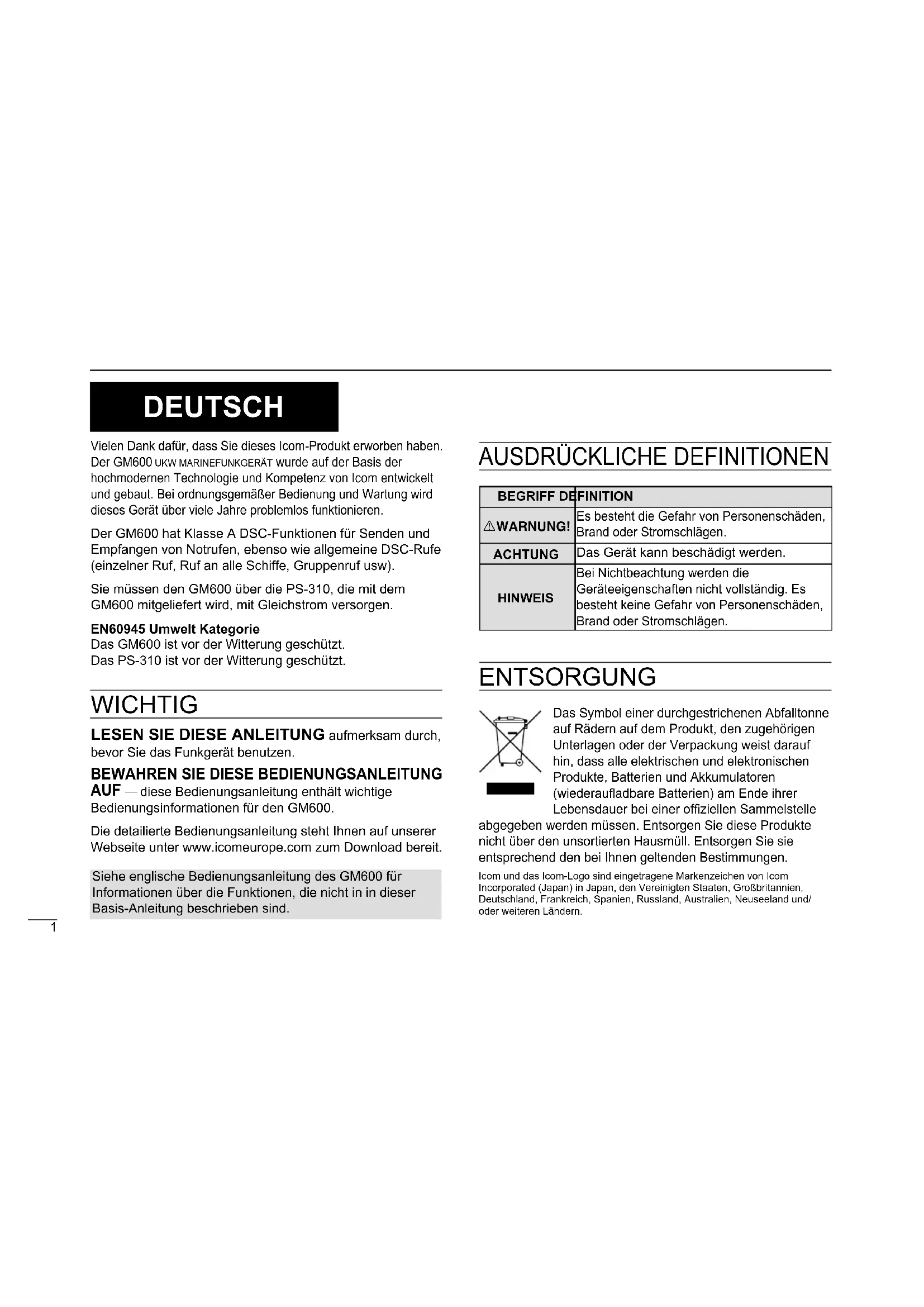 AUF — diese Bedienungsanleitung enthält wichtige Bedienungsinformationen für den GM600. Die detailierte Bedienungsanleitung steht Ihnen auf unserer Webseite unter www.icomeurope.com zum Download bereit. Icom und das Icom-Logo sind eingetragene Markenzeichen von Icom Incorporated (Japan) in Japan, den Vereinigten Staaten, Großbritannien, Deutschland, Frankreich, Spanien, Russland, Australien, Neuseeland und/ oder weiteren Ländern. Siehe englische Bedienungsanleitung des GM600 für Informationen über die Funktionen, die nicht in in dieser Basis-Anleitung beschrieben sind.