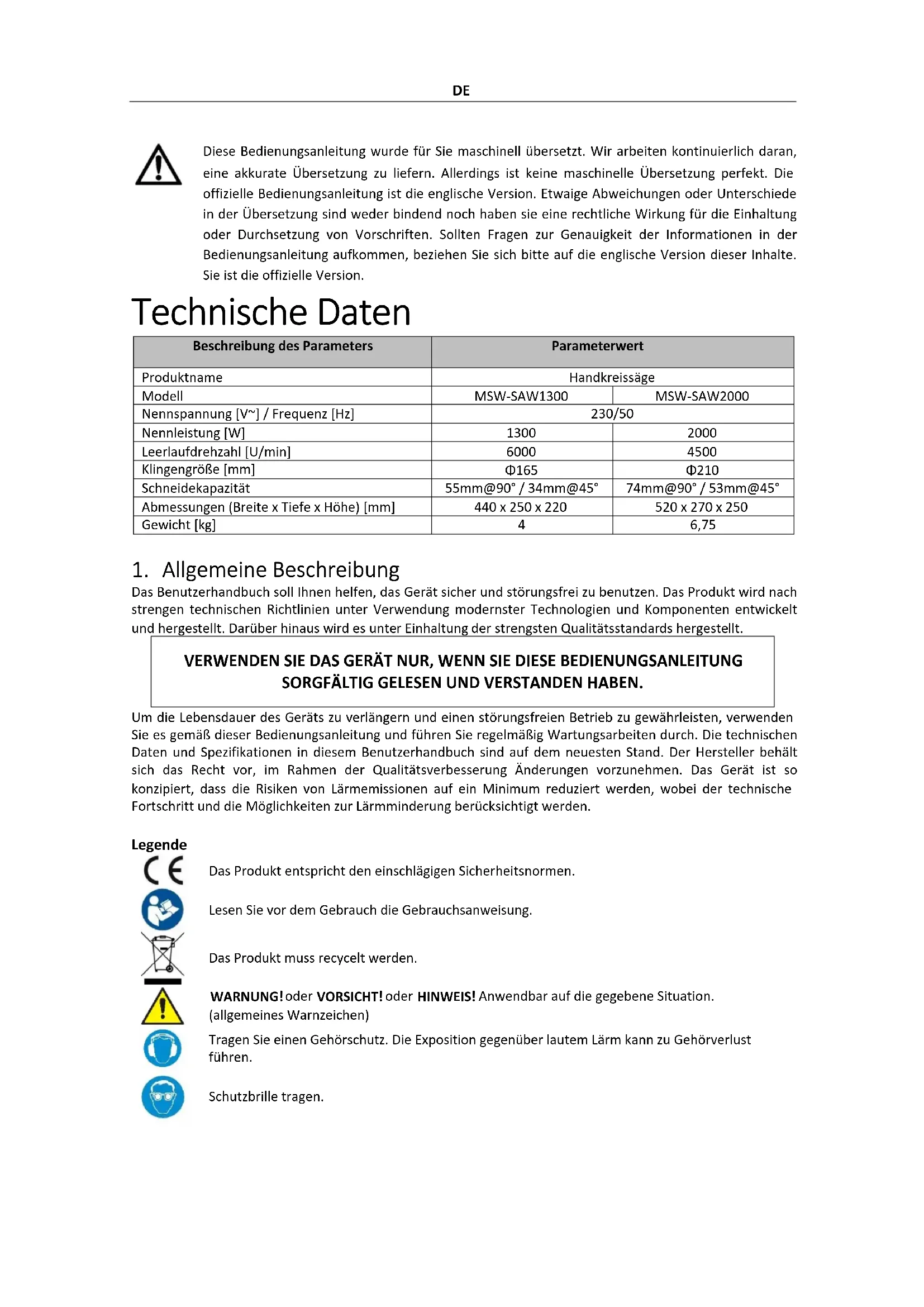 Adresa výrobcuDE Diese Bedienungsanleitung wurde für Sie maschinell übersetzt. Wir arbeiten kontinuierlich daran, eine akkurate Übersetzung zu liefern. Allerdings ist keine maschinelle Übersetzung perfekt. Die offizielle Bedienungsanleitung ist die englische Version. Etwaige Abweichungen oder Unterschiede in der Übersetzung sind weder bindend noch haben sie eine rechtliche Wirkung für die Einhaltung oder Durchsetzung von Vorschriften. Sollten Fragen zur Genauigkeit der Informationen in der Bedienungsanleitung aufkommen, beziehen Sie sich bitte auf die englische Version dieser Inhalte. Sie ist die offizielle Version. Technische Daten Beschreibung des Parameters Parameterwert Produktname Handkreissäge Modell MSW-SAW1300 MSW-SAW2000 Nennspannung [V~] / Frequenz [Hz] 230/50 Nennleistung [W]