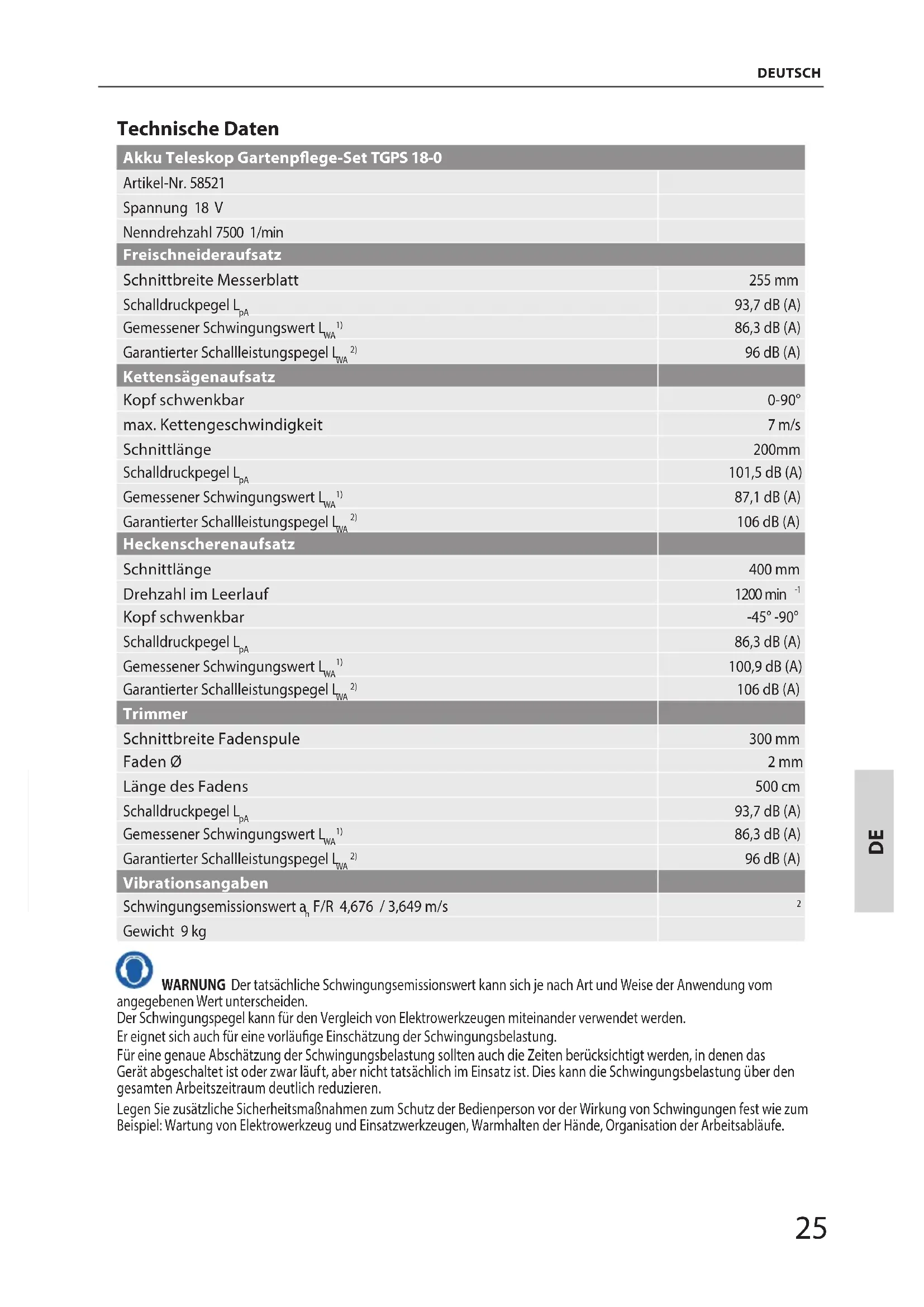 DEUTSCH Technische Daten Akku Teleskop Gartenpege-Set TGPS 18-0 Artikel-Nr. 58521 Spannung 18 V Nenndrehzahl 7500 1/min Freischneideraufsatz Schnittbreite Messerblatt 255 mm Schalldruckpegel L