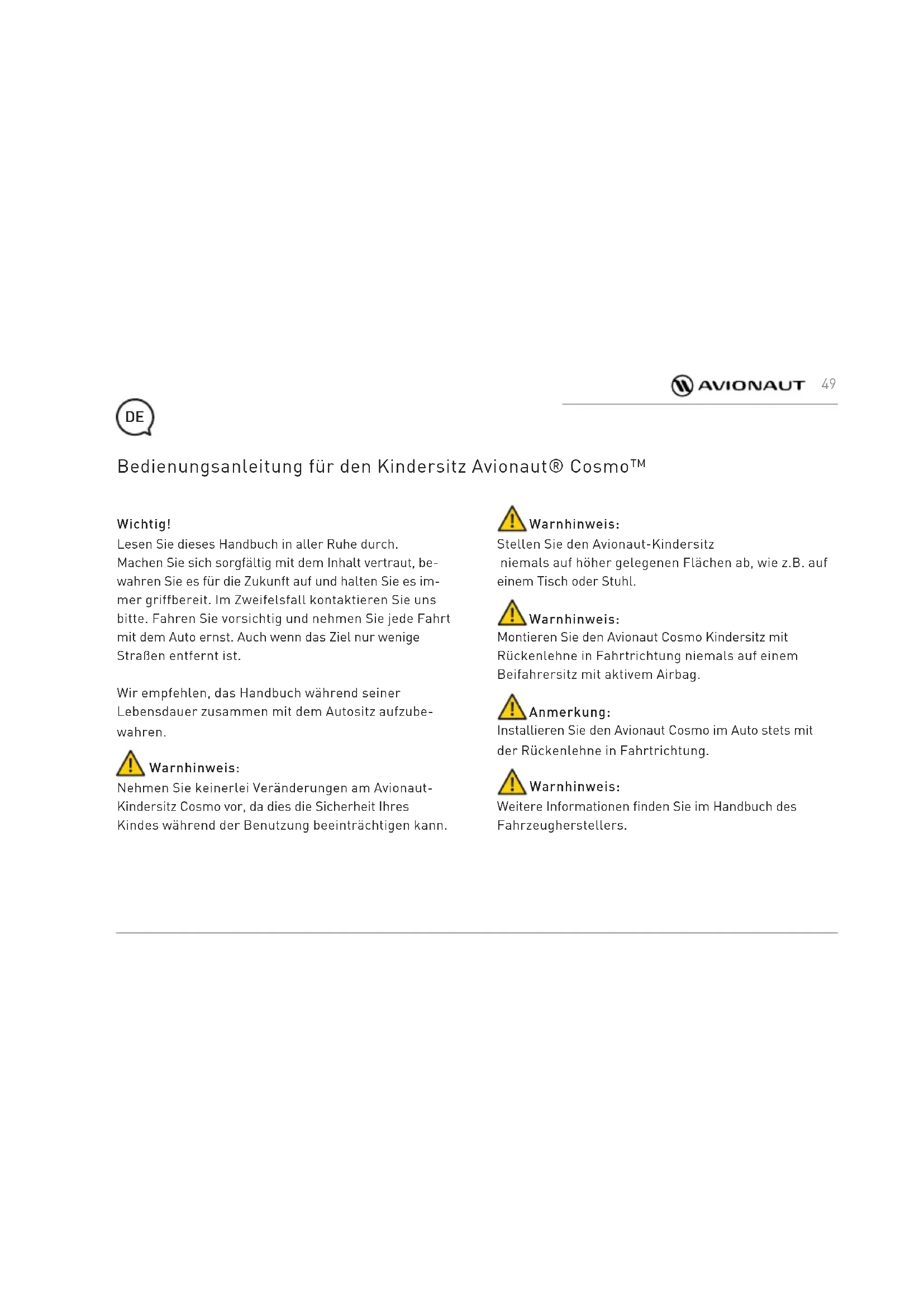 - Tato záruka byla připravená firmou Ł.KARWALA zaregistrovanou v Polsku. Adresa firmy: Szarlejka, ul. Lukaszewicza 172 42-130 Wreczyca Wielka, Polska (1) Zakoupené výrobky sodstraněnými nebo změněnými štítky nebo identifikačními čísly se považují za neautorizované. V souvislosti s tím, že autentičnost takových výrobků nelze 48Wichtig! Lesen Sie dieses Handbuch in aller Ruhe durch. Machen Sie sich sorgfältig mit dem Inhalt vertraut, be- wahren Sie es für die Zukunft auf und halten Sie es im- mer griffbereit. Im Zweifelsfall kontaktieren Sie uns bitte. Fahren Sie vorsichtig und nehmen Sie jede Fahrt mit dem Auto ernst. Auch wenn das Ziel nur wenige Straßen entfernt ist. Wir empfehlen, das Handbuch während seiner Lebensdauer zusammen mit dem Autositz aufzube- wahren. Warnhinweis: Nehmen Sie keinerlei Veränderungen am Avionaut- Kindersitz Cosmo vor, da dies die Sicherheit Ihres Kindes während der Benutzung beeinträchtigen kann. Bedienungsanleitung für den Kindersitz Avionaut® Cosmo™ Warnhinweis: Stellen Sie den Avionaut-Kindersitz niemals auf höher gelegenen Flächen ab, wie z.B. auf einem Tisch oder Stuhl. Warnhinweis: Montieren Sie den Avionaut Cosmo Kindersitz mit Rückenlehne in Fahrtrichtung niemals auf einem Beifahrersitz mit aktivem Airbag. Anmerkung: Installieren Sie den Avionaut Cosmo im Auto stets mit der Rückenlehne in Fahrtrichtung. Warnhinweis: Weitere Informationen finden Sie im Handbuch des Fahrzeugherstellers.