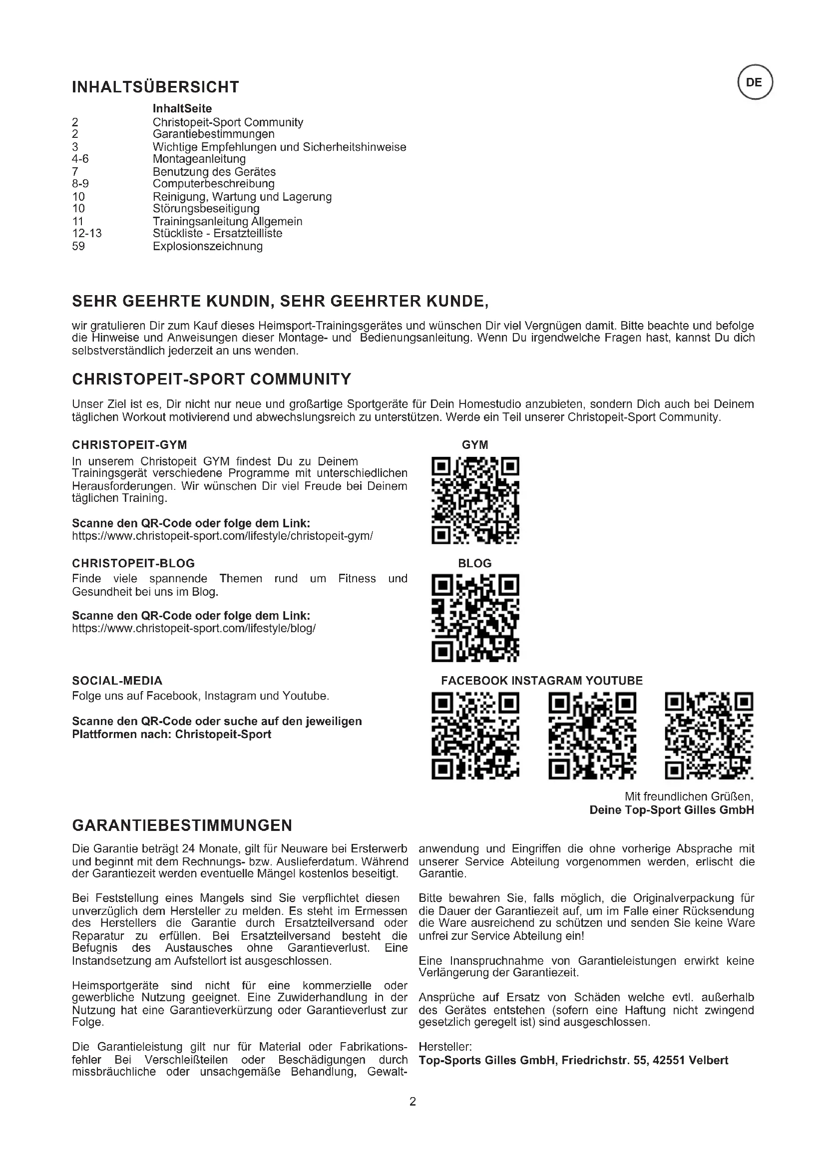 INHALTSÜBERSICHT SEHR GEEHRTE KUNDIN, SEHR GEEHRTER KUNDE, wir gratulieren Dir zum Kauf dieses Heimsport-Trainingsgerätes und wünschen Dir viel Vergnügen damit. Bitte beachte und befolge die Hinweise und Anweisungen dieser Montage- und Bedienungsanleitung. Wenn Du irgendwelche Fragen hast, kannst Du dich selbstverständlich jederzeit an uns wenden. Mit freundlichen Grüßen, Deine Top-Sport Gilles GmbH CHRISTOPEIT-GYM CHRISTOPEIT-BLOG SOCIAL-MEDIA CHRISTOPEIT-SPORT COMMUNITY In unserem Christopeit GYM ndest Du zu Deinem Trainingsgerät verschiedene Programme mit unterschiedlichen Herausforderungen. Wir wünschen Dir viel Freude bei Deinem täglichen Training. Scanne den QR-Code oder folge dem Link: https://www.christopeit-sport.com/lifestyle/christopeit-gym/ Unser Ziel ist es, Dir nicht nur neue und großartige Sportgeräte für Dein Homestudio anzubieten, sondern Dich auch bei Deinem täglichen Workout motivierend und abwechslungsreich zu unterstützen. Werde ein Teil unserer Christopeit-Sport Community. Folge uns auf Facebook, Instagram und Youtube. Scanne den QR-Code oder suche auf den jeweiligen Plattformen nach: Christopeit-Sport Finde viele spannende Themen rund um Fitness und Gesundheit bei uns im Blog. Scanne den QR-Code oder folge dem Link: https://www.christopeit-sport.com/lifestyle/blog/ InhaltSeite GYM BLOG