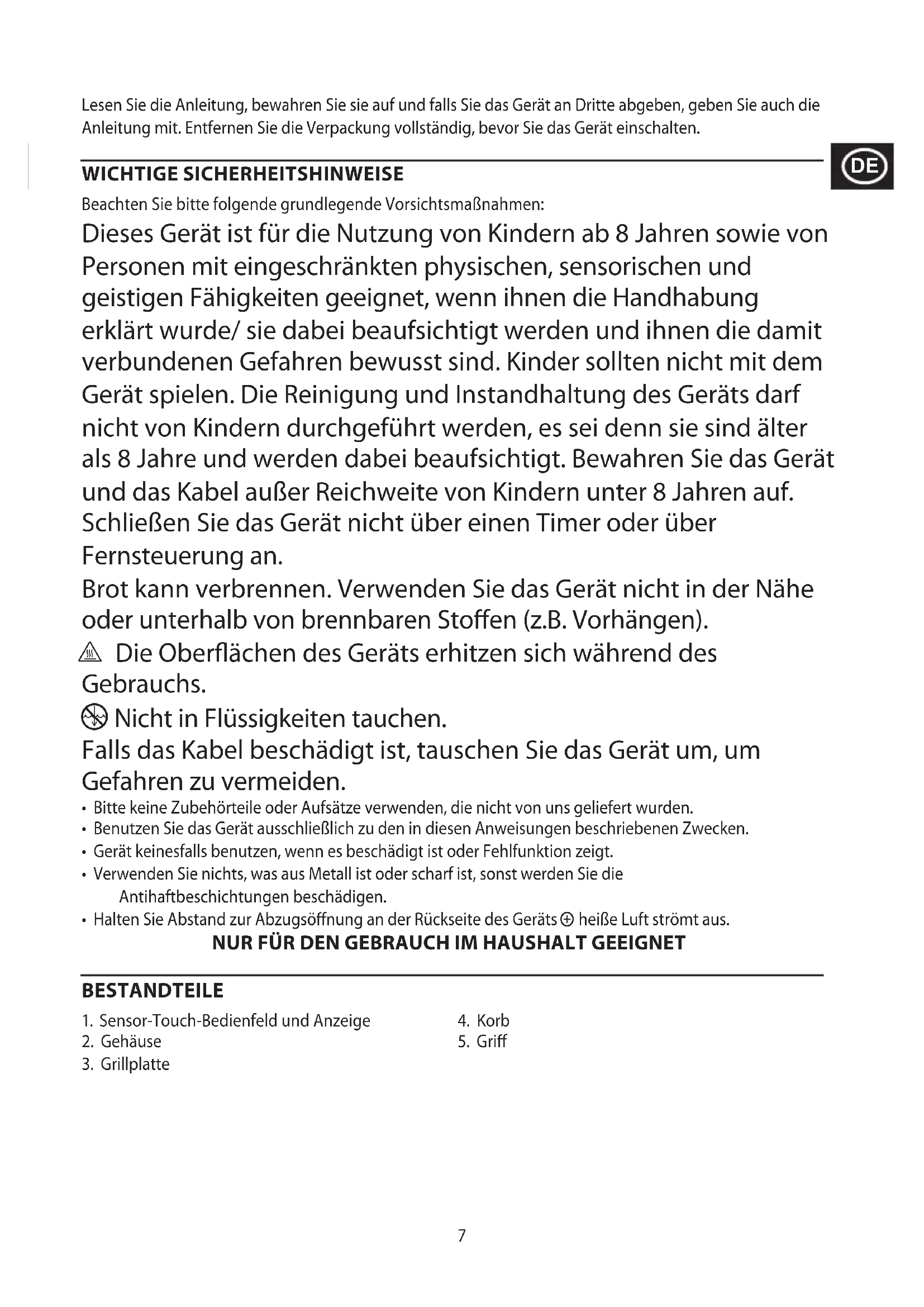 To avoid environmental and health problems due to hazardous substances, appliances and rechargeable and non-rechargeable batteries marked with one of these symbols must not be disposed of with unsorted municipal waste. Always dispose of electrical and electronic products and, where applicable, rechargeable and non-rechargeable batteries, at an appropriate official recycling/collection point.7 Lesen Sie die Anleitung, bewahren Sie sie auf und falls Sie das Gerät an Dritte abgeben, geben Sie auch die Anleitung mit. Entfernen Sie die Verpackung vollständig, bevor Sie das Gerät einschalten. WICHTIGE SICHERHEITSHINWEISE Beachten Sie bitte folgende grundlegende Vorsichtsmaßnahmen: Dieses Gerät ist für die Nutzung von Kindern ab 8 Jahren sowie von Personen mit eingeschränkten physischen, sensorischen und geistigen Fähigkeiten geeignet, wenn ihnen die Handhabung erklärt wurde/ sie dabei beaufsichtigt werden und ihnen die damit verbundenen Gefahren bewusst sind. Kinder sollten nicht mit dem Gerät spielen. Die Reinigung und Instandhaltung des Geräts darf nicht von Kindern durchgeführt werden, es sei denn sie sind älter als 8 Jahre und werden dabei beaufsichtigt. Bewahren Sie das Gerät und das Kabel außer Reichweite von Kindern unter 8 Jahren auf. Schließen Sie das Gerät nicht über einen Timer oder über Fernsteuerung an. Brot kann verbrennen. Verwenden Sie das Gerät nicht in der Nähe oder unterhalb von brennbaren Stoffen (z.B. Vorhängen). ¬ Die Oberflächen des Geräts erhitzen sich während des Gebrauchs. i Nicht in Flüssigkeiten tauchen. Falls das Kabel beschädigt ist, tauschen Sie das Gerät um, um Gefahren zu vermeiden.