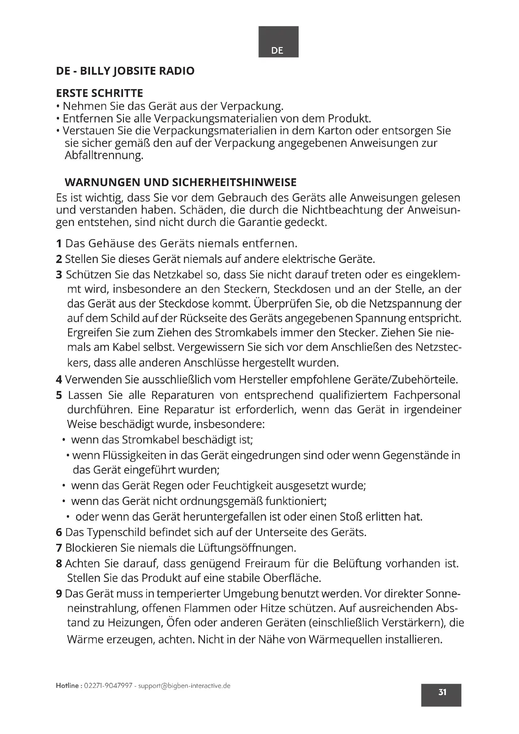 Hotline : 02271-9047997 - support@bigben-interactive.de 100, rue Gilles de Gennes 37310 TAUXIGNY FRANCE Made outside EU TECHNISCHER SUPPORT METRONIC : 02271-9047997. Halten Sie bei jedem Anruf die folgenden Informationen bereit: Billy Jobsite radio (477217) www.metronic.com/a/garantie.php Betreiben Sie das Gerät nicht über einen längeren Zeitraum mit hoher Lautstärke, um eine mögliche Gehörschädigung zu vermeiden Wechselstrom Innenbereich Doppelte oder verstärkte Isolierung Der Unterzeichner, METRONIC, erklärt, dass die Funkanlage des Typs Notfunk-Dy- namo (477217) entspricht der Richtlinie 2014/53/EU. Der vollständige Text der EU-Konformitätserklärung ist unter der folgenden Internetadresse abrufbar : https://medias.metronic.com/doc/477217-ncg3cf-doc.pdf Ausschließlich zur Verwendung im Dieses Logo bedeutet, dass nicht mehr funktionsfähige Geräte nicht mit dem Hausmüll entsorgt werden dürfen. Möglicherweise enthaltene Gefahrstoe können der Gesundheit und der Umwelt schaden. Bringen Sie diese Geräte zu Ihrem Händler zurück oder entsorgen Sie sie über die Sammelstellen in Ihrer Stadt bzw. Gemeinde. Gleichstrom NORMENKENNZEICHNUNGEN, U. A. , AUF DER UNTERSEITE DES GERÄTS. Hinweis: Die maximale Verbindungsentfernung beträgt ca. 10 Meter. Bitte stellen Sie Ihren Bluetooth-Lautsprecher so nahe wie möglich an das Gerät, um Störungen der Verbindung zu vermeiden.Hotline : customerservice@bigben-interactive.nl