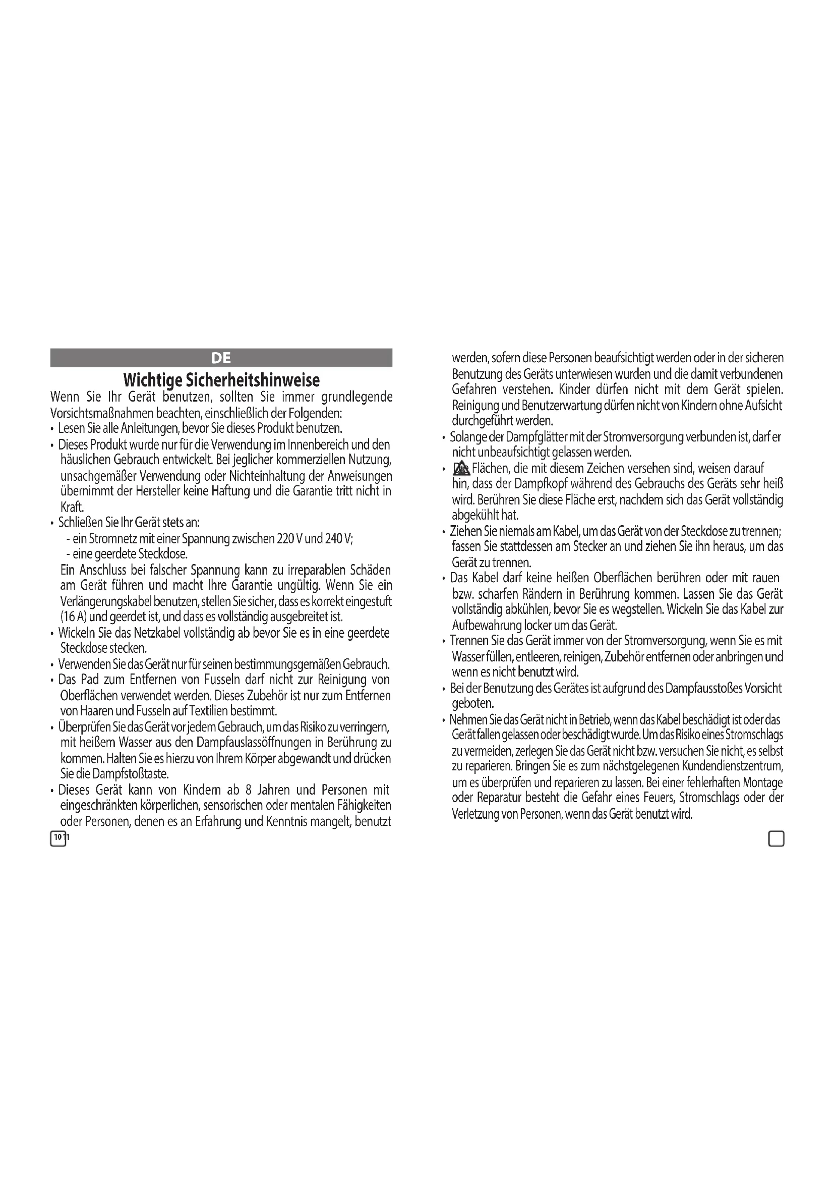 - Solange der Dampfglätter mit der Stromversorgung verbunden ist, darf er nicht unbeaufsichtigt gelassen werden.
