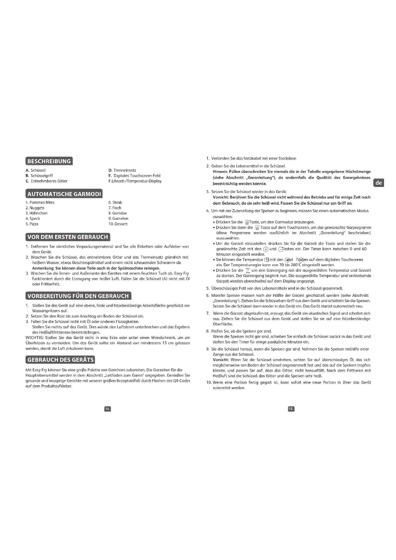 BESCHREIBUNG A. Schüssel B. Schüsselgriff C. Entnehmbares Gitter D. Trenneinsatz E. Digitales Touchscreen-Feld F. Uhrzeit-/Temperatur-Display AUTOMATISCHE GARMODI