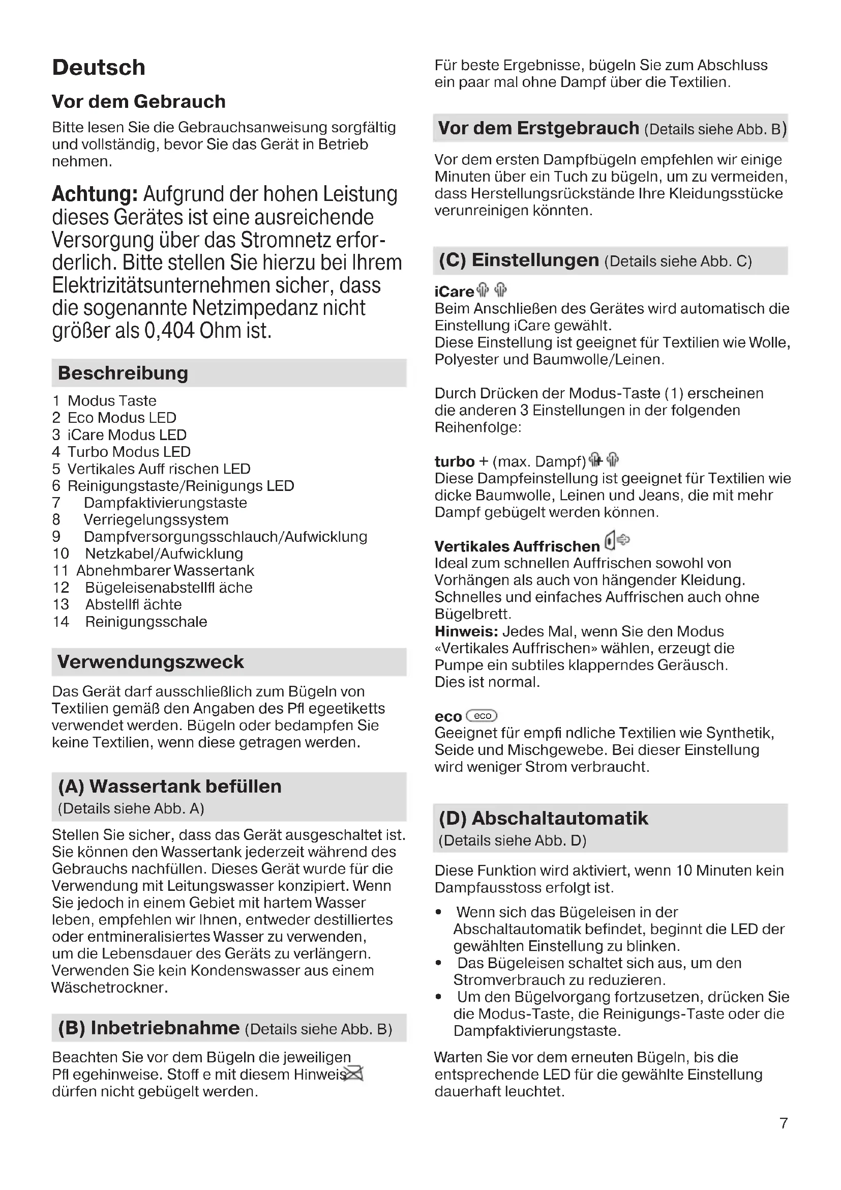 5712812441_03_IS_25xx_INT.indd 6 23.11.22 13:267 Deutsch Vor dem Gebrauch Bitte lesen Sie die Gebrauchsanweisung sorgfältig und vollständig, bevor Sie das Gerät in Betrieb nehmen. Achtung: Aufgrund der hohen Leistung dieses Gerätes ist eine ausreichende Versorgung über das Stromnetz erfor- derlich. Bitte stellen Sie hierzu bei Ihrem Elektrizitätsunternehmen sicher, dass die sogenannte Netzimpedanz nicht größer als 0,404 Ohm ist. Beschreibung 1 Modus Taste 2 Eco Modus LED 3 iCare Modus LED 4 Turbo Modus LED 5 Vertikales Auff rischen LED 6 Reinigungstaste/Reinigungs LED 7 Dampfaktivierungstaste 8 Verriegelungssystem 9 Dampfversorgungsschlauch/Aufwicklung 10 Netzkabel/Aufwicklung 11 Abnehmbarer Wassertank 12 Bügeleisenabstellfl äche 13 Abstellfl ächte 14 Reinigungsschale Verwendungszweck Das Gerät darf ausschließlich zum Bügeln von Textilien gemäß den Angaben des Pfl egeetiketts verwendet werden. Bügeln oder bedampfen Sie keine Textilien, wenn diese getragen werden. (A) Wassertank befüllen (Details siehe Abb. A) Stellen Sie sicher, dass das Gerät ausgeschaltet ist. Sie können den Wassertank jederzeit während des Gebrauchs nachfüllen. Dieses Gerät wurde für die Verwendung mit Leitungswasser konzipiert. Wenn Sie jedoch in einem Gebiet mit hartem Wasser leben, empfehlen wir Ihnen, entweder destilliertes oder entmineralisiertes Wasser zu verwenden, um die Lebensdauer des Geräts zu verlängern. Verwenden Sie kein Kondenswasser aus einem Wäschetrockner. (B) Inbetriebnahme (Details siehe Abb. B) Beachten Sie vor dem Bügeln die jeweiligen Pfl egehinweise. Stoff e mit diesem Hinweis dürfen nicht gebügelt werden. Für beste Ergebnisse, bügeln Sie zum Abschluss ein paar mal ohne Dampf über die Textilien. Vor dem Erstgebrauch (Details siehe Abb. B) Vor dem ersten Dampfbügeln empfehlen wir einige Minuten über ein Tuch zu bügeln, um zu vermeiden, dass Herstellungsrückstände Ihre Kleidungsstücke verunreinigen könnten. (C) Einstellungen (Details siehe Abb. C) iCare Beim Anschließen des Gerätes wird automatisch die Einstellung iCare gewählt. Diese Einstellung ist geeignet für Textilien wie Wolle, Polyester und Baumwolle/Leinen. Durch Drücken der Modus-Taste (1) erscheinen die anderen 3 Einstellungen in der folgenden Reihenfolge: turbo + (max. Dampf) + Diese Dampfeinstellung ist geeignet für Textilien wie dicke Baumwolle, Leinen und Jeans, die mit mehr Dampf gebügelt werden können. Vertikales Auffrischen Ideal zum schnellen Auffrischen sowohl von Vorhängen als auch von hängender Kleidung. Schnelles und einfaches Auffrischen auch ohne Bügelbrett. Hinweis: Jedes Mal, wenn Sie den Modus «Vertikales Auffrischen» wählen, erzeugt die Pumpe ein subtiles klapperndes Geräusch. Dies ist normal. eco eco Geeignet für empfi ndliche Textilien wie Synthetik, Seide und Mischgewebe. Bei dieser Einstellung wird weniger Strom verbraucht. (D) Abschaltautomatik (Details siehe Abb. D) Diese Funktion wird aktiviert, wenn 10 Minuten kein Dampfausstoss erfolgt ist.