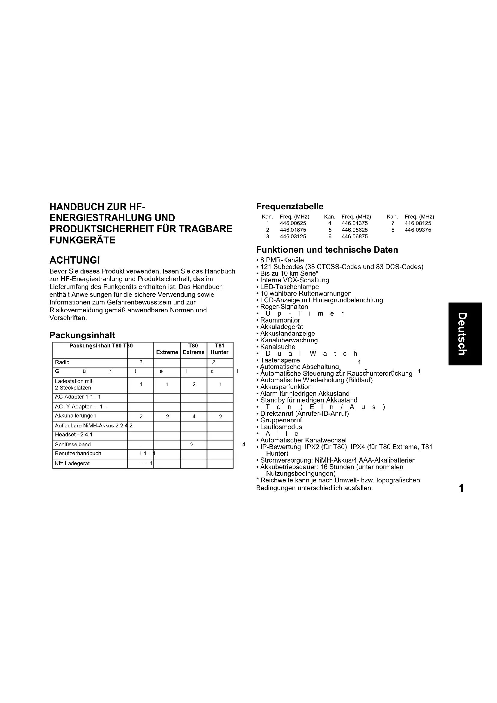 - Reichweite kann je nach Umwelt- bzw. topografischen Bedingungen unterschiedlich ausfallen. Packungsinhalt T80 T80 Extreme T80 Extreme T81 HunterRadio 2 2 4 1Gürtelclip 2241Ladestation mit 2 Steckplätzen AC-Adapter 1 1 - 1AC- Y-Adapter - - 1 -Akkuhalterungen Aufladbare NiMH-Akkus 2 2 4 2Headset - 2 4 1Schlüsselband - 2 4 1Benutzerhandbuch 1 1 1 1Kfz-Ladegerät - - - 1 Kan. Freq. (MHz) Kan. Freq. (MHz) Kan. Freq. (MHz)