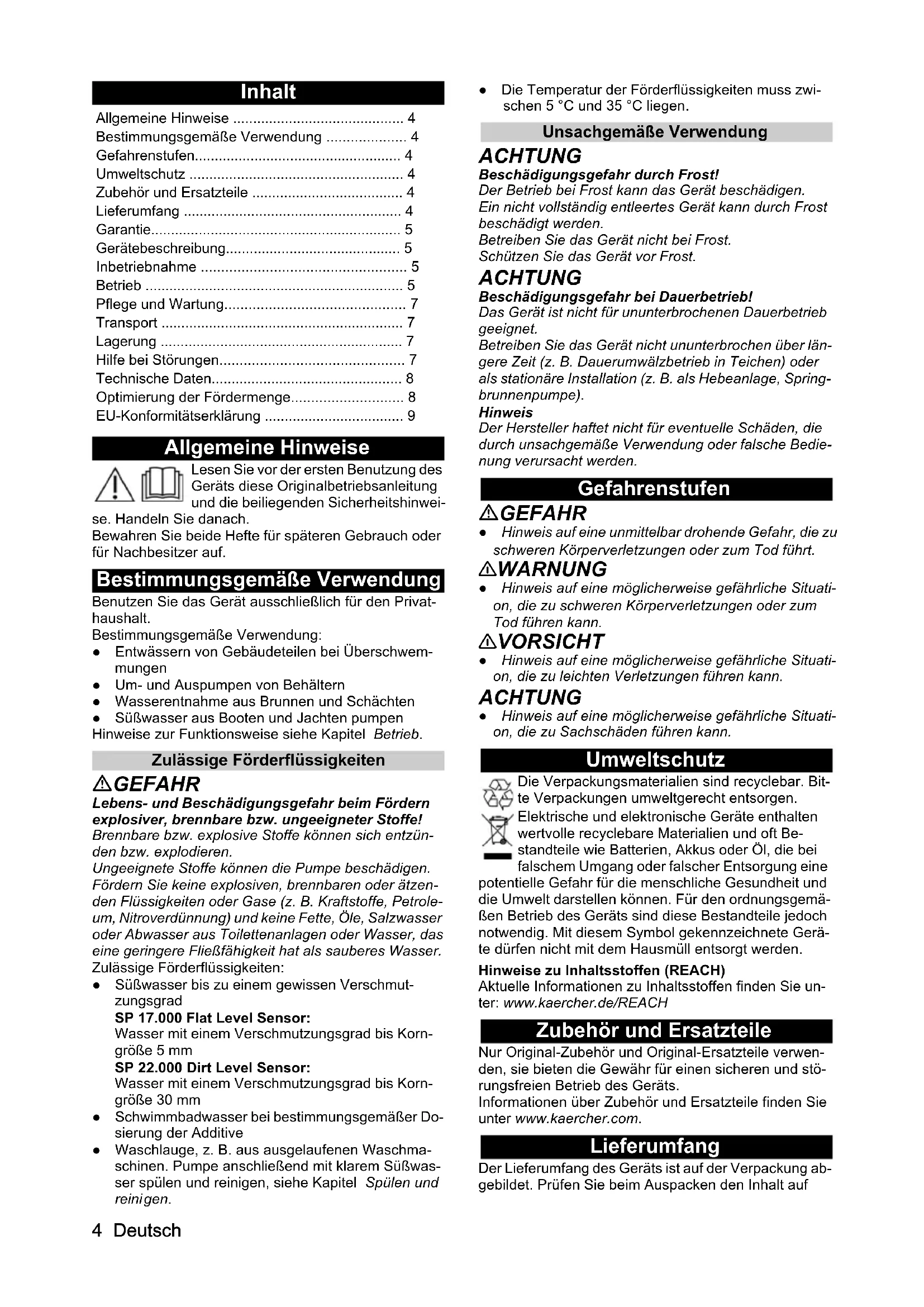 • 156AB C D E F G H4 Deutsch Inhalt Allgemeine Hinweise Lesen Sie vor der ersten Benutzung des Geräts diese Originalbetriebsanleitung und die beiliegenden Sicherheitshinwei- se. Handeln Sie danach. Bewahren Sie beide Hefte für späteren Gebrauch oder für Nachbesitzer auf. Bestimmungsgemäße Verwendung Benutzen Sie das Gerät ausschließlich für den Privat- haushalt. Bestimmungsgemäße Verwendung: ● Entwässern von Gebäudeteilen bei Überschwem- mungen ● Um- und Auspumpen von Behältern ● Wasserentnahme aus Brunnen und Schächten ● Süßwasser aus Booten und Jachten pumpen Hinweise zur Funktionsweise siehe Kapitel Betrieb. Zulässige Förderflüssigkeiten GEFAHR Lebens- und Beschädigungsgefahr beim Fördern explosiver, brennbare bzw. ungeeigneter Stoffe! Brennbare bzw. explosive Stoffe können sich entzün- den bzw. explodieren. Ungeeignete Stoffe können die Pumpe beschädigen. Fördern Sie keine explosiven, brennbaren oder ätzen- den Flüssigkeiten oder Gase (z. B. Kraftstoffe, Petrole- um, Nitroverdünnung) und keine Fette, Öle, Salzwasser oder Abwasser aus Toilettenanlagen oder Wasser, das eine geringere Fließfähigkeit hat als sauberes Wasser. Zulässige Förderflüssigkeiten: ● Süßwasser bis zu einem gewissen Verschmut- zungsgrad SP 17.000 Flat Level Sensor: Wasser mit einem Verschmutzungsgrad bis Korn- größe 5 mm SP 22.000 Dirt Level Sensor: Wasser mit einem Verschmutzungsgrad bis Korn- größe 30 mm ● Schwimmbadwasser bei bestimmungsgemäßer Do- sierung der Additive ● Waschlauge, z. B. aus ausgelaufenen Waschma- schinen. Pumpe anschließend mit klarem Süßwas- ser spülen und reinigen, siehe Kapitel Spülen und reini gen. ● Die Temperatur der Förderflüssigkeiten muss zwi- schen 5 °C und 35 °C liegen. Unsachgemäße Verwendung ACHTUNG Beschädigungsgefahr durch Frost! Der Betrieb bei Frost kann das Gerät beschädigen. Ein nicht vollständig entleertes Gerät kann durch Frost beschädigt werden. Betreiben Sie das Gerät nicht bei Frost. Schützen Sie das Gerät vor Frost. ACHTUNG Beschädigungsgefahr bei Dauerbetrieb! Das Gerät ist nicht für ununterbrochenen Dauerbetrieb geeignet. Betreiben Sie das Gerät nicht ununterbrochen über län- gere Zeit (z. B. Dauerumwälzbetrieb in Teichen) oder als stationäre Installation (z. B. als Hebeanlage, Spring- brunnenpumpe). Hinweis Der Hersteller haftet nicht für eventuelle Schäden, die durch unsachgemäße Verwendung oder falsche Bedie- nung verursacht werden. Gefahrenstufen GEFAHR ● Hinweis auf eine unmittelbar drohende Gefahr, die zu schweren Körperverletzungen oder zum Tod führt. 몇 WARNUNG ● Hinweis auf eine möglicherweise gefährliche Situati- on, die zu schweren Körperverletzungen oder zum Tod führen kann. 몇 VORSICHT ● Hinweis auf eine möglicherweise gefährliche Situati- on, die zu leichten Verletzungen führen kann. ACHTUNG ● Hinweis auf eine möglicherweise gefährliche Situati- on, die zu Sachschäden führen kann. Umweltschutz Die Verpackungsmaterialien sind recyclebar. Bit- te Verpackungen umweltgerecht entsorgen. Elektrische und elektronische Geräte enthalten wertvolle recyclebare Materialien und oft Be- standteile wie Batterien, Akkus oder Öl, die bei falschem Umgang oder falscher Entsorgung eine potentielle Gefahr für die menschliche Gesundheit und die Umwelt darstellen können. Für den ordnungsgemä- ßen Betrieb des Geräts sind diese Bestandteile jedoch notwendig. Mit diesem Symbol gekennzeichnete Gerä- te dürfen nicht mit dem Hausmüll entsorgt werden. Hinweise zu Inhaltsstoffen (REACH) Aktuelle Informationen zu Inhaltsstoffen finden Sie un- ter: www.kaercher.de/REACH Zubehör und Ersatzteile Nur Original-Zubehör und Original-Ersatzteile verwen- den, sie bieten die Gewähr für einen sicheren und stö- rungsfreien Betrieb des Geräts. Informationen über Zubehör und Ersatzteile finden Sie unter www.kaercher.com. Lieferumfang Der Lieferumfang des Geräts ist auf der Verpackung ab- gebildet. Prüfen Sie beim Auspacken den Inhalt auf Allgemeine Hinweise p. 4