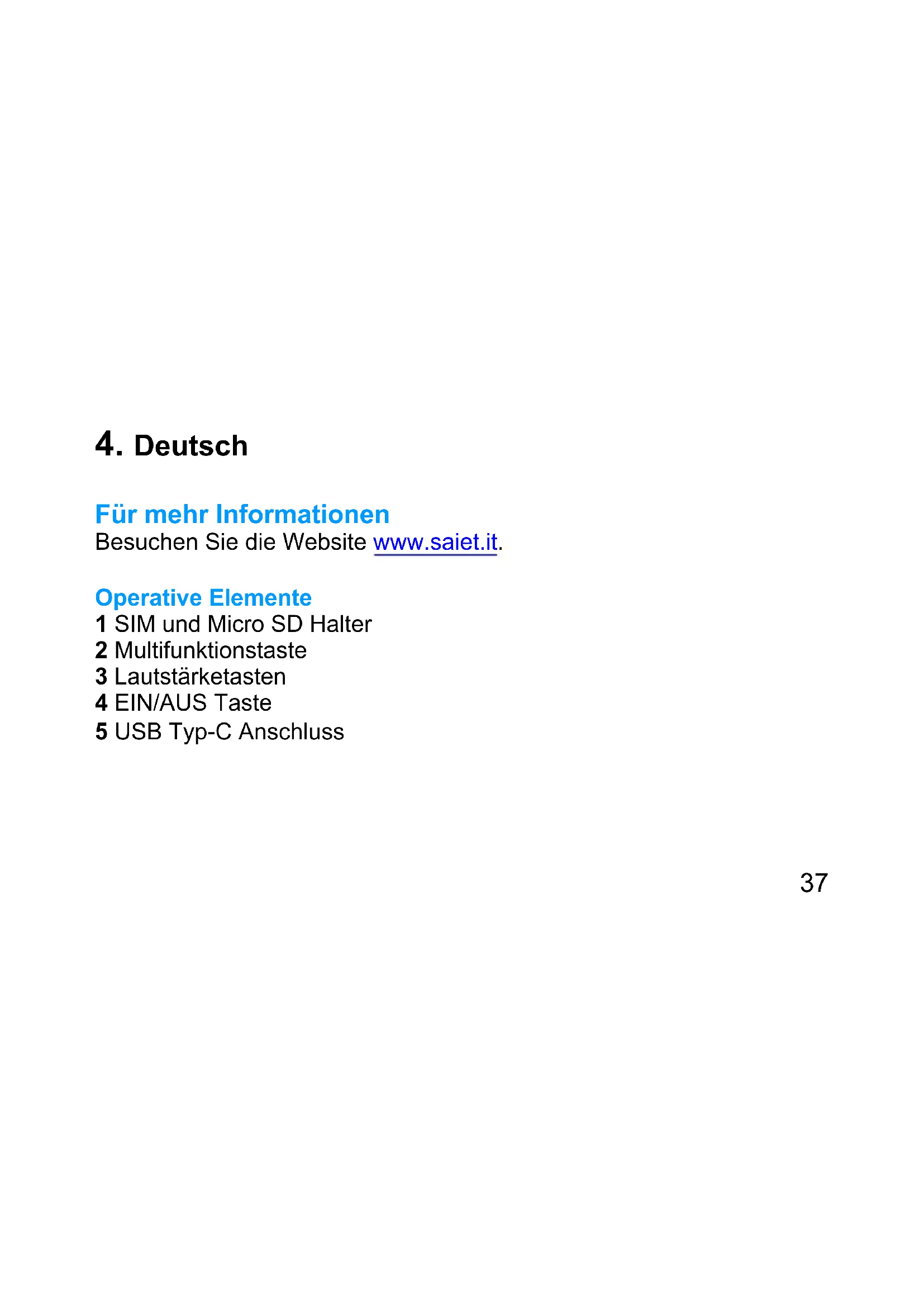 Für mehr Informationen Besuchen Sie die Website www.saiet.it. Operative Elemente 1 SIM und Micro SD Halter 2 Multifunktionstaste 3 Lautstärketasten 4 EIN/AUS Taste 5 USB Typ-C Anschluss 37SIM und Micro SD Schalten Sie das Gerät aus. Entnehmen Sie den SIM-Halter, legen Sie 1 oder 2 Nano-SIM und 1 Micro-SD ein. Einschalten ausschalten das Mobiltelefon Halten Sie die EIN/AUS Taste gedrückt. Schalten Sie den Bildschirm ein und aus Drücken Sie die EIN/AUS Taste. Bildschirm entsperren Berühren Sie den Bildschirm und wischen Sie nach oben. Erzwungener Neustart Wenn das Gerät einfriert und nicht reagiert, halten Sie die EIN/AUS Taste länger als 5 Sekunden gedrückt, um es neu zu starten. Multifunktionstaste Das Telefon verfügt über eine zusätzliche Taste. Wählen Sie die Telefoneinstellungen und “Smart Key“ aus, um sie zu konfigurieren. Benachrichtigungs- und Schnelleinstellungsfeld 38Um Benachrichtigungen zu öffnen, wischen Sie oben links auf dem Bildschirm nach unten, für Schnelleinstellungen wischen Sie oben rechts auf dem Bildschirm nach unten. Batterie Das Telefon verfügt über einen eingebauten Akku. Versuchen Sie nicht, ihn zu öffnen und den Akku auszutauschen, sondern wenden Sie sich an spezialisiertes technisches Kundendienstpersonal. Ladegerät Verwenden Sie das mitgelieferte Ladegerät oder ein 10-W-Ladegerät für maximale Ladegeschwindigkeit. 39Sicherheitsinformationen Lesen Sie die folgenden Warnhinweise, denn deren Nichtbeachtung kann gefährlich oder illegal sein. - Schalten Sie das Telefon aus, wenn seine Verwendung verboten ist oder es zu Störungen und Gefahren führen kann. - Schalten Sie das Telefon in Krankenhäusern und in der Nähe von medizinischen Geräten aus. - Schalten Sie das Telefon im Flugzeug aus. Mobiltelefone können Störungen der Bordinstrumente verursachen. - Benutzen Sie das Mobiltelefon nicht während der Fahrt. Beachten Sie in jedem Fall die geltenden Straßenverkehrsregeln. - Schalten Sie das Telefon beim Tanken in der Nähe von brennbaren oder explosiven Stoffen aus. - Halten Sie einen Mindestabstand von 15 cm zwischen Mobiltelefon und Herzschrittmacher ein, um mögliche Störungen des Herzschrittmachers zu vermeiden. Tragen Sie das Mobiltelefon nicht in einer Brusttasche.