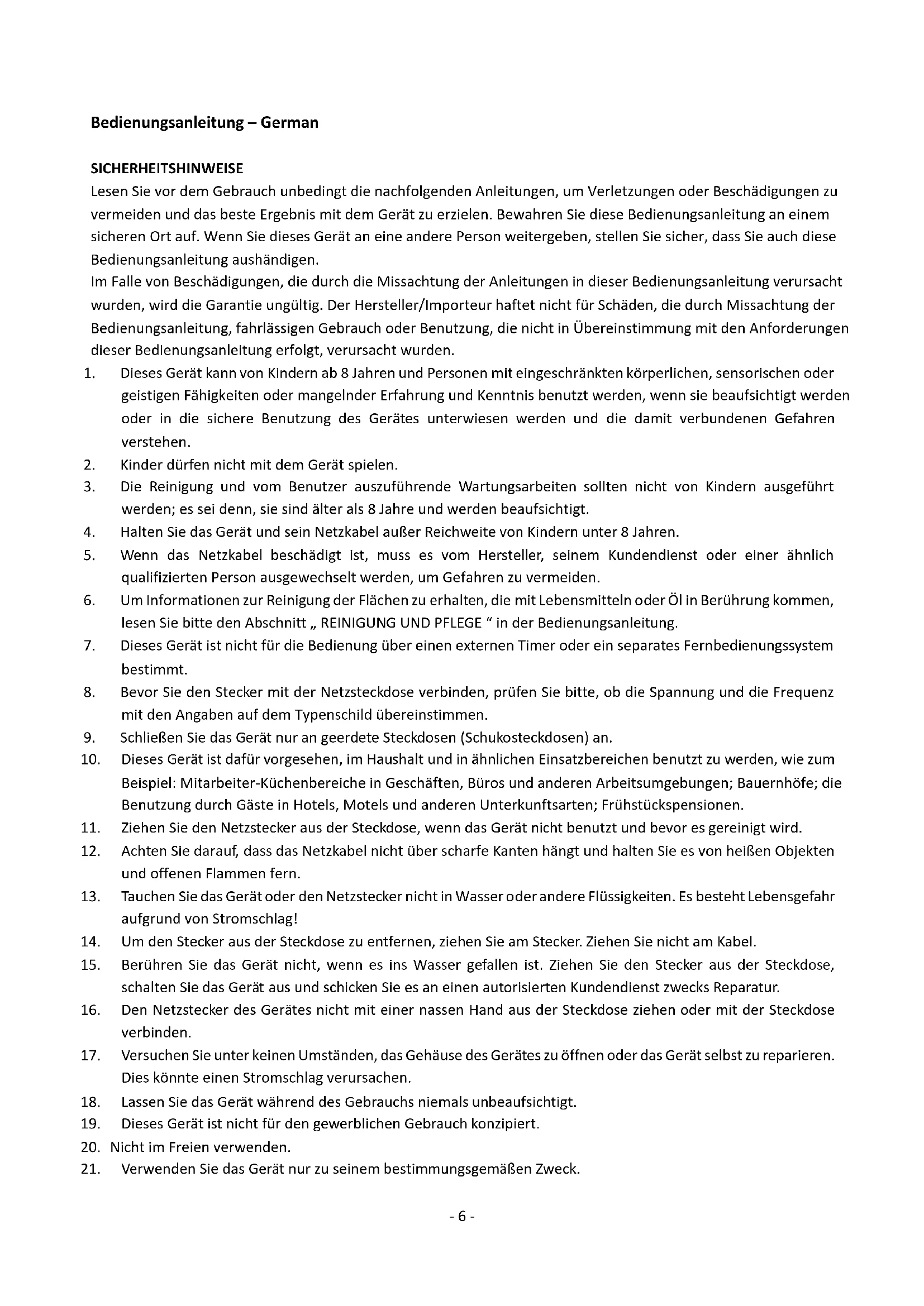 Bedienungsanleitung – German SICHERHEITSHINWEISE Lesen Sie vor dem Gebrauch unbedingt die nachfolgenden Anleitungen, um Verletzungen oder Beschädigungen zu vermeiden und das beste Ergebnis mit dem Gerät zu erzielen. Bewahren Sie diese Bedienungsanleitung an einem sicheren Ort auf. Wenn Sie dieses Gerät an eine andere Person weitergeben, stellen Sie sicher, dass Sie auch diese Bedienungsanleitung aushändigen. Im Falle von Beschädigungen, die durch die Missachtung der Anleitungen in dieser Bedienungsanleitung verursacht wurden, wird die Garantie ungültig. Der Hersteller/Importeur haftet nicht für Schäden, die durch Missachtung der Bedienungsanleitung, fahrlässigen Gebrauch oder Benutzung, die nicht in Übereinstimmung mit den Anforderungen dieser Bedienungsanleitung erfolgt, verursacht wurden.