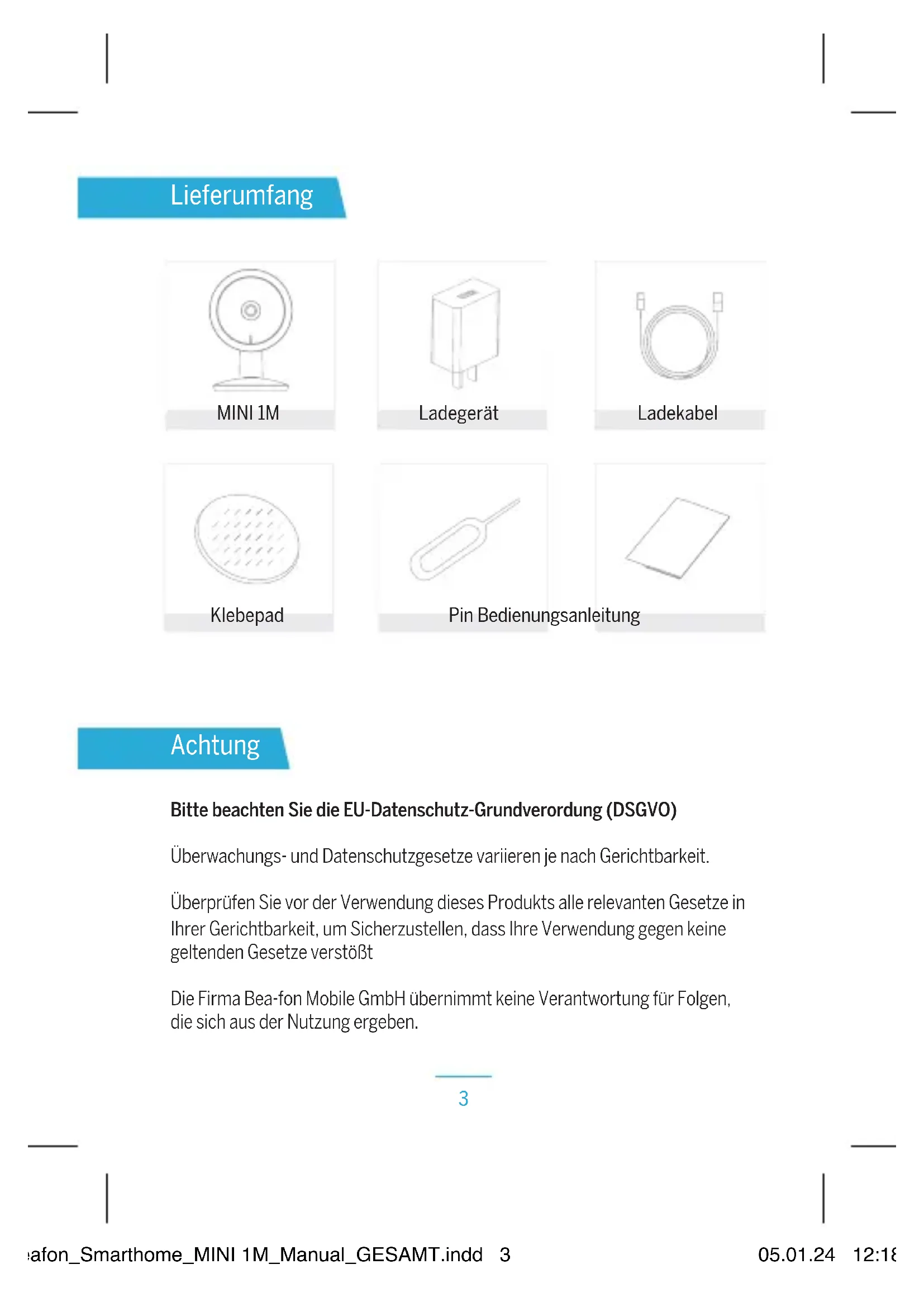 Smart H me MINI1M Deutsch S. 2-17 English P. 18-32 Español P. 33-47 Italiano P. 48-62 Français P. 63-77 Dutch P. 78-92 beafon_Smarthome_MINI 1M_Manual_GESAMT.indd 1beafon_Smarthome_MINI 1M_Manual_GESAMT.indd 1 05.01.24 12:1805.01.24 12:18Smart H me MINI1M Bedienungsanleitung beafon_Smarthome_MINI 1M_Manual_GESAMT.indd 2beafon_Smarthome_MINI 1M_Manual_GESAMT.indd 2 05.01.24 12:1805.01.24 12:183 Lieferumfang Achtung MINI 1M Klebepad Ladegerät Pin Bedienungsanleitung Ladekabel Bitte beachten Sie die EU-Datenschutz-Grundverordung (DSGVO) Überwachungs- und Datenschutzgesetze variieren je nach Gerichtbarkeit. Überprüfen Sie vor der Verwendung dieses Produkts alle relevanten Gesetze in Ihrer Gerichtbarkeit, um Sicherzustellen, dass Ihre Verwendung gegen keine geltenden Gesetze verstößt Die Firma Bea-fon Mobile GmbH übernimmt keine Verantwortung für Folgen, die sich aus der Nutzung ergeben. beafon_Smarthome_MINI 1M_Manual_GESAMT.indd 3beafon_Smarthome_MINI 1M_Manual_GESAMT.indd 3 05.01.24 12:1805.01.24 12:184 Beschreibung Strom/Eingang DC 5V +- 10% Status light • Durchgehend rotes Licht: Die Kamera ist nicht mit dem Netzwerk (WiFi) verbunden.