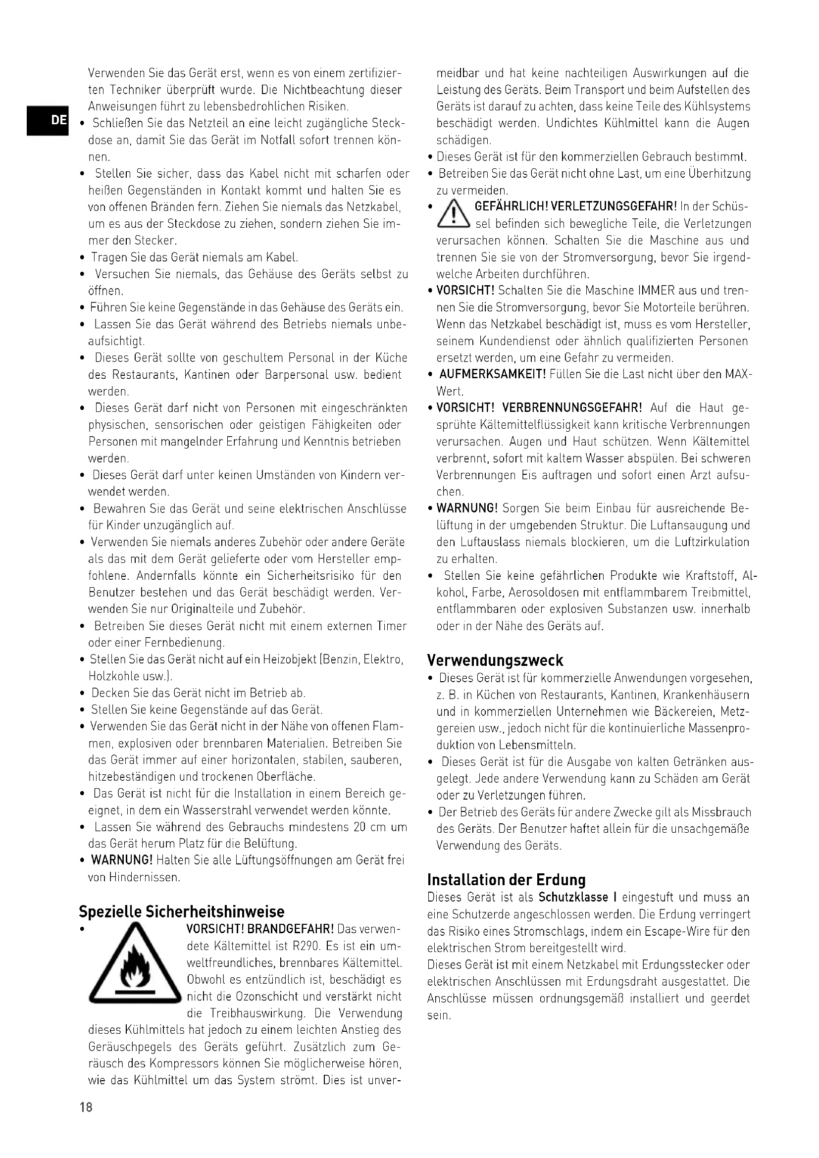 - VORSICHT! BRANDGEFAHR! Das verwen- dete Kältemittel ist R290. Es ist ein um- weltfreundliches, brennbares Kältemittel. Obwohl es entzündlich ist, beschädigt es nicht die Ozonschicht und verstärkt nicht die Treibhauswirkung. Die Verwendung dieses Kühlmittels hat jedoch zu einem leichten Anstieg des Geräuschpegels des Geräts geführt. Zusätzlich zum Ge- räusch des Kompressors können Sie möglicherweise hören, wie das Kühlmittel um das System strömt. Dies ist unver- meidbar und hat keine nachteiligen Auswirkungen auf die Leistung des Geräts. Beim Transport und beim Aufstellen des Geräts ist darauf zu achten, dass keine Teile des Kühlsystems beschädigt werden. Undichtes Kühlmittel kann die Augen schädigen.